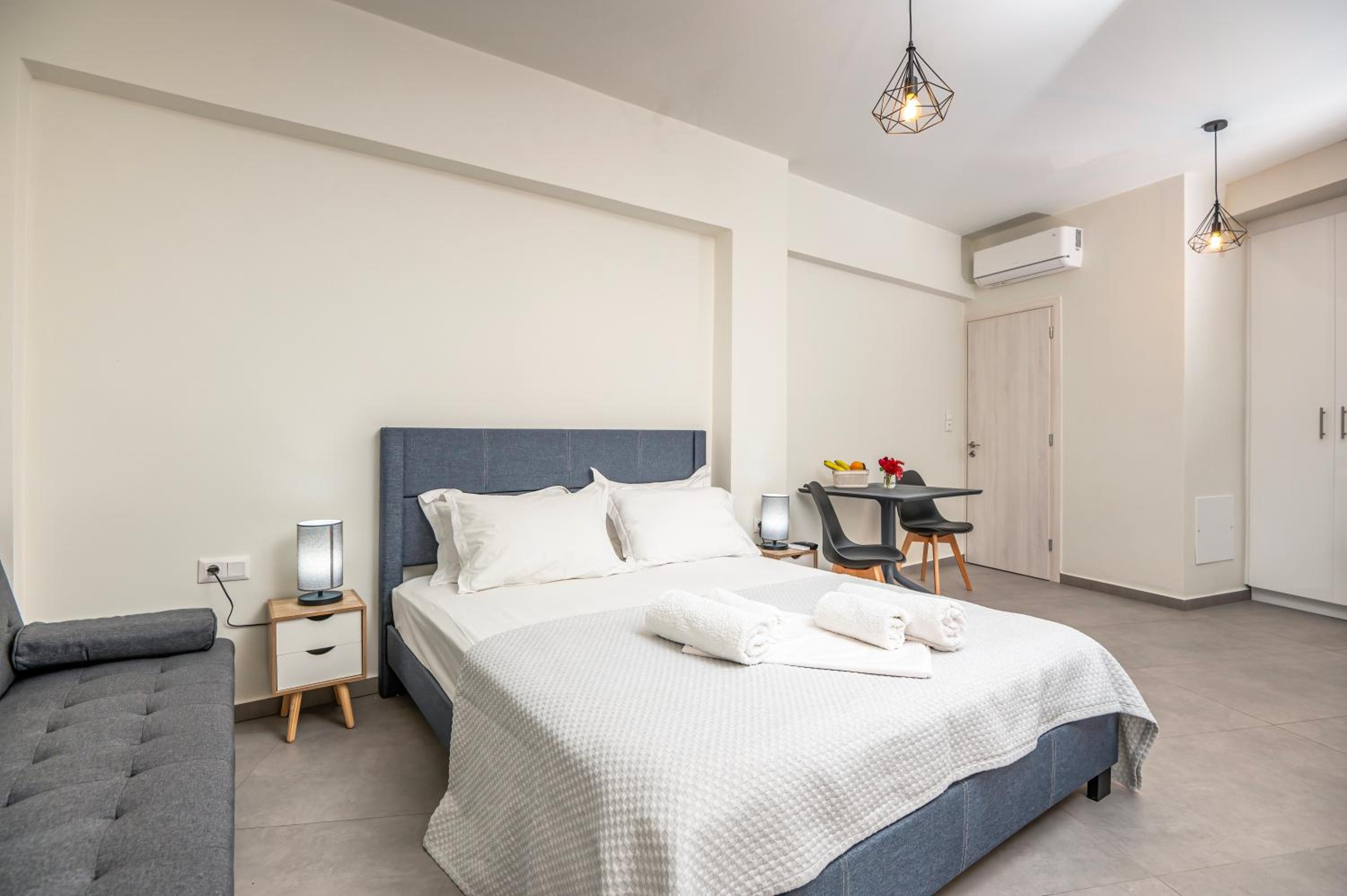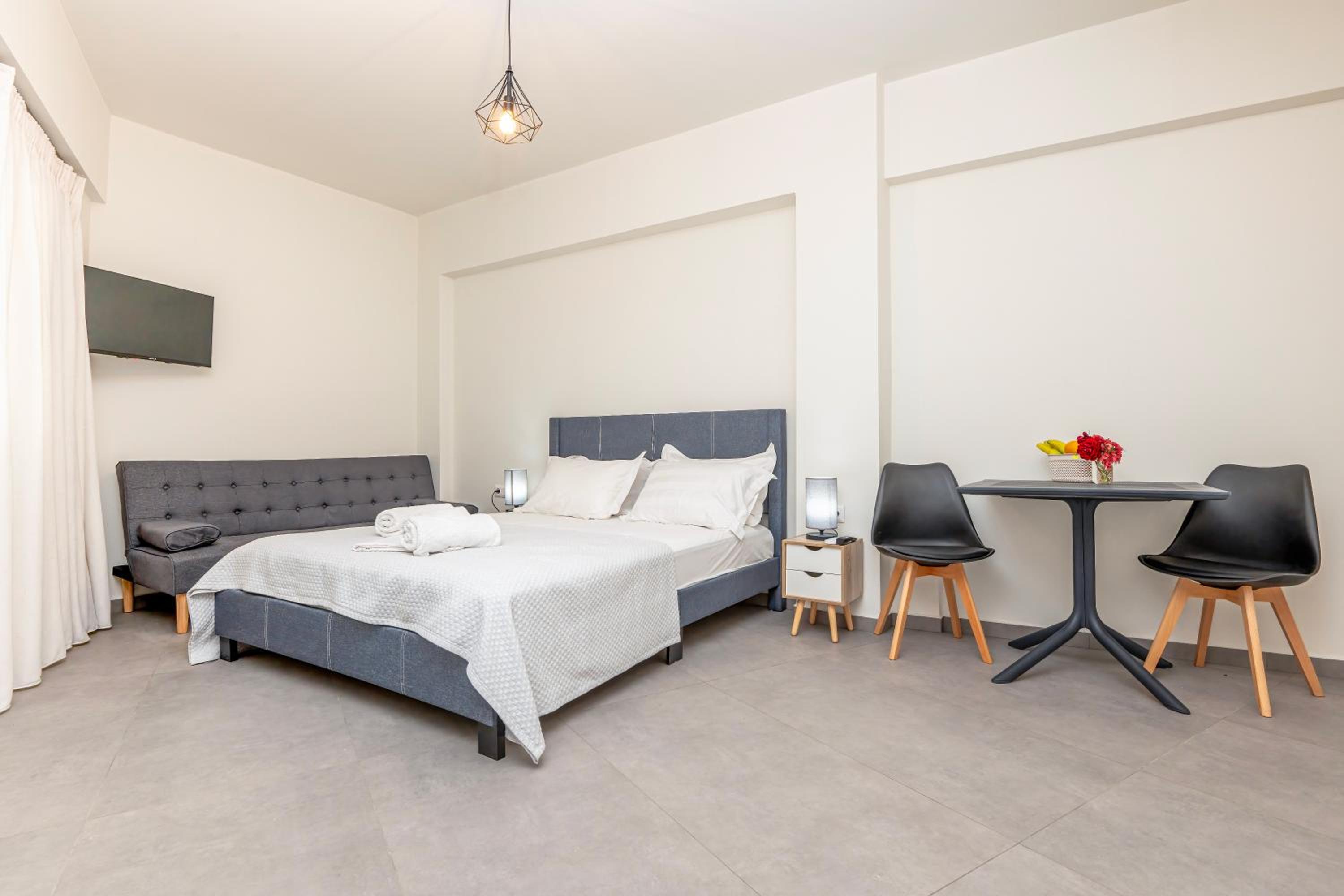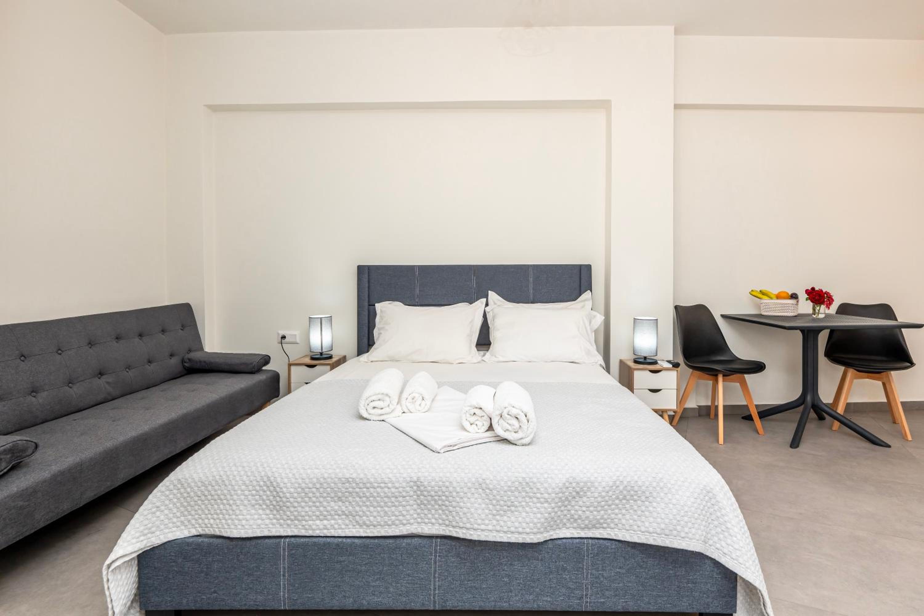 Το studio που μείναμε εμείς (με τον καναπέ κρεββάτι και το διπλό),ήταν πολύ καθαρό και περιποιημένο.Η τοποθεσία ήταν πολύ καλή, πολύ κοντά και στο σούπερ και σε καφέ.