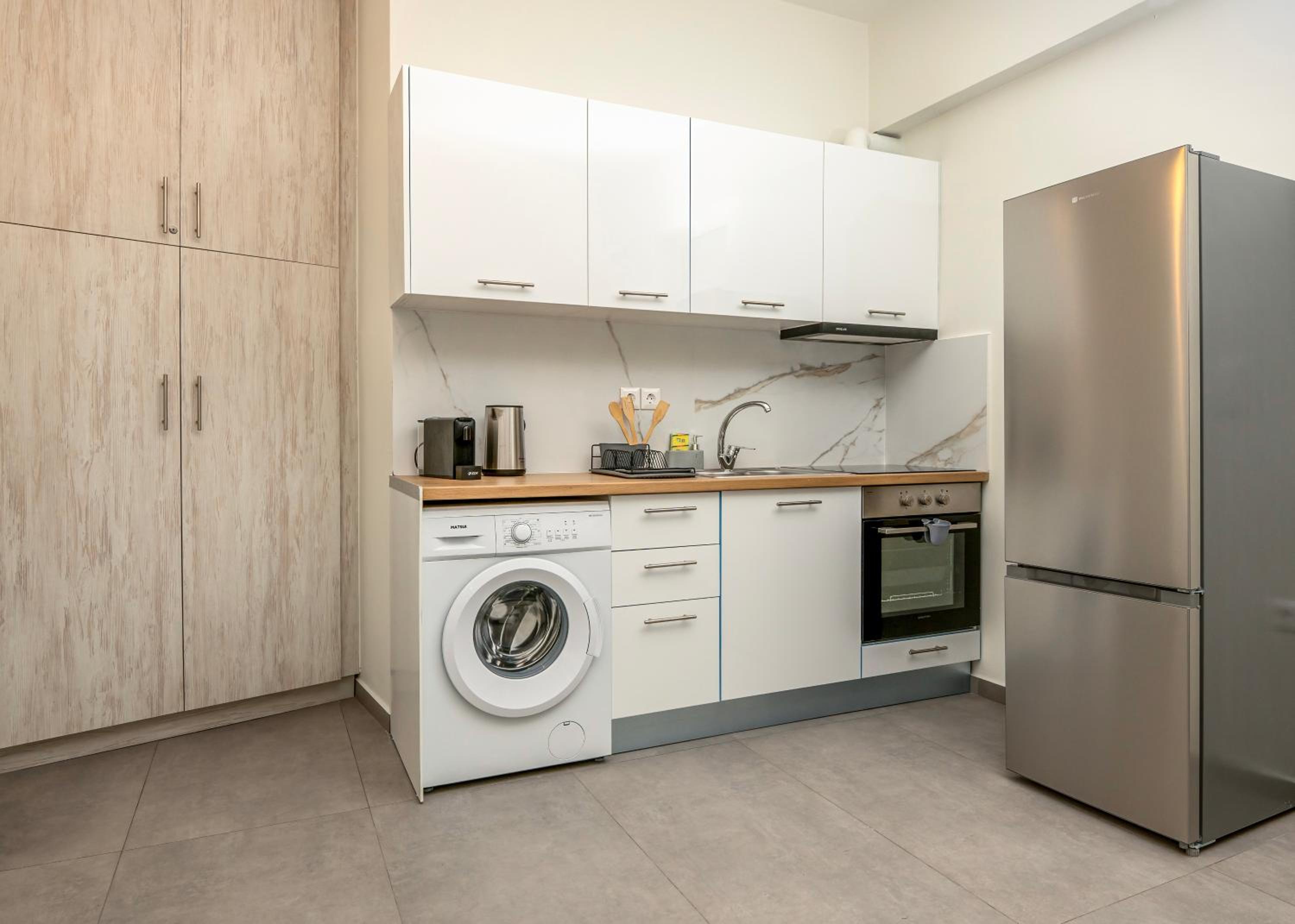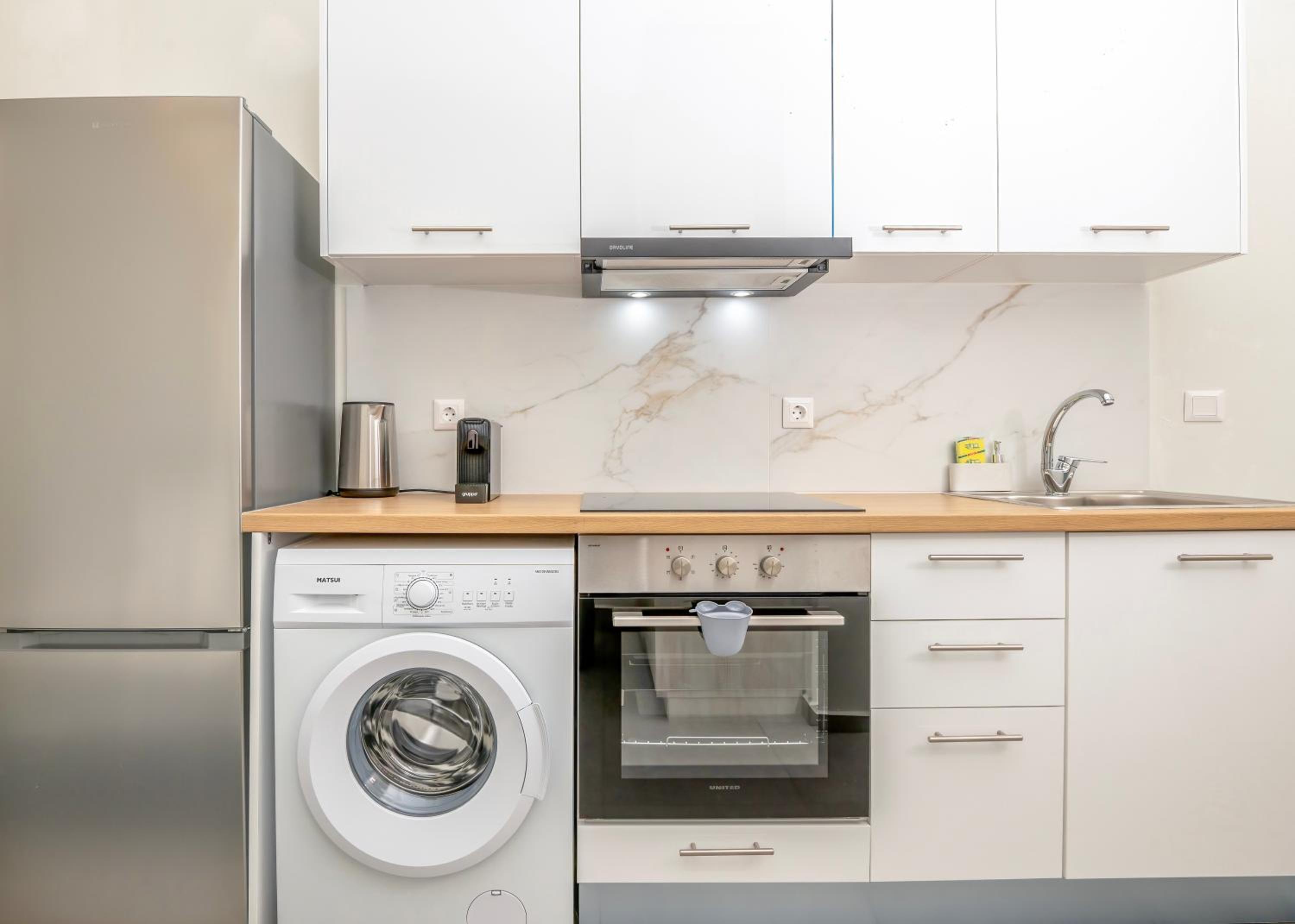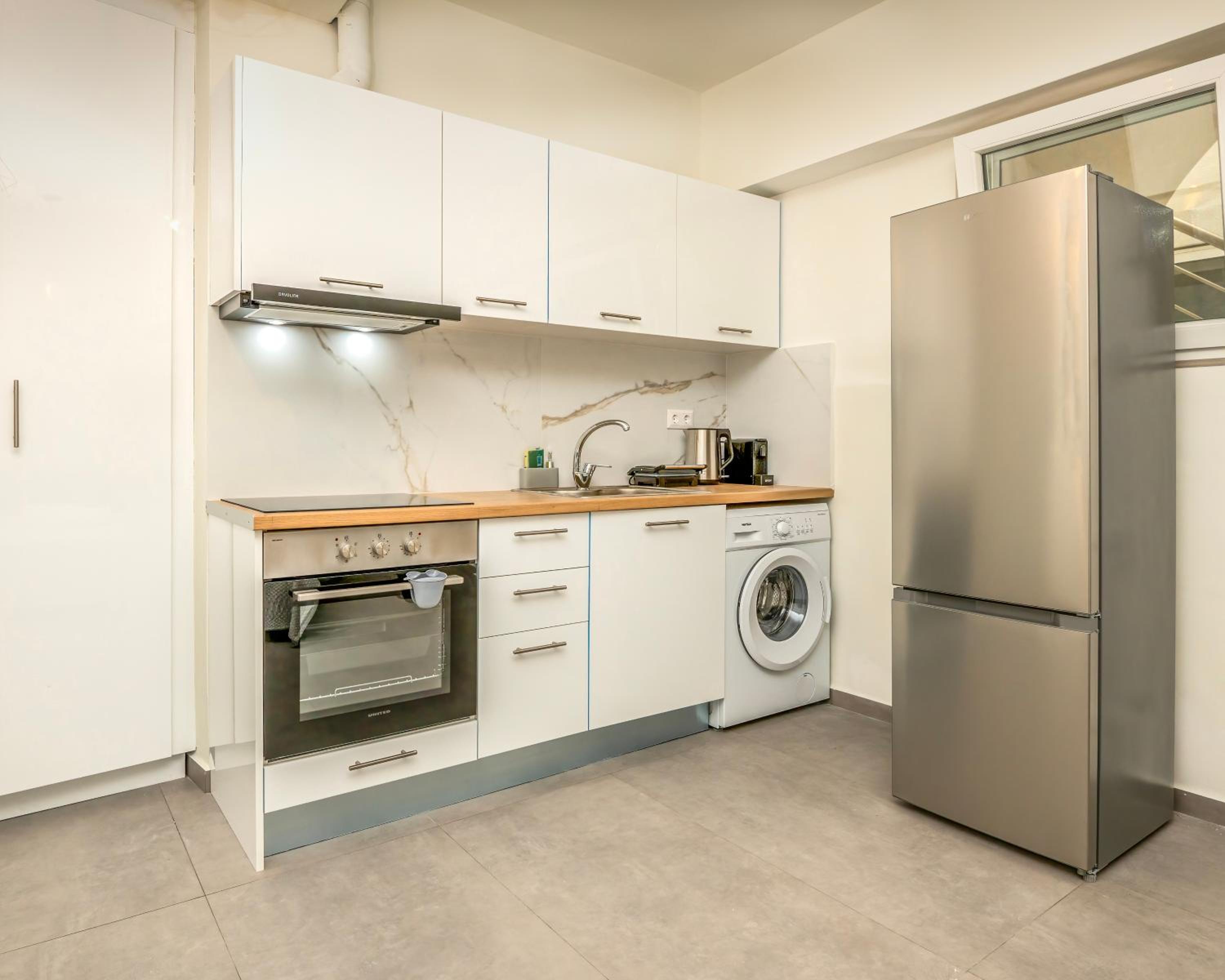Each unit boasts a modern kitchen complete with a refrigerator, oven, stovetop, and coffee machine, perfect for creating culinary delights. Enjoy meals at your dining table or savor a coffee on your private balcony.