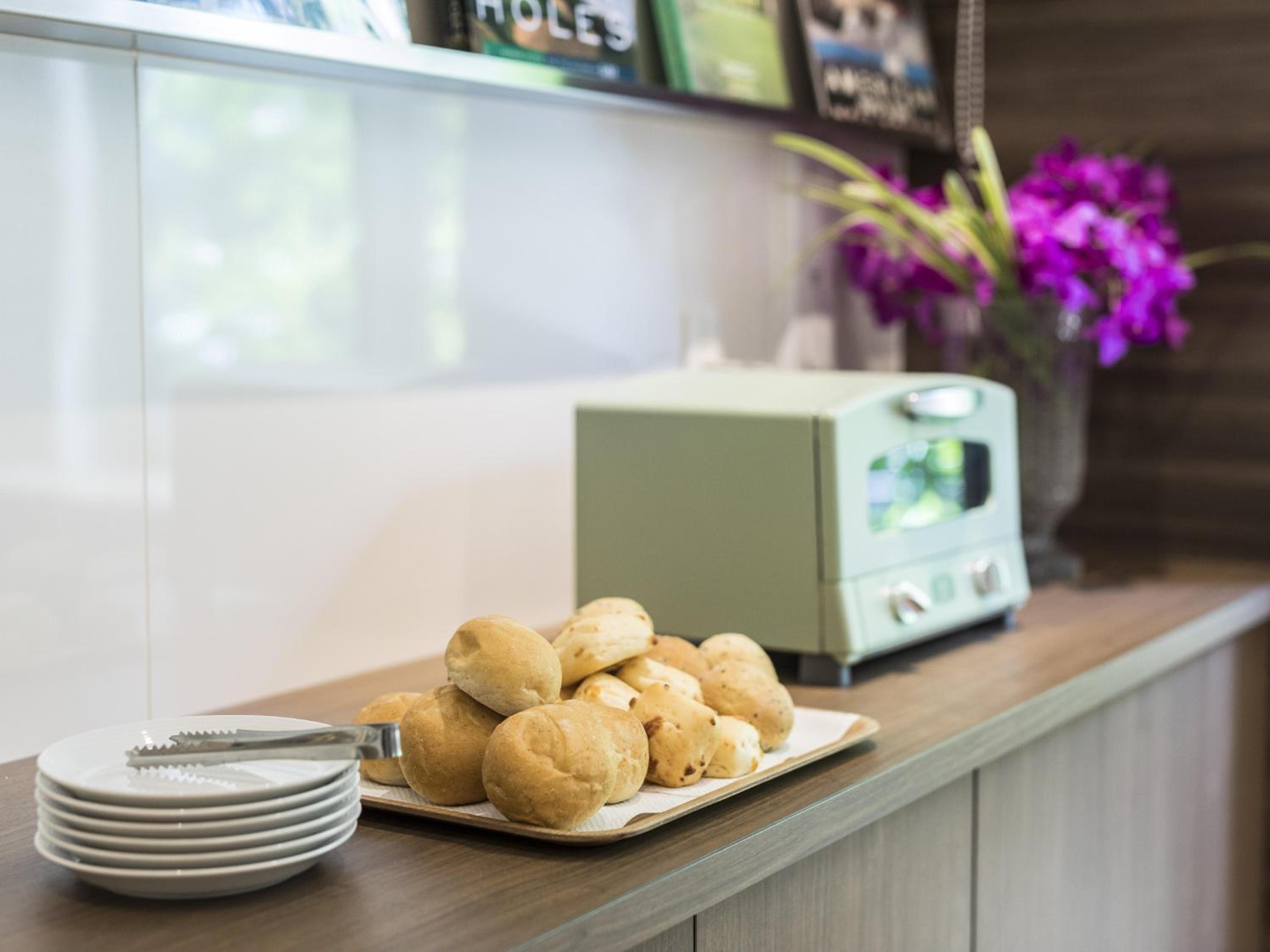 早餐是很多小麵包,搭配咖啡和果汁。乾淨衛生也很方便。