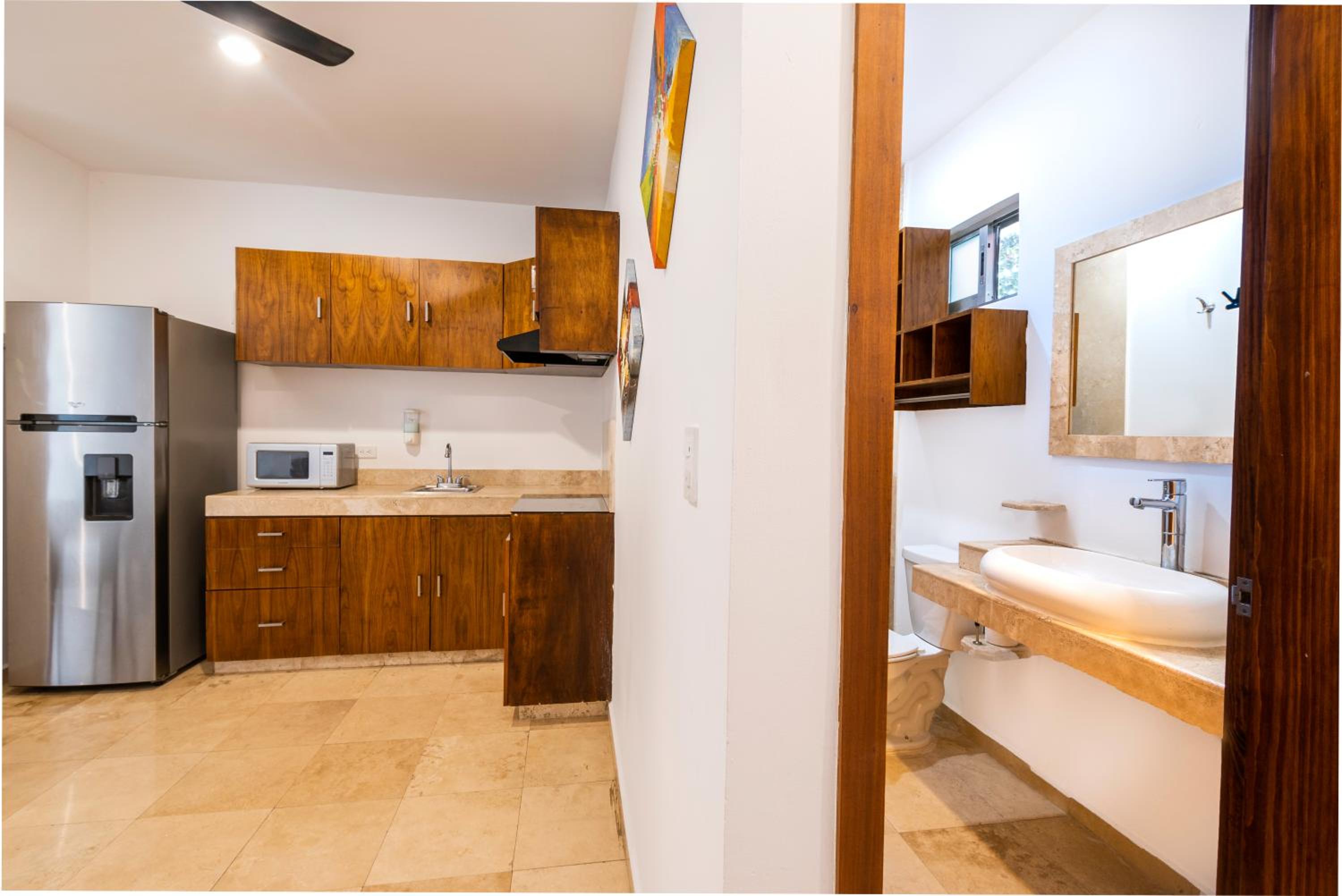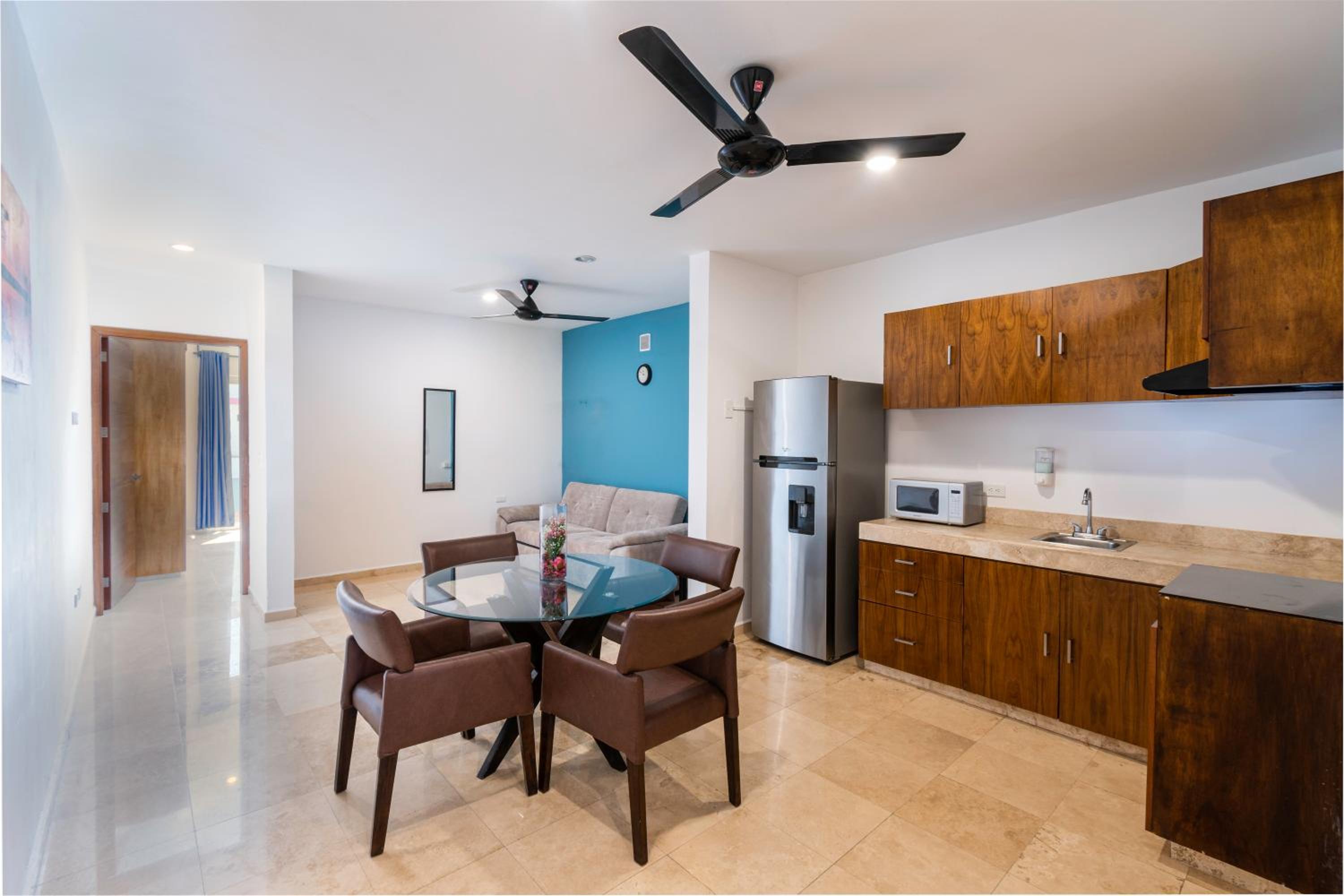 Det låg nära 5th av. Men tillräckligt långt bort för att slippa allt oljud. ADO buss låg precis bredvid. Sovrum och vardagsrum med kök så stort. Pool. Det fanns 2st tvättlinor att hänga tvätt på.