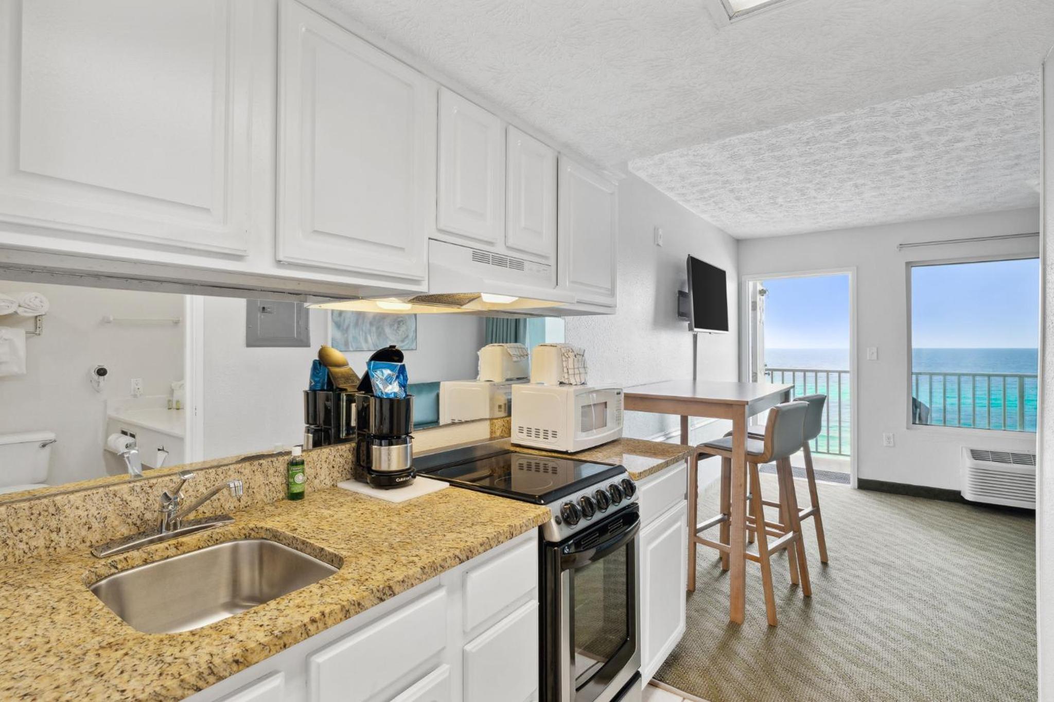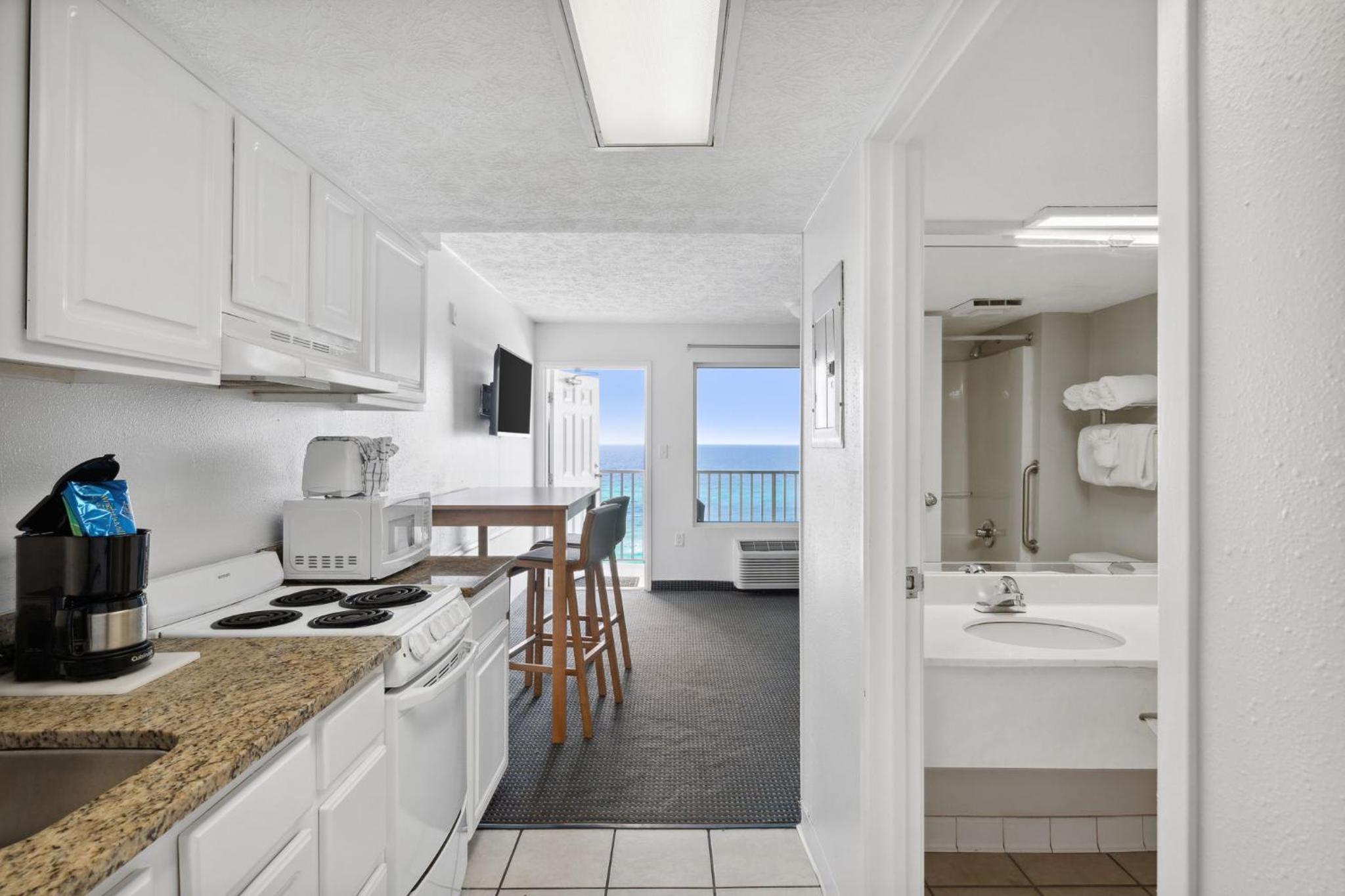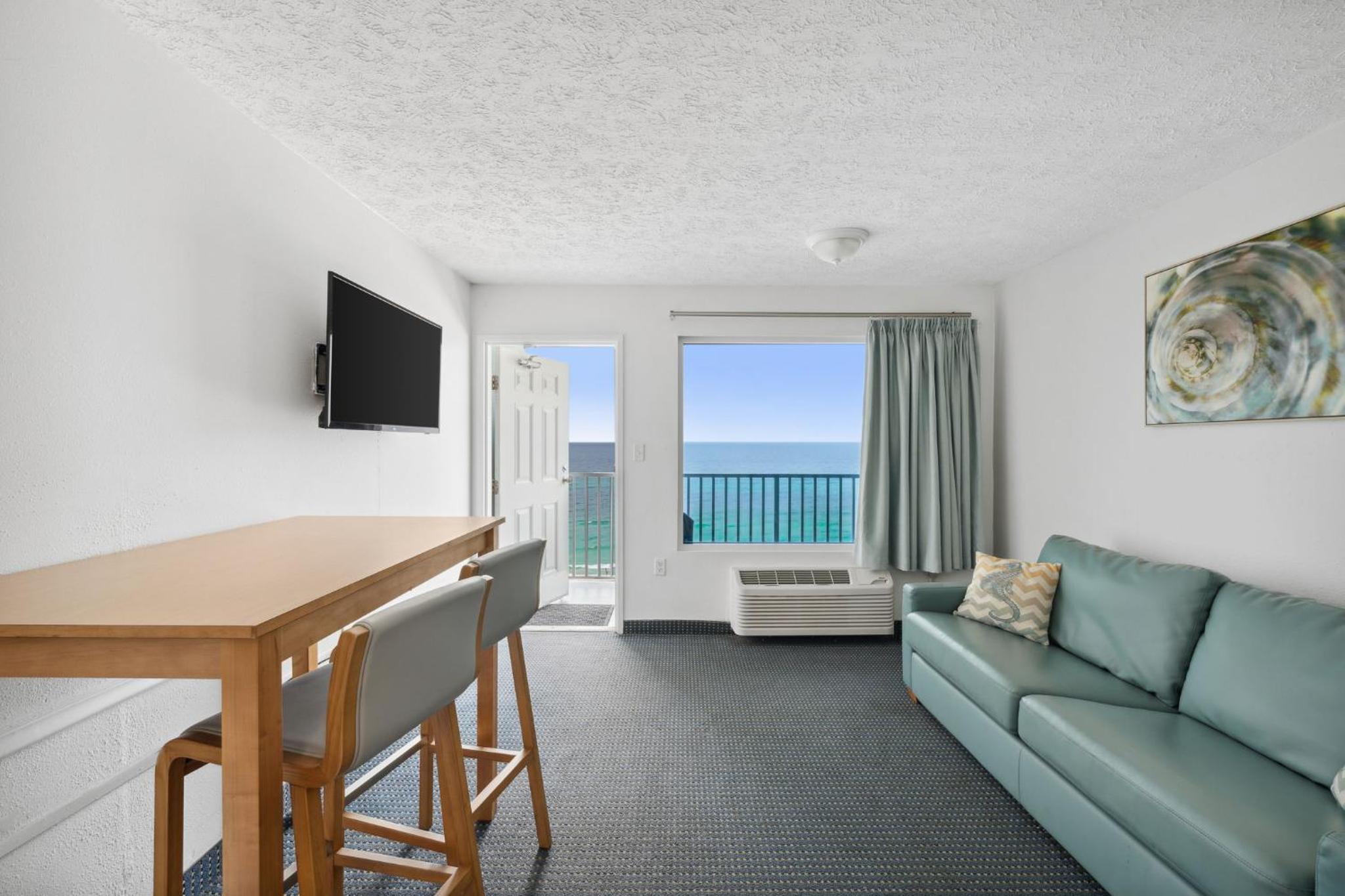Experience stunning Gulf of Mexico views from your private balcony at Beachcomber by the Sea. Each suite is equipped with a kitchen, cable TV, and cozy seating area, providing the perfect blend of comfort and convenience.