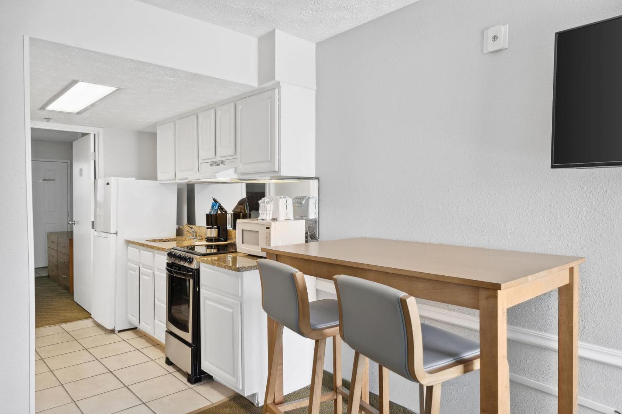 Prime location, comfortable, clean rooms. Our room had stove, oven, full-size refrigerator and microwave.