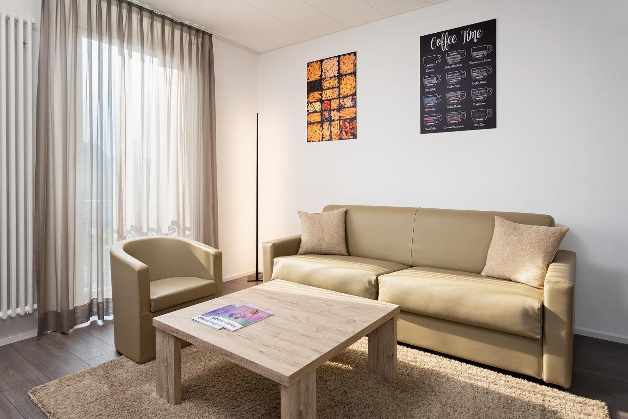 Kaffeemaschine im Zimmer, im Aufenthaltsraum Zugang zu Kaffee, Tee, Wasser.