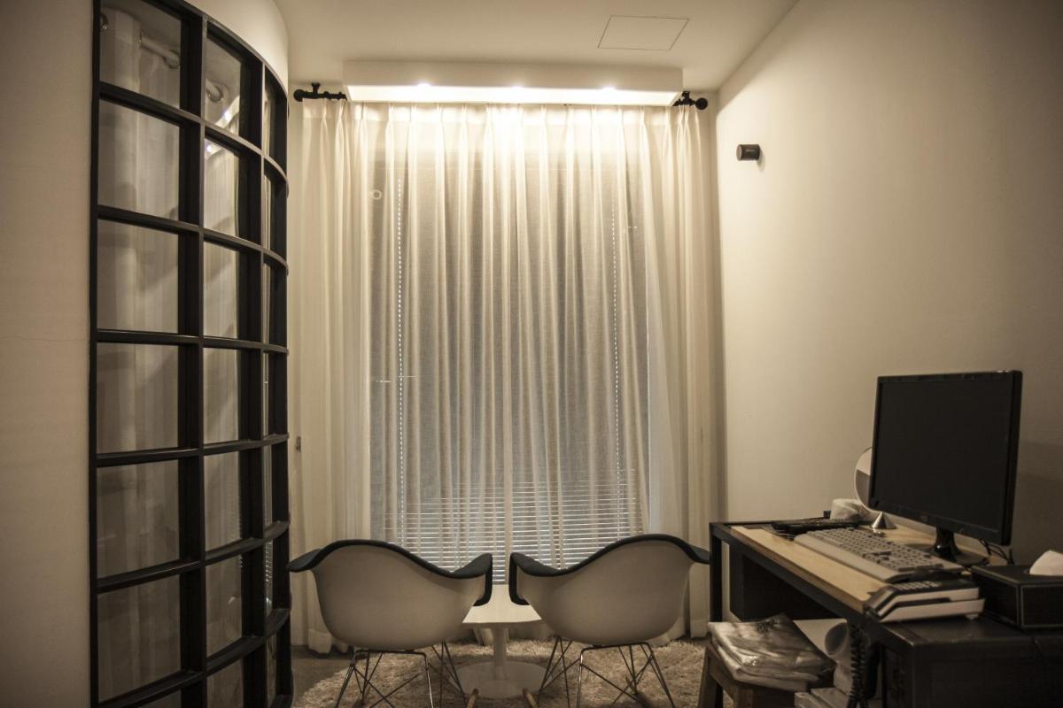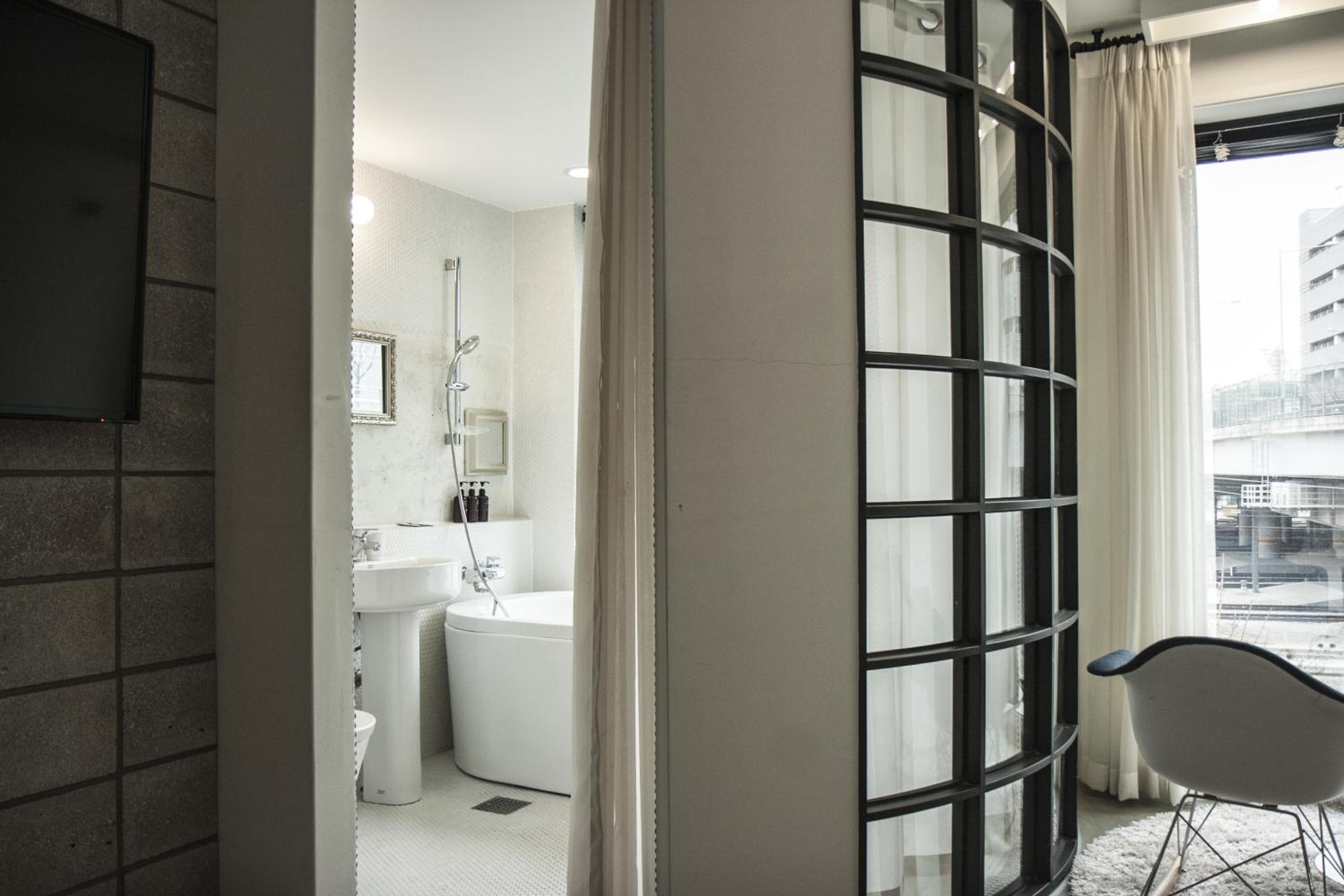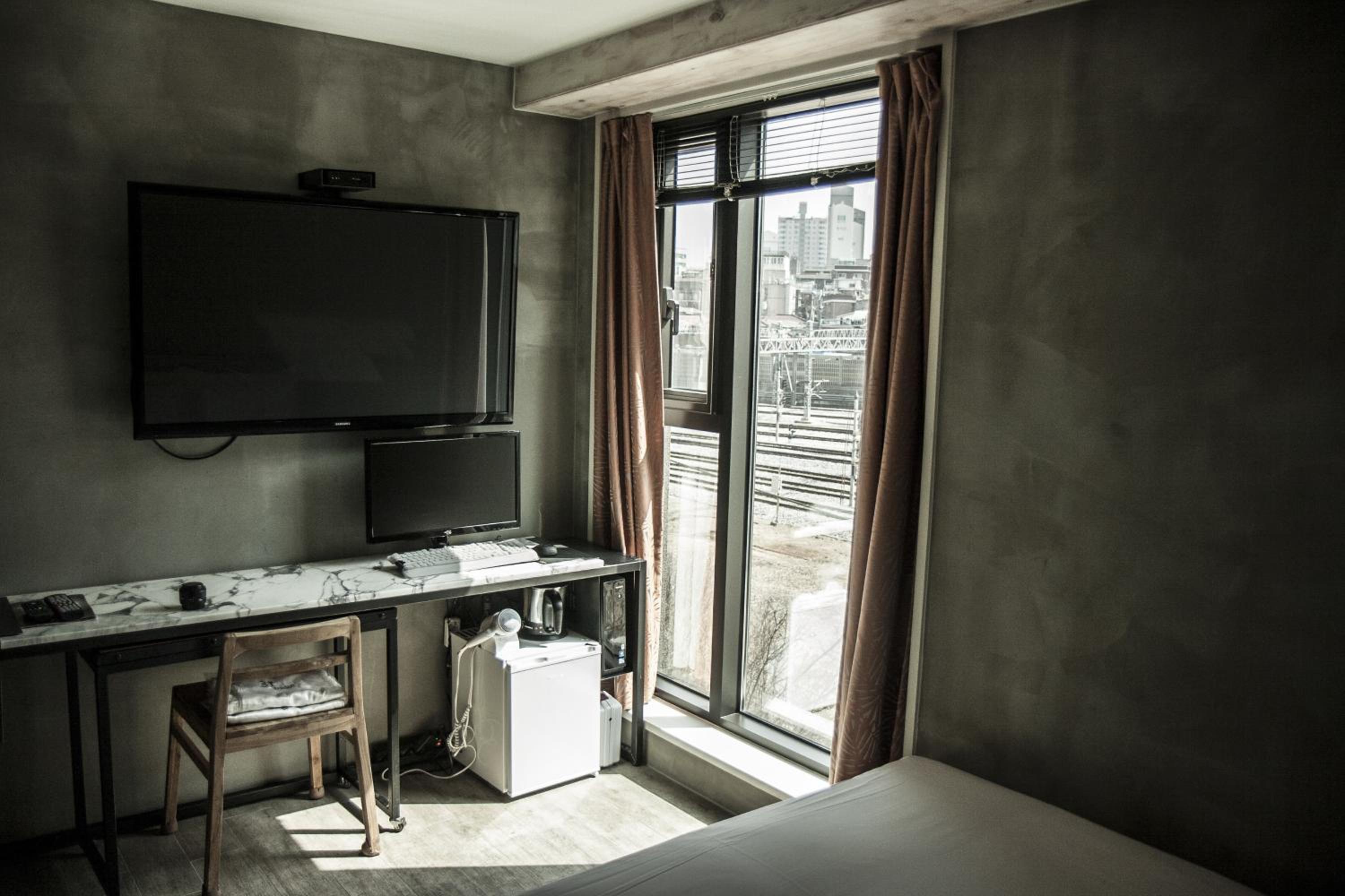 Although is not really big, it's big enough to be confortable and has a small desk and a table. Bathtub is nice and cute, but water goes out easily, so prepare to see your floor wet. We could check-in earlier cause room was empty. You have bags of coffee as courtesy. Metro line 1 is near so it's like 15-20mins to center Seul. It's next to a train station but I didn't feel too noisy