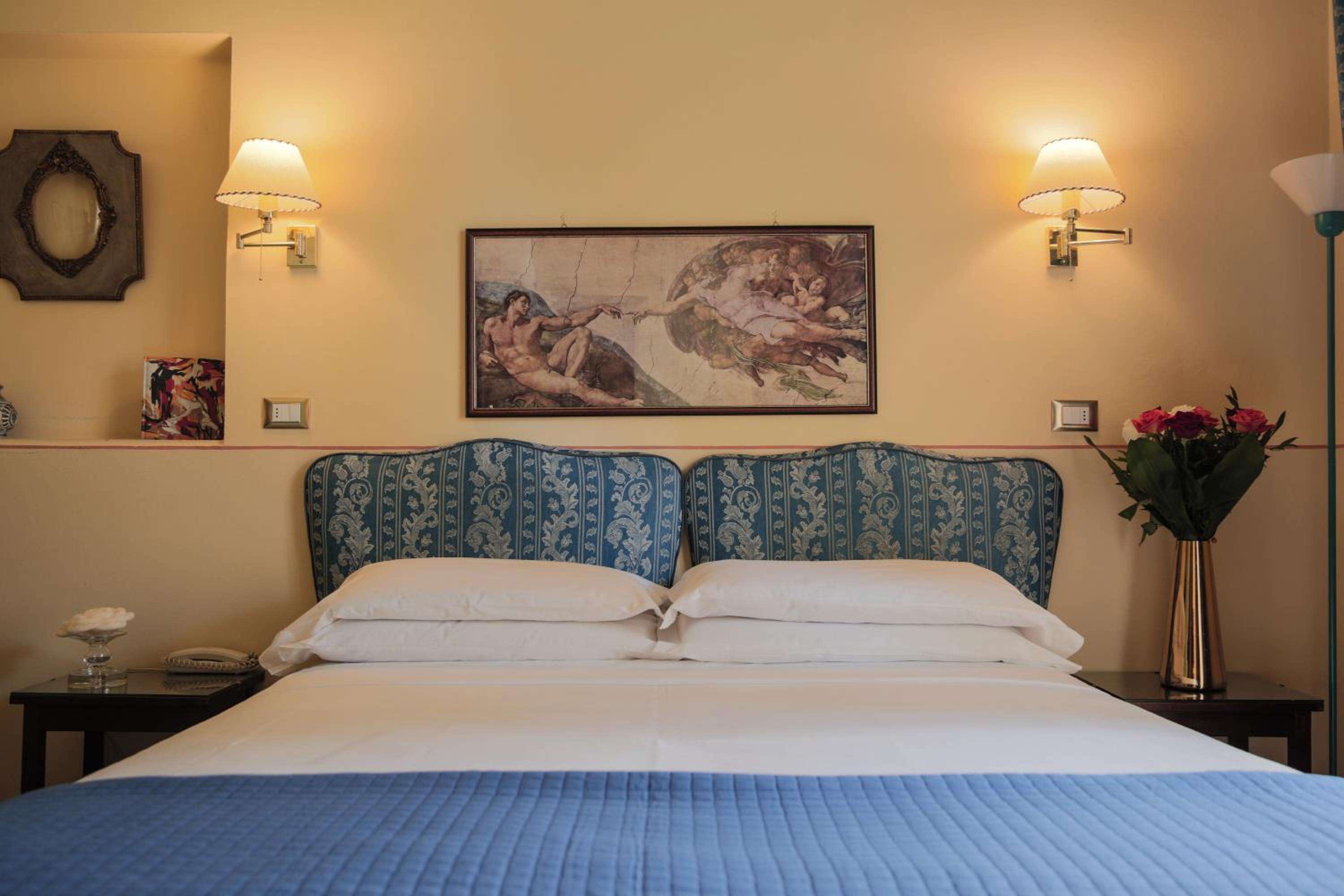 Each spacious bedroom at Villa Liana boasts antique furniture, luxurious textiles, and modern amenities such as air conditioning, flat-screen TVs, and private bathrooms. Some rooms even feature stunning frescoed ceilings for a touch of historic elegance.