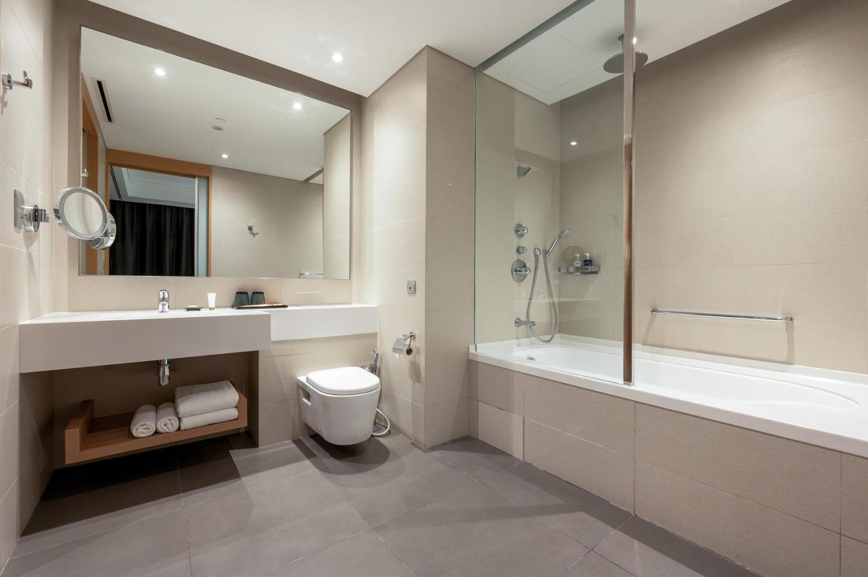 Guests can unwind at the outdoor swimming pool or stay active at the 24-hour gym. The steam and sauna facilities offer a tranquil retreat, while the 24-hour launderette and laundry services cater to all needs. The multilingual staff adds a personalized touch to your experience.