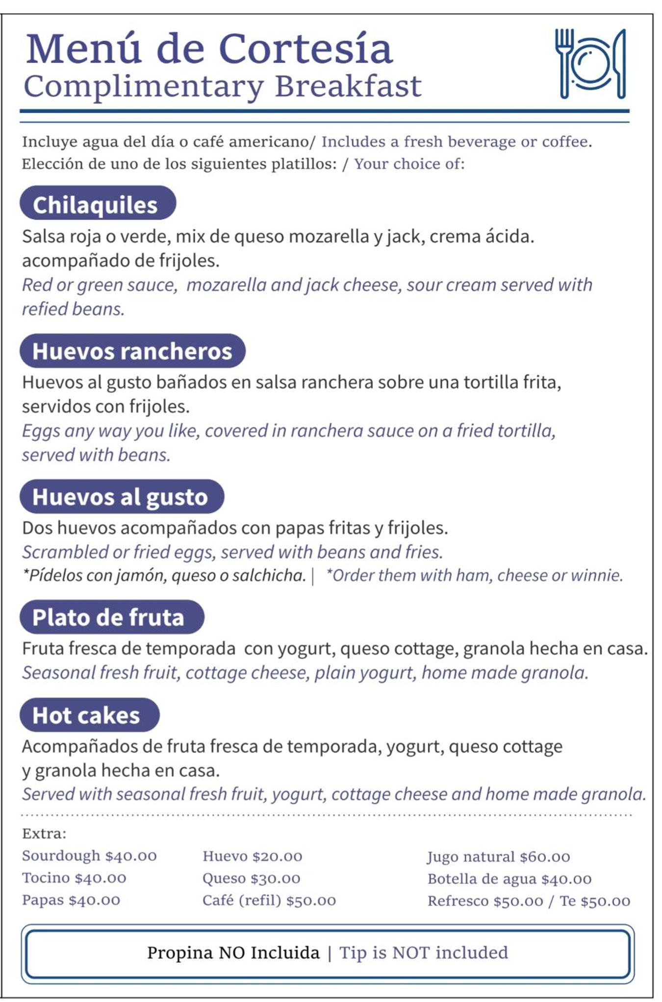 Je crois qu'il pourrait charger 100 pesos de plus par jour et que nous ayons accès à l'ensemble du menu déjeuner au restaurant. Le menu offert par l'hôtel n'Est définitivement pas aussi bon que celui à la carte du restaurant.