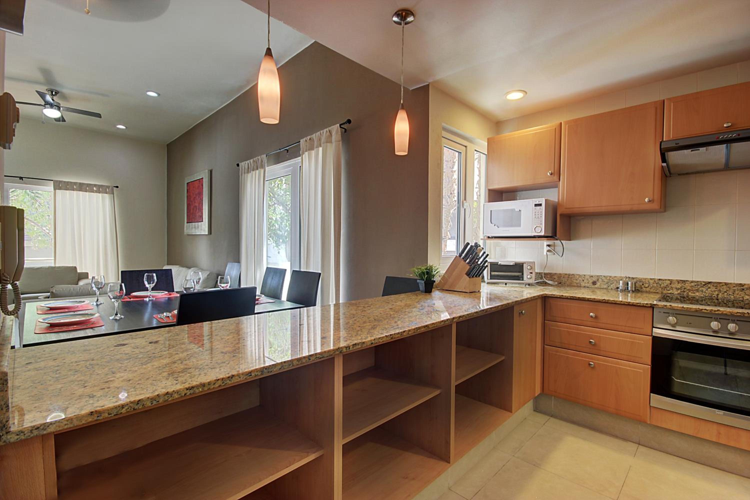 Luxurious Apartments with Fully Equipped Kitchens: Enjoy the convenience of fully furnished 2 and 3-bedroom apartments with fully equipped kitchens, including dinnerware and cooking utensils for a comfortable stay.