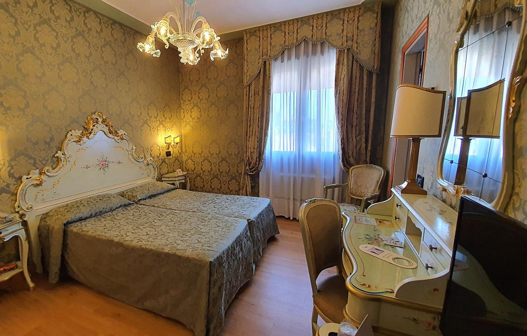Hotel Carlton offers spacious, Venetian-style rooms with elegant interior design, Murano glass lamps, and antique furniture. Each room is air-conditioned and equipped with modern amenities for a comfortable stay.