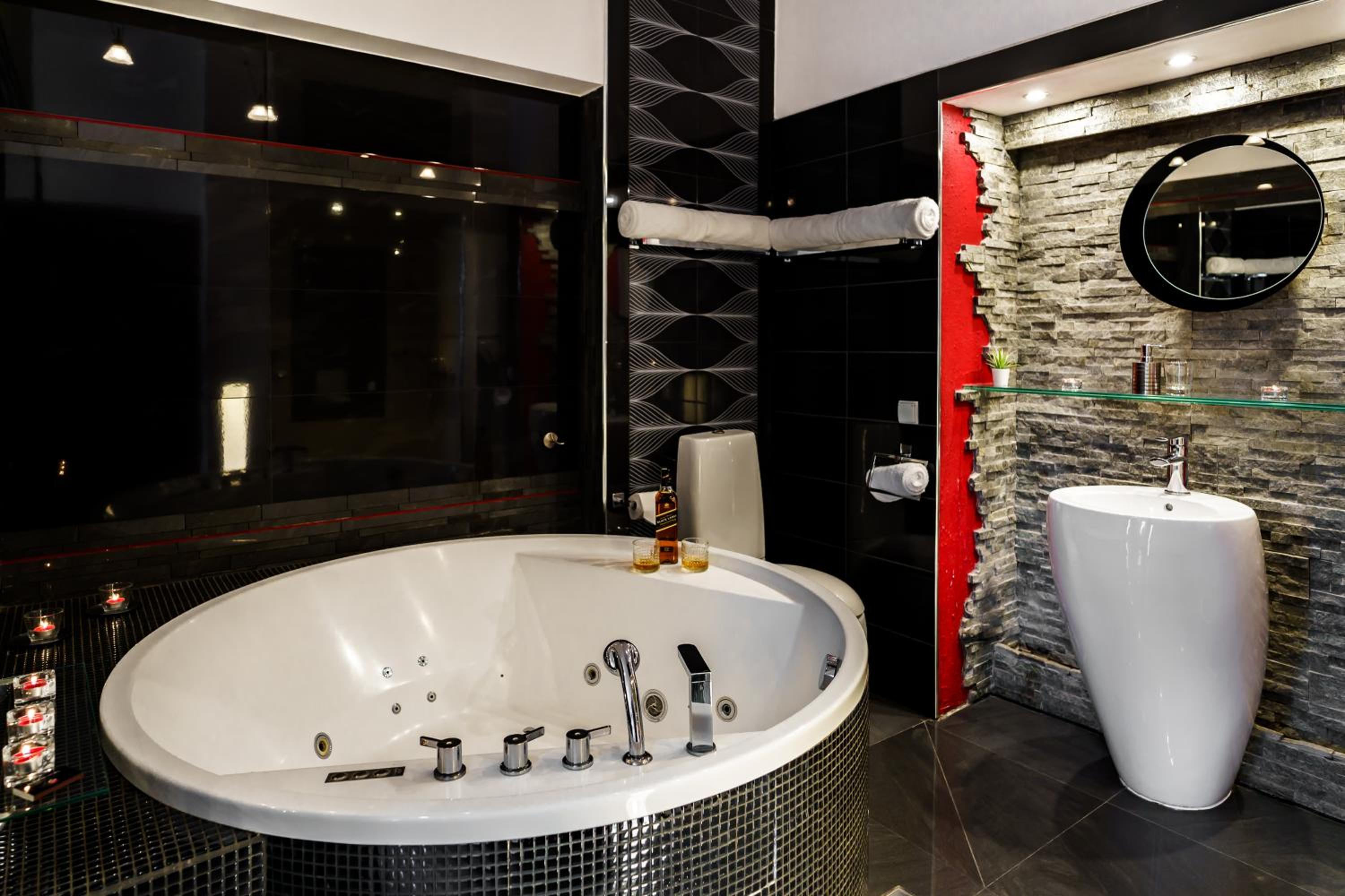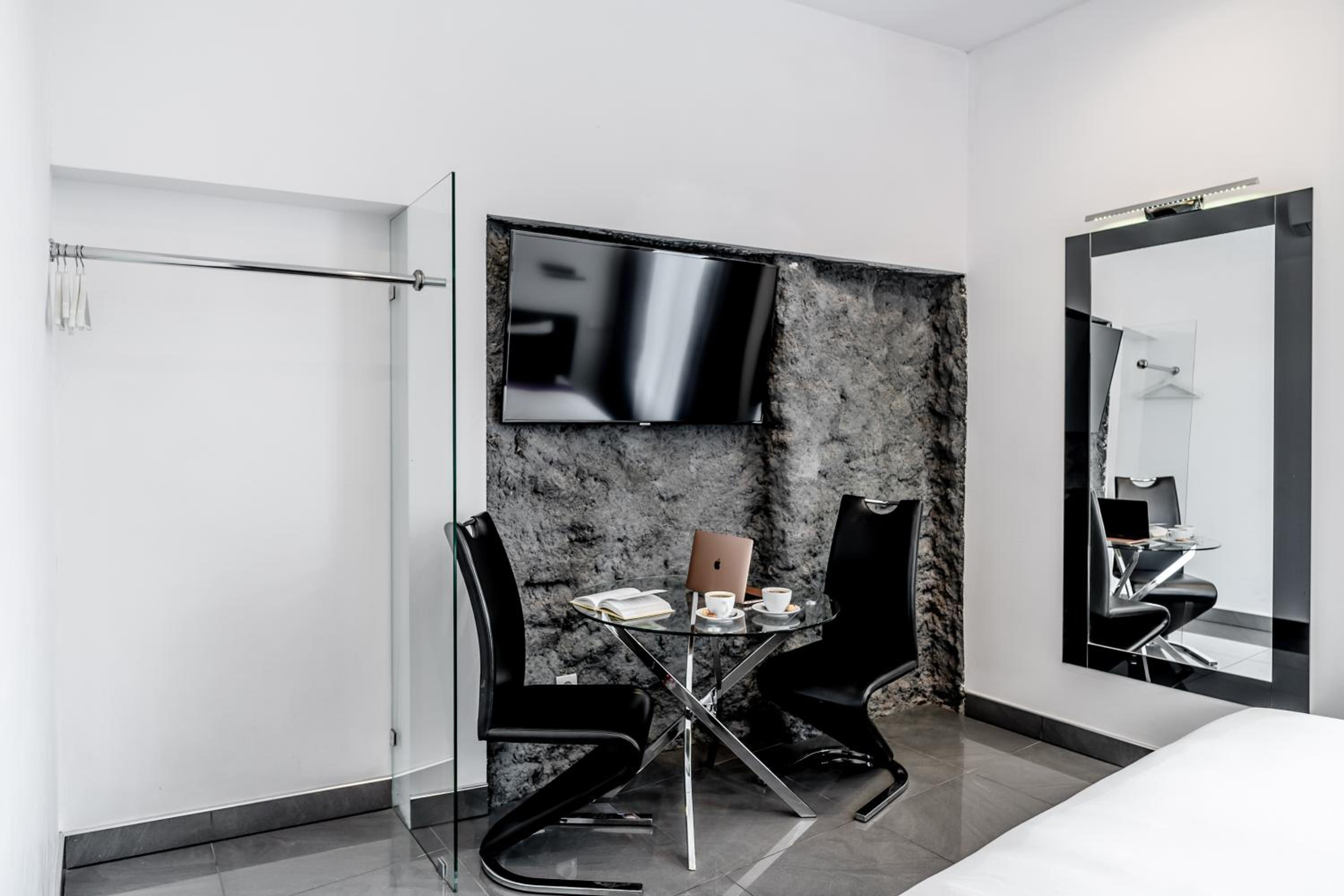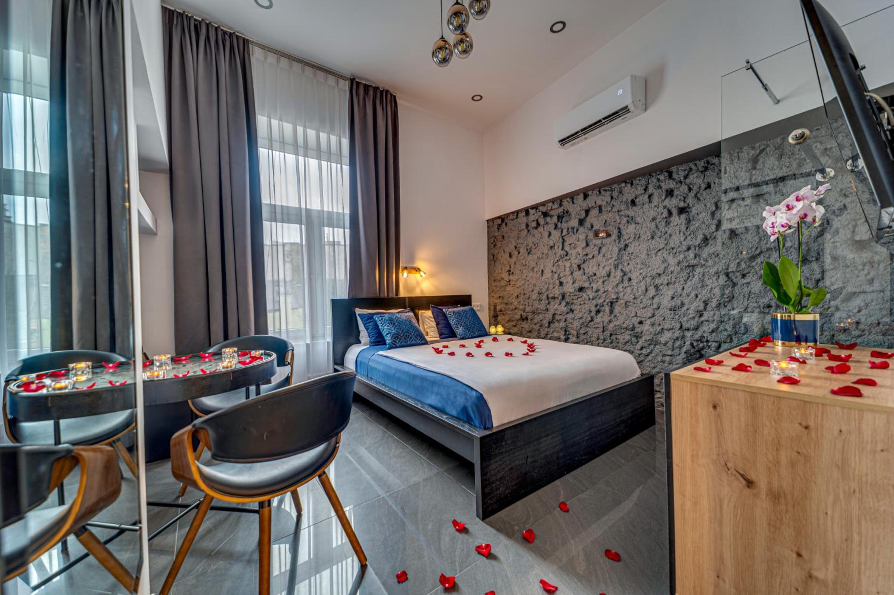 Art Deco Style Rooms: Experience luxury in every detail with spa baths, air conditioning, and free Wi-Fi in our elegantly furnished rooms featuring heated stone floors and 40-inch LCD TVs.
