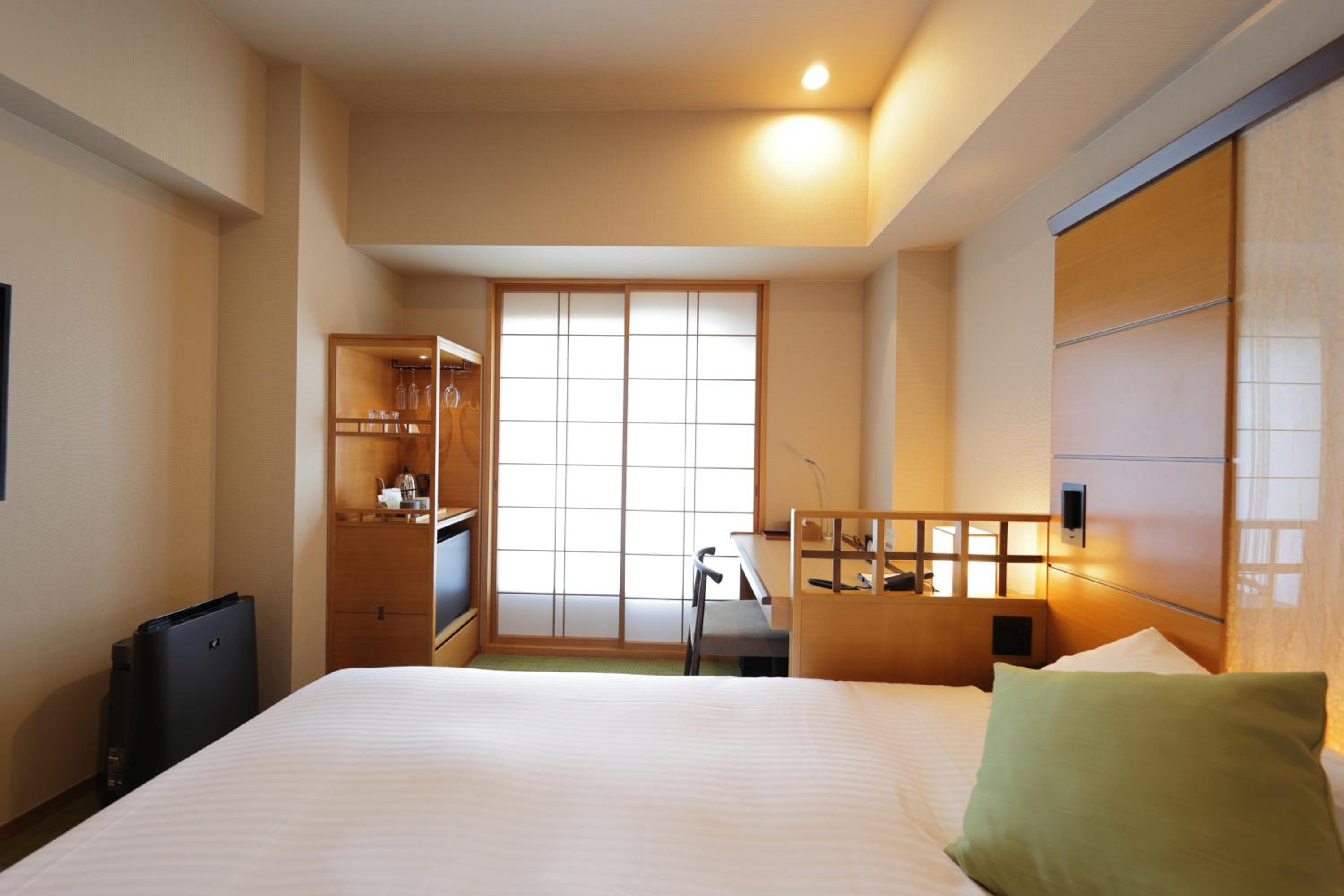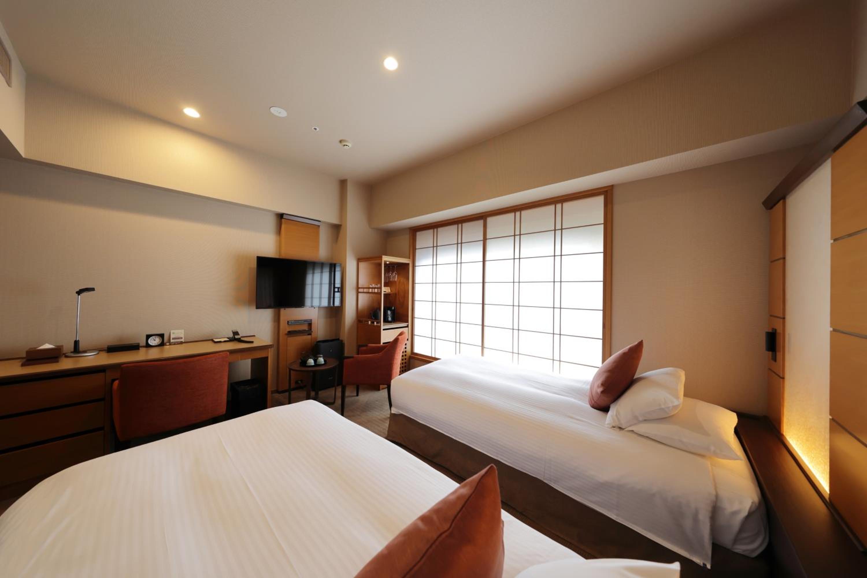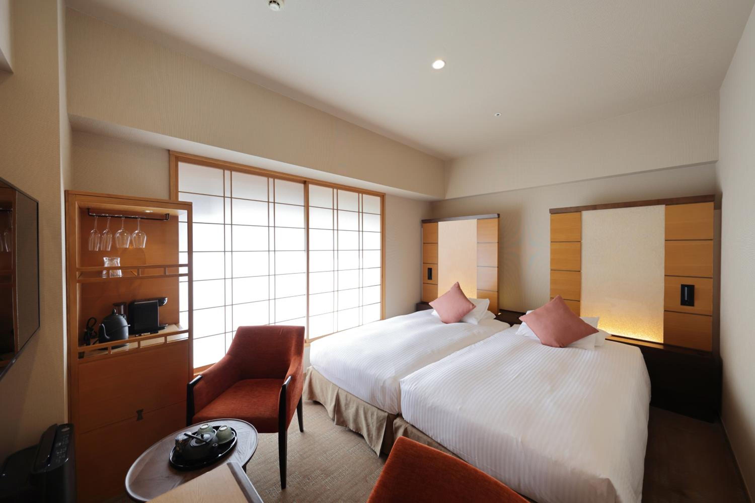 Hotel Niwa offers an elegant accommodation with touches of Japanese traditional design, including a Japanese-style courtyard. Bright light filters through paper sliding screens in the modern rooms, creating a serene atmosphere.