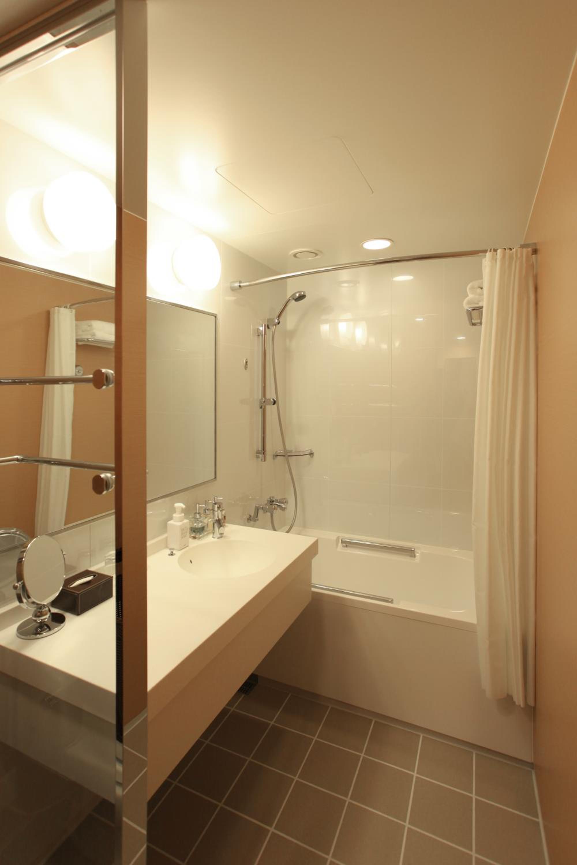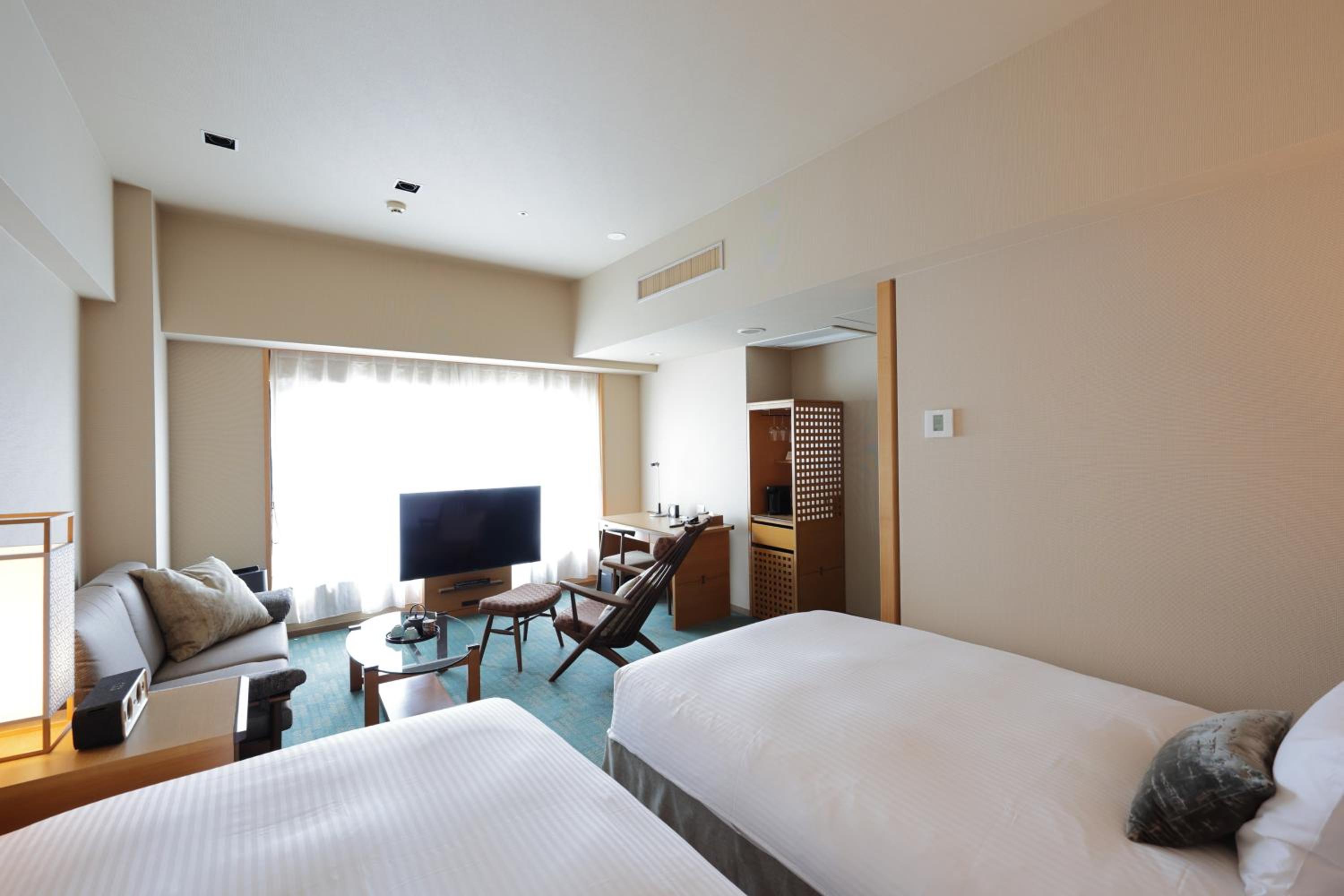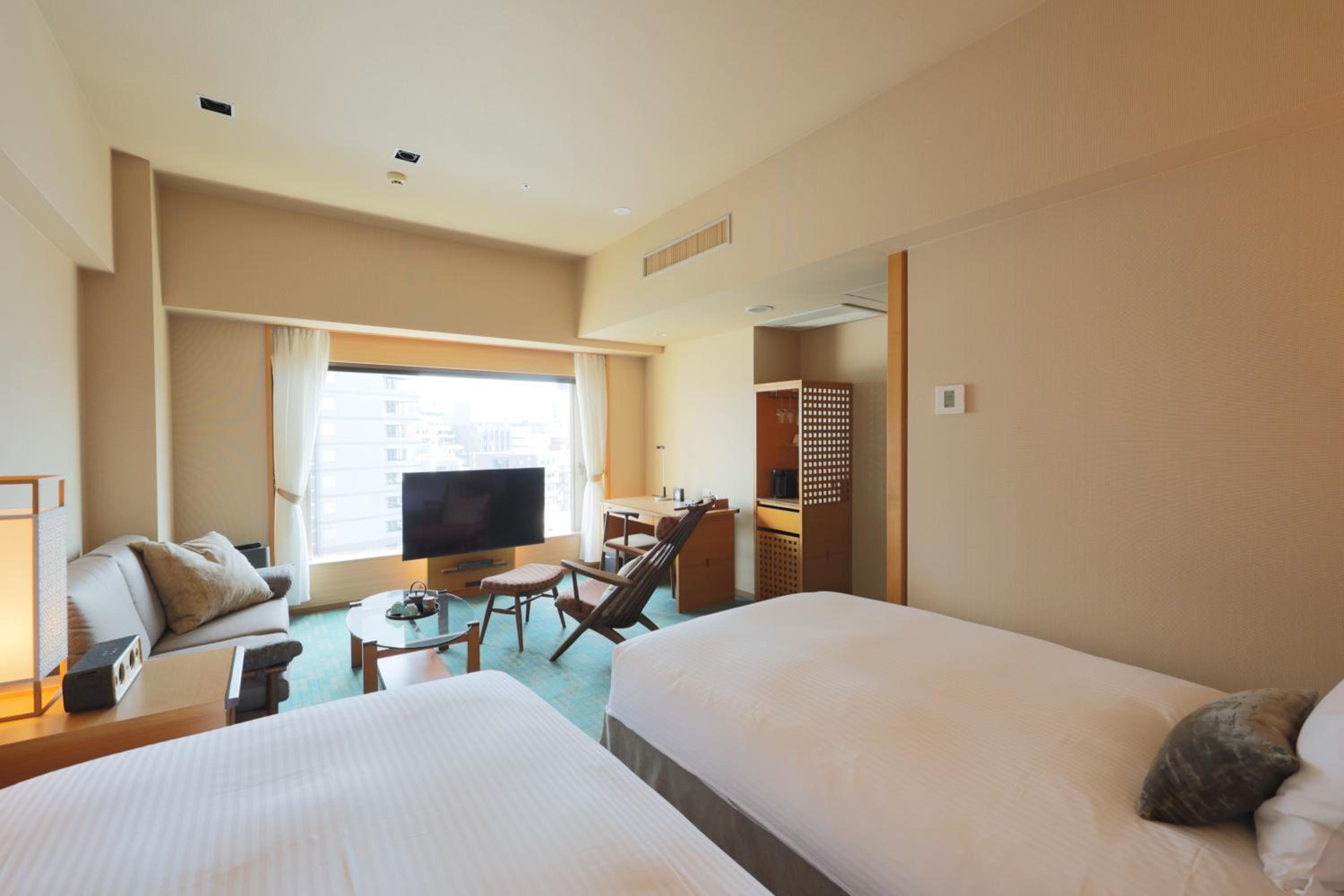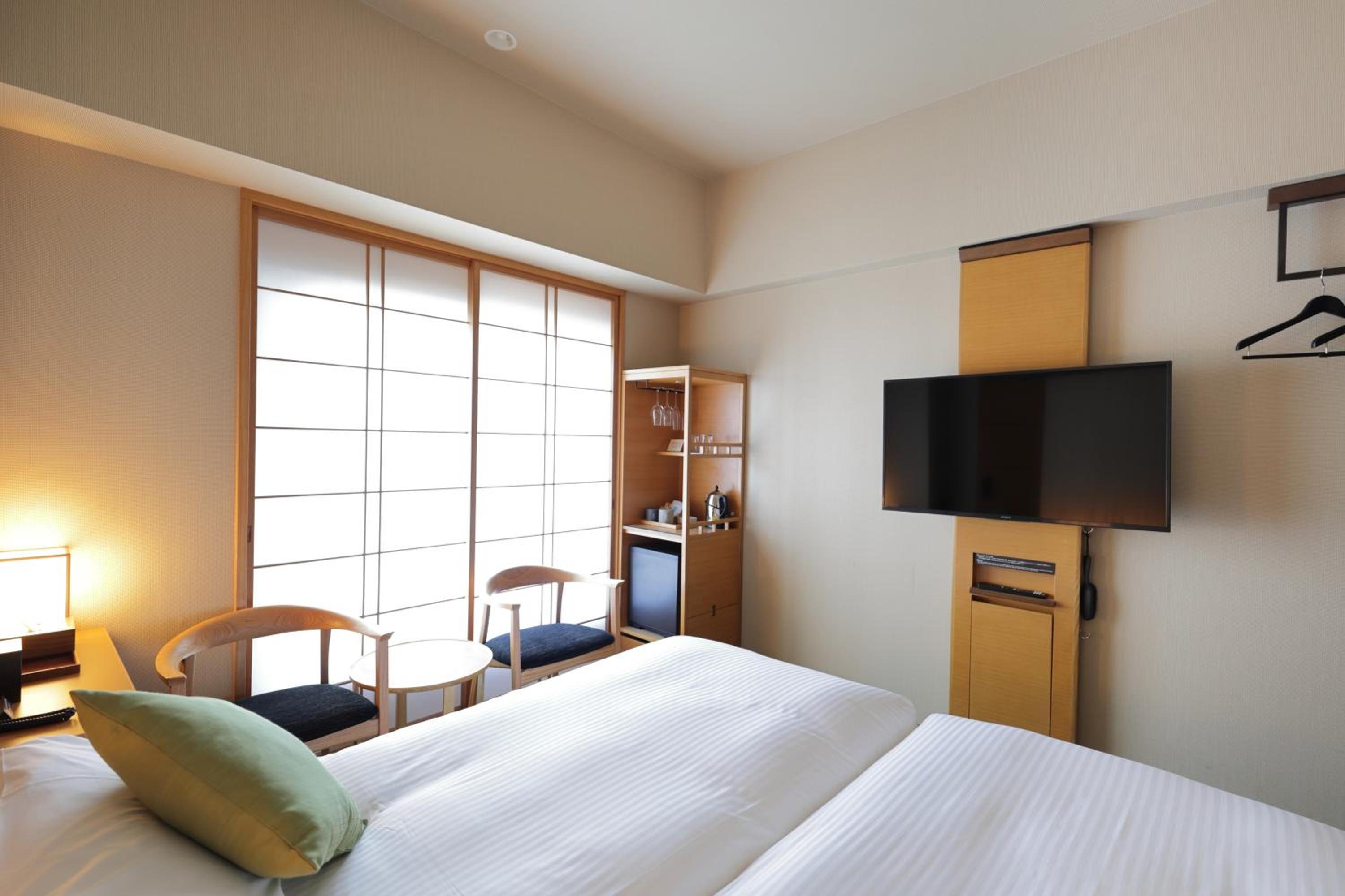 Hotel Niwa offers an elegant accommodation with touches of Japanese traditional design, including a Japanese-style courtyard. Bright light filters through paper sliding screens in the modern rooms, creating a serene atmosphere.