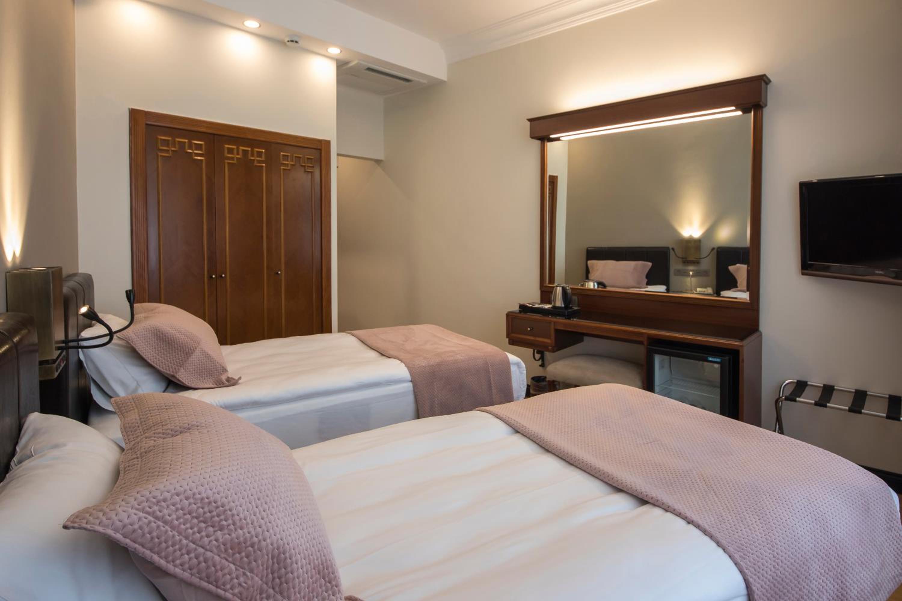 Indulge in the opulence of our Ottoman-style guest rooms adorned with mahogany furniture, offering modern amenities like cable TVs, free WiFi, and 24-hour room service.