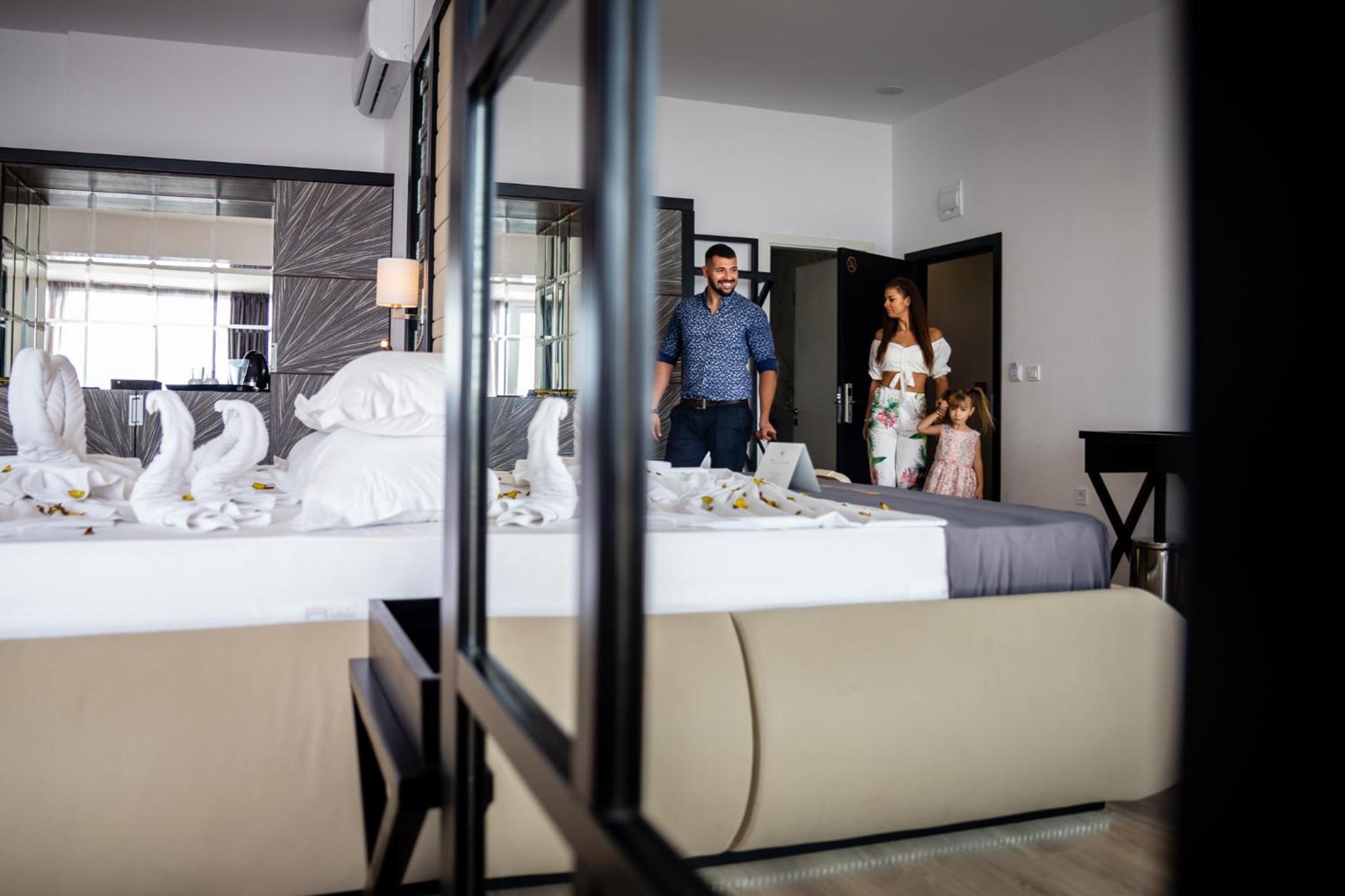 Не сподобалось те, що ми бронювали номери в готелі Prestige Deluxe Hotel Aquapark Club, а по ітогу нас переселили в Prestige Aquapark. Причина: готель мав закриватись через 2 дні після нашого приїзду. Чи повідомили це нам- ні. Ні Booking, через який бронювала номер я, ні готель туристичного оператора, через якого бронювала тур моя подруга. По ітогу: ми замовили таксі саме в цей готель, а валізи мали нести в інших готель (по сходам, важкі валізи, мами з втомленними дітьми, посеред ночі). Після наполегливих натяків, що нам в цьому мають допомогти- нам звісно допомогли. Нормальної відповіді на питання чому ніхто не попередив- не отримали (думаю і не планували). Ми хотіли саме в цей готель, бо там зручна зона барбекю/ піци+ морозиво з 10 до 17. ), - батьки зрозуміють що це немаловажно, оскільки в готелі Аквапарк це можна отримати тільки в обід в самому ресторані, а не в проміжках між зазначеними періодами сніданок/ обід/ вечеря. В цьому готелі більшість номерів без нормальних сейфів. (нормальний в моєму розумінні- це кодовий замок, а по ітогу отримуємо сейф на ключі, який на руки не видають, можна відкривати і закривати, викликаючи людину з рецепції.). Зручність даного процесу- максимально незручна. Прибирання - не стабільне. Іноді гарно, іноді рушники забрали і нові не надали. Хотично, залежить від зміни. В дні прибирання спокійно можуть проігнорувати пісок на підлозі, а потрібно знов шукати і просити щоб пропилососили.