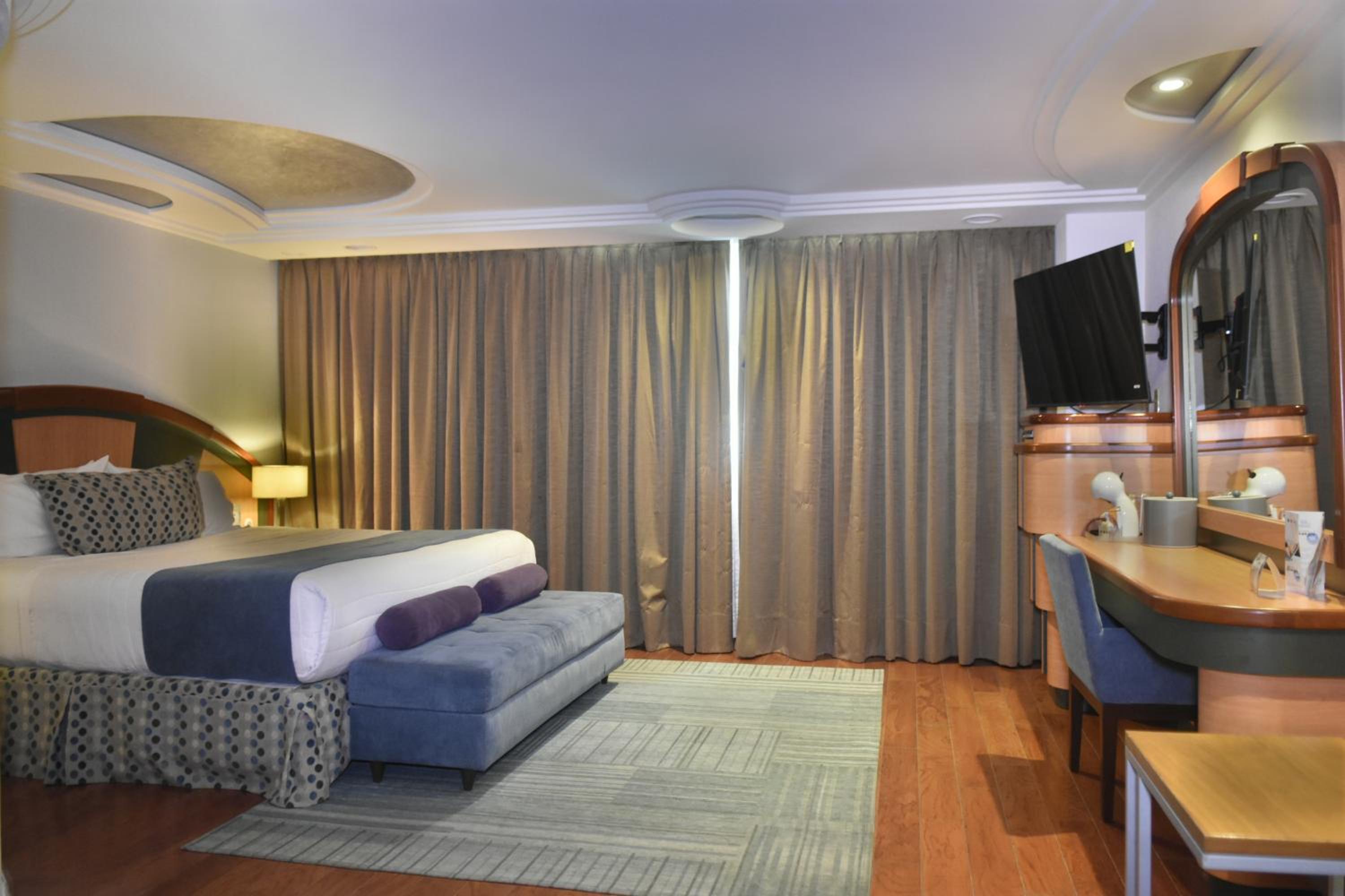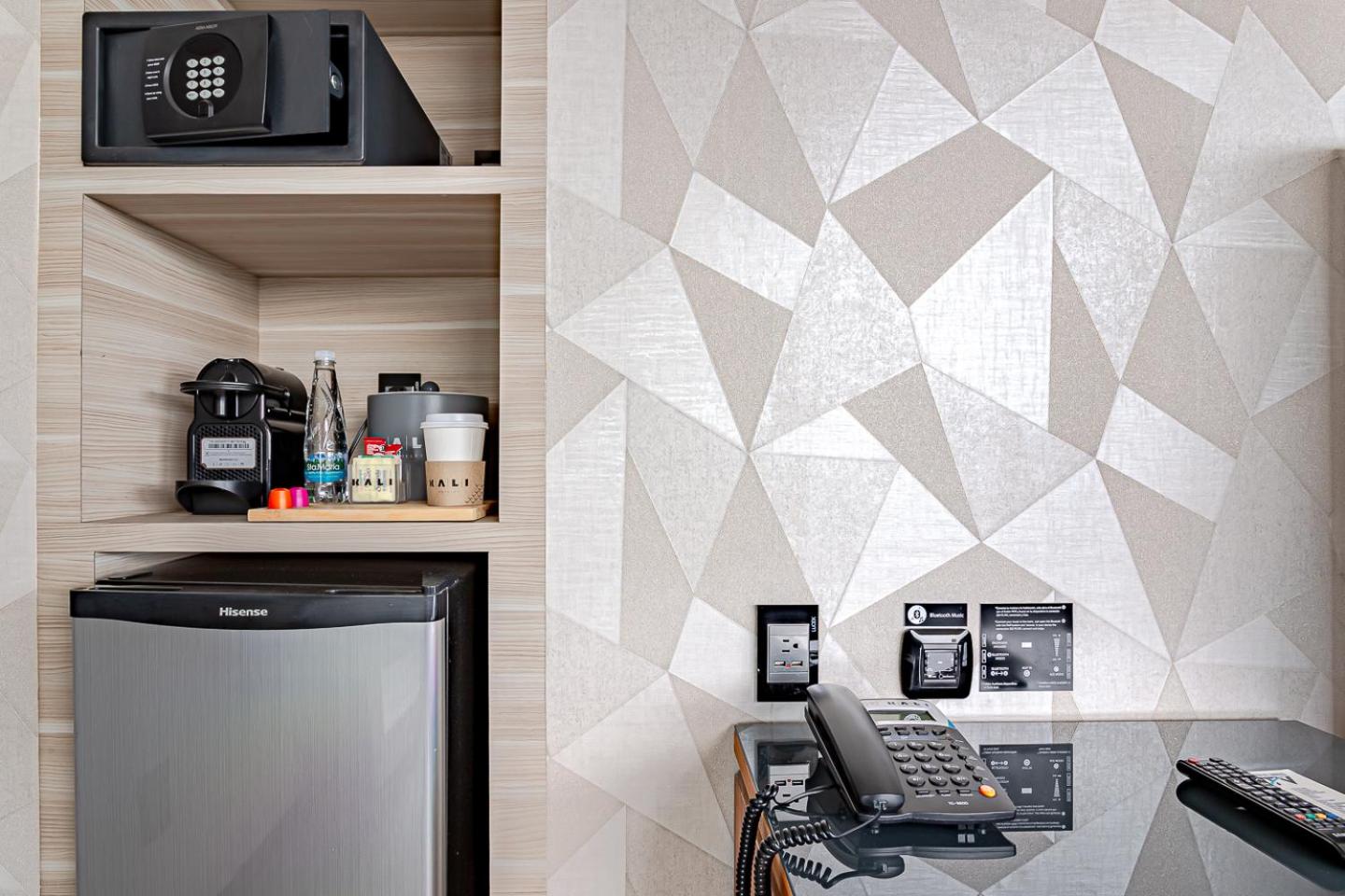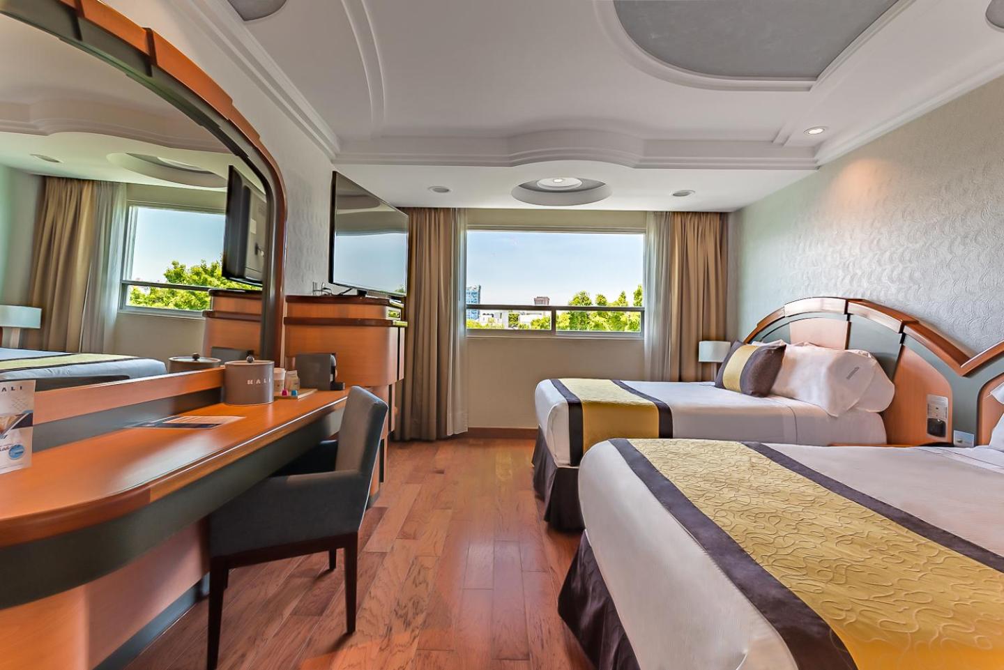 Piso de madeira nos quartos ….limpeza excelente….cafe e chá disponível por 24 horas na recepção …..água quente e gelada filtrada em máquinas em todos andares …..existe mercado e farmácia ao lado do hotel ….tem caixa eletrônico disponível……..amplo estacionamento gratuito…..