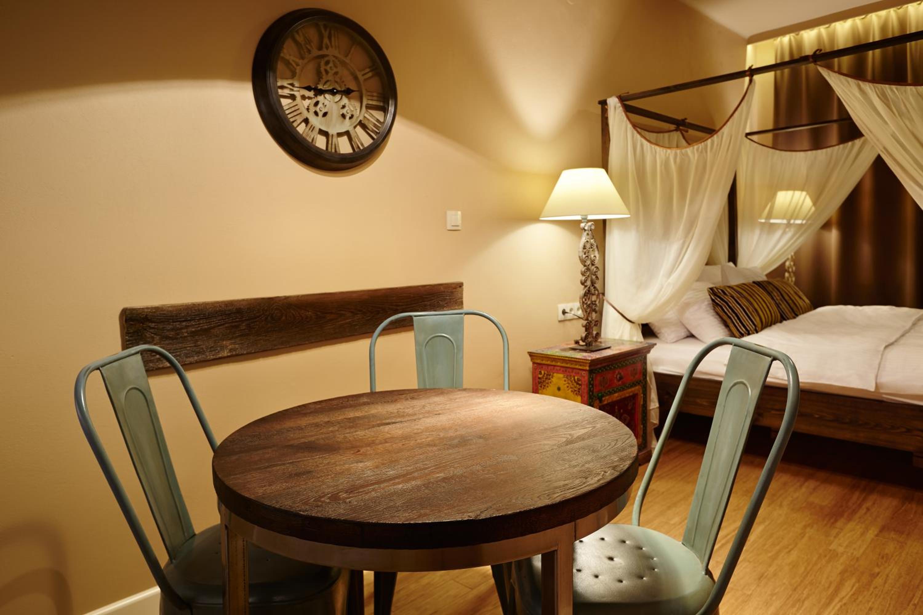 Stylish Modern Decor: Enjoy the contemporary design of our apartments featuring chic brick walls and canopy beds, creating a trendy and comfortable atmosphere for your stay.