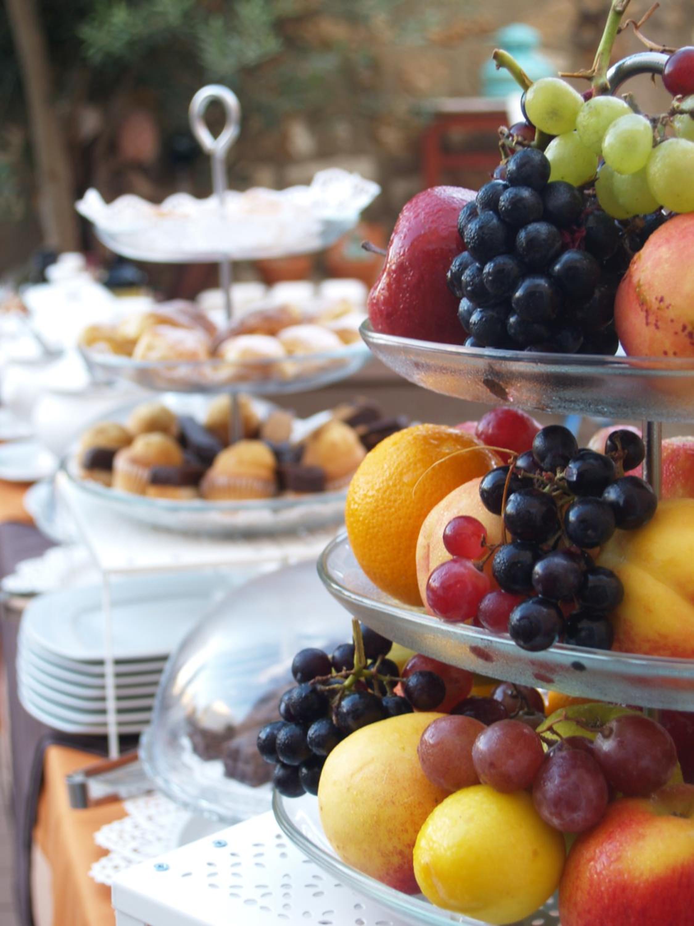 Frisches Obst, Eier, Auswahl an Aufschnitt plus Lachs.