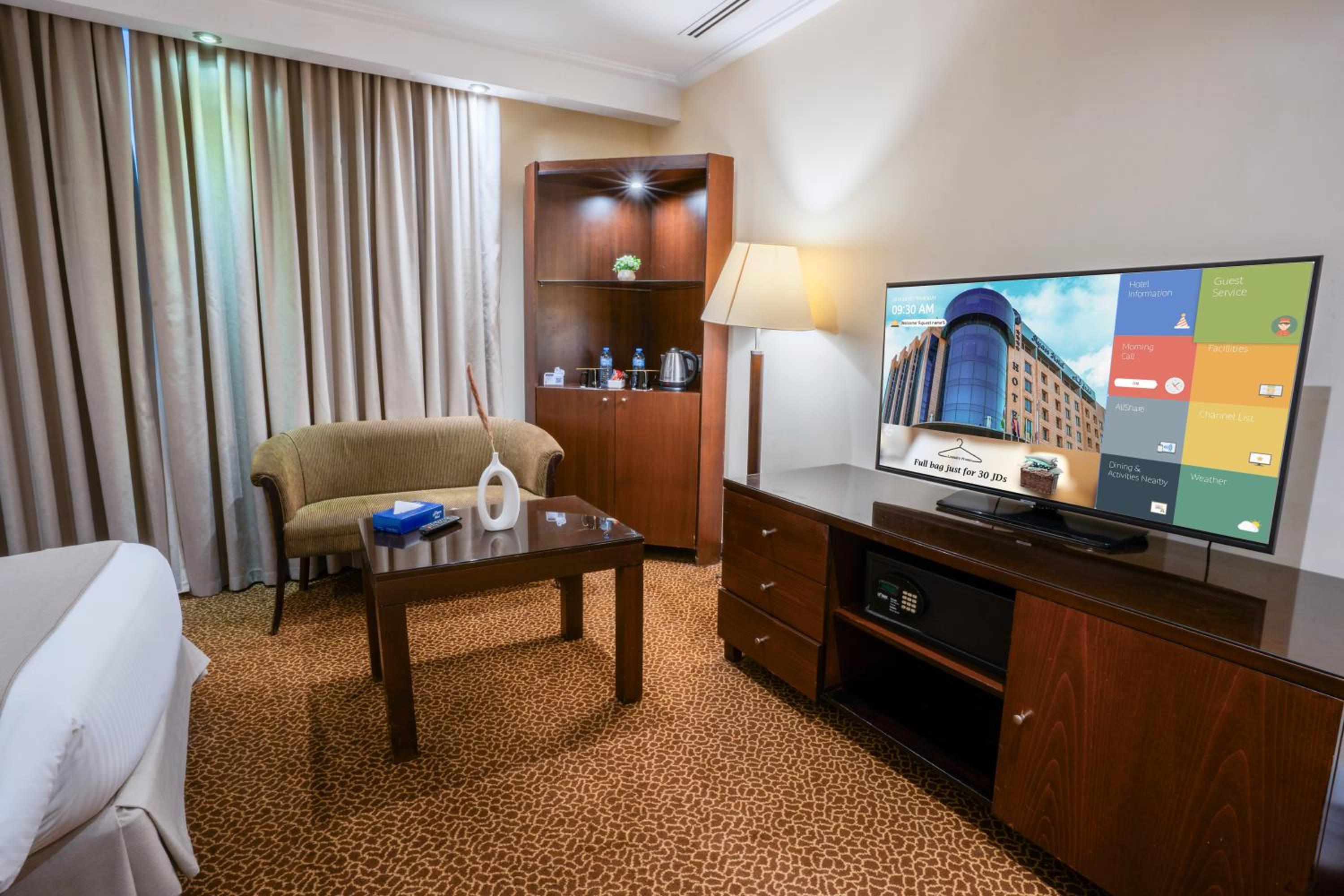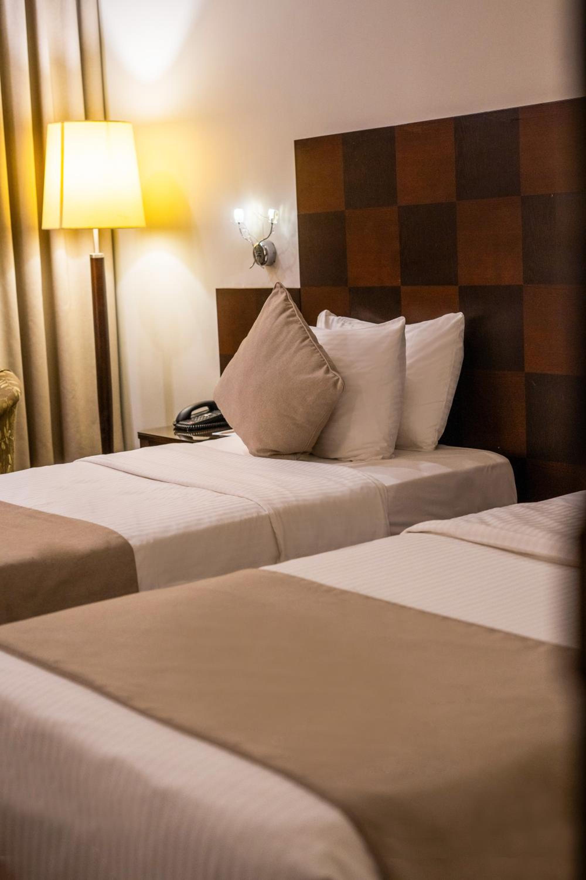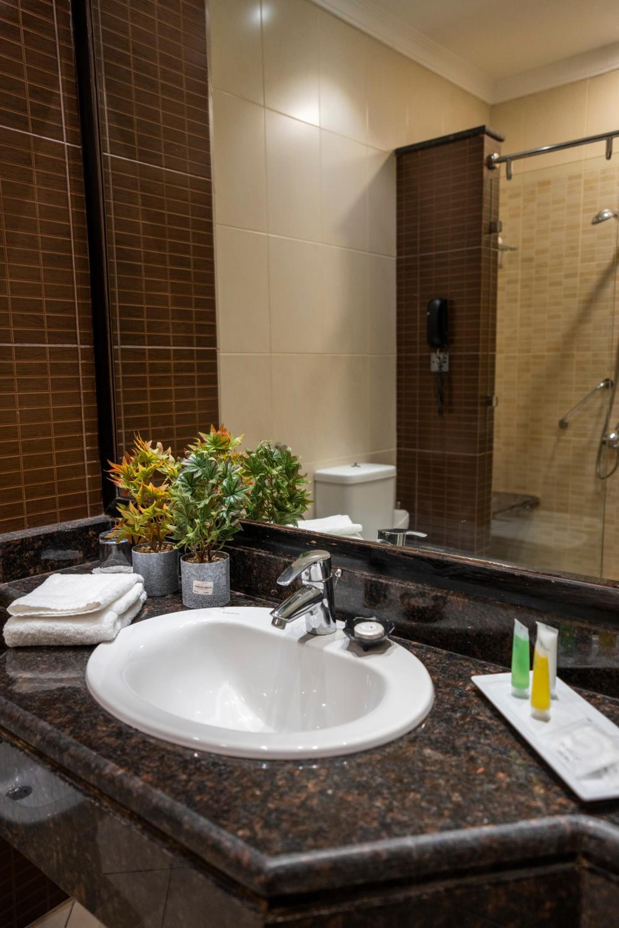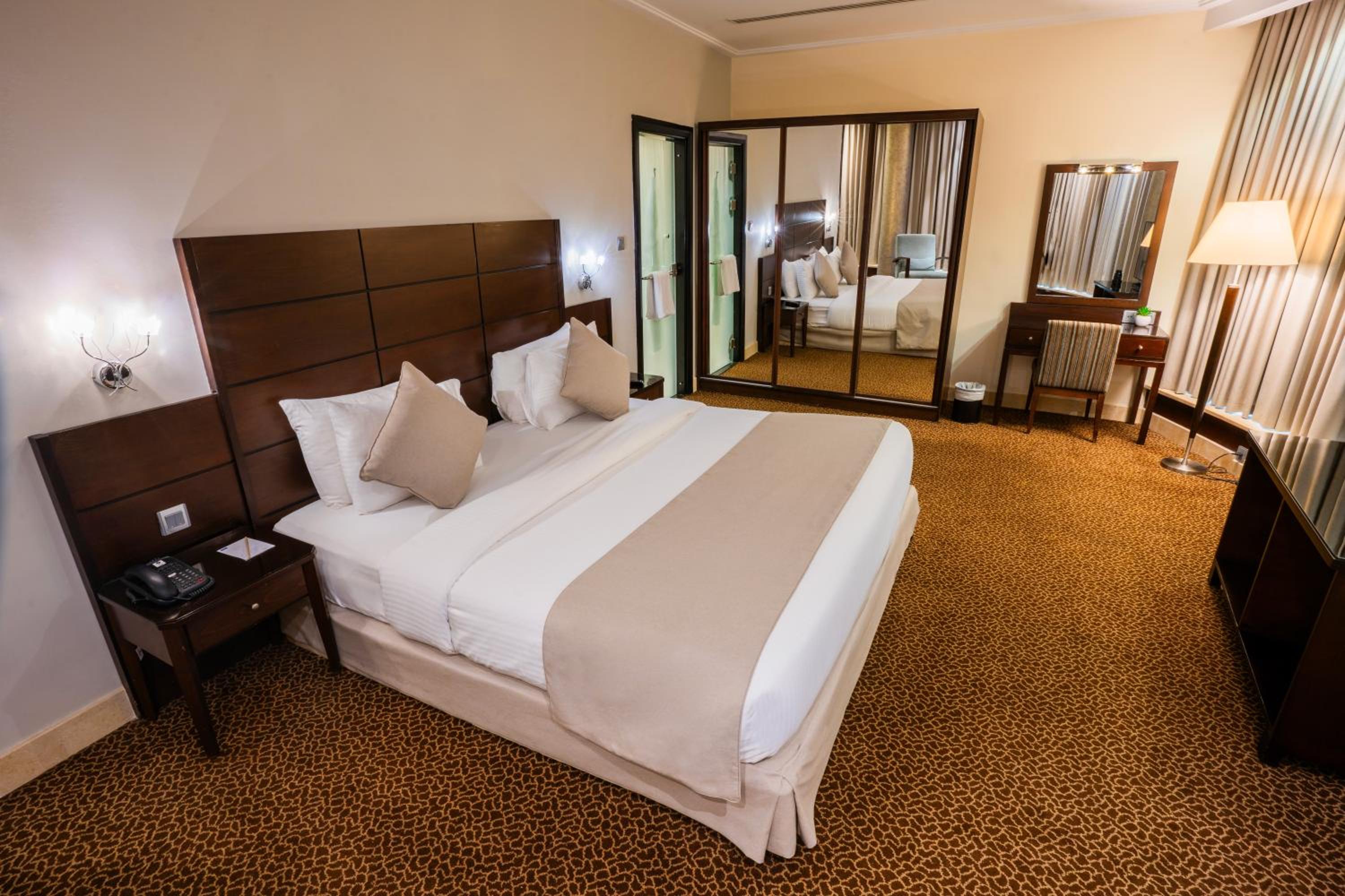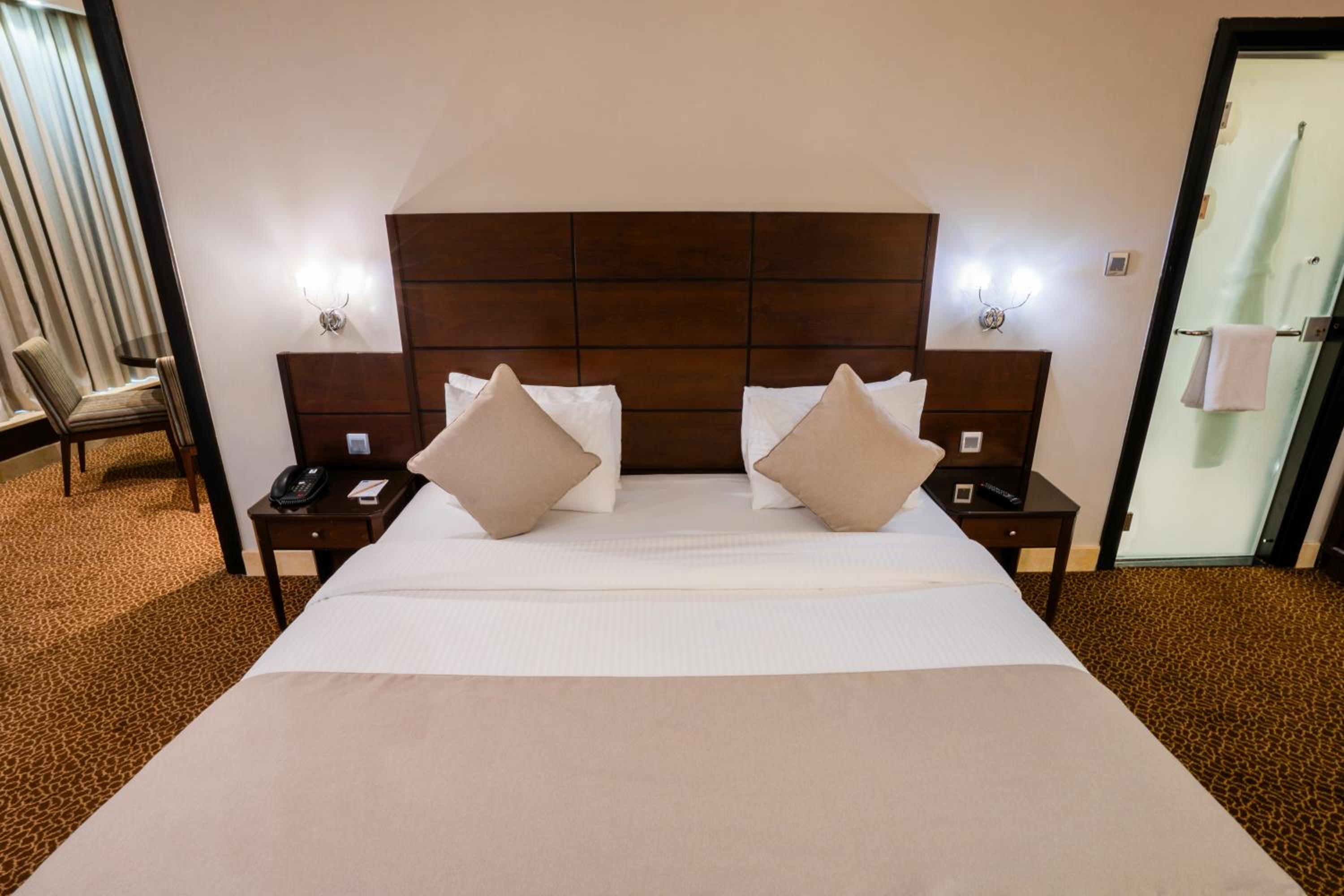 Ayass Hotel offers spacious rooms and suites with modern amenities, including free Wi-Fi, separate living rooms, and sleek bathrooms.