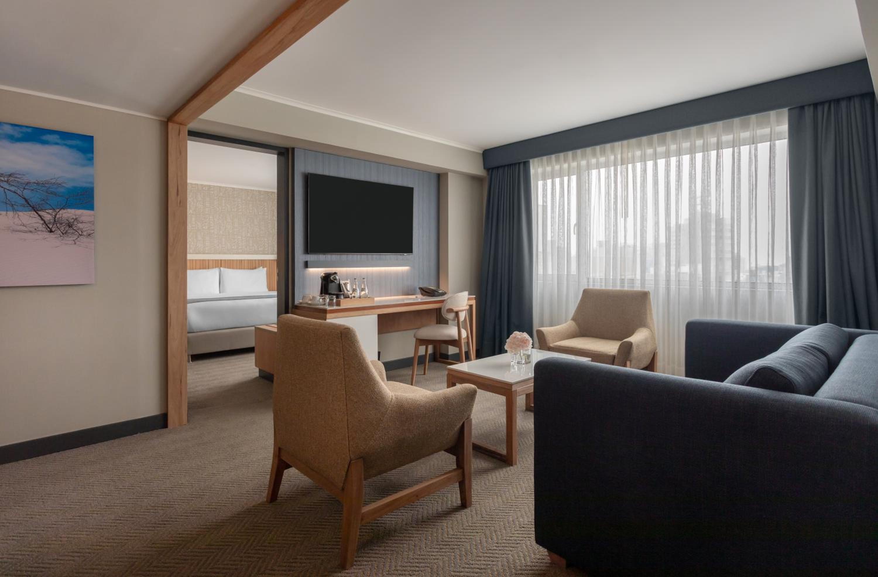 Indulge in our chic rooms featuring modern decor, air conditioning, flat-screen TVs, and stunning views that provide the ultimate comfort for your stay.