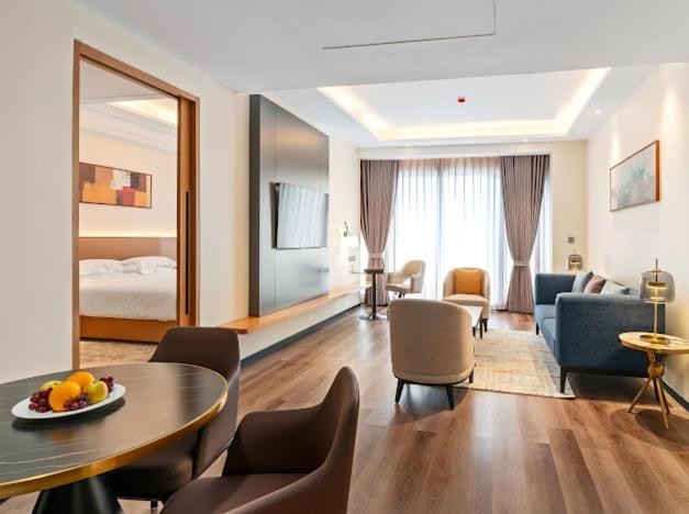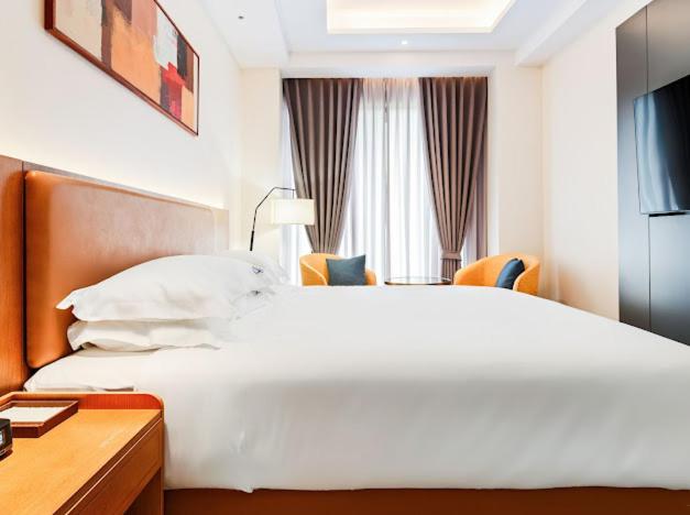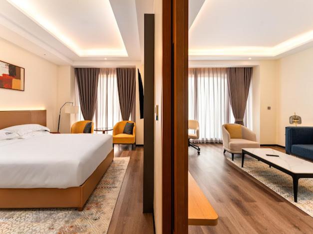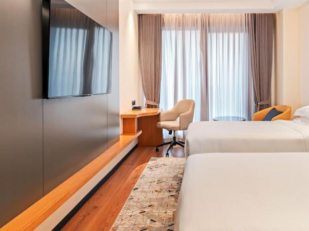 Our elegantly designed rooms are tailored for relaxation, featuring air conditioning, flat-screen TVs, and plush seating areas to ensure a restful stay. Each room includes a private bathroom complete with modern amenities for your convenience.