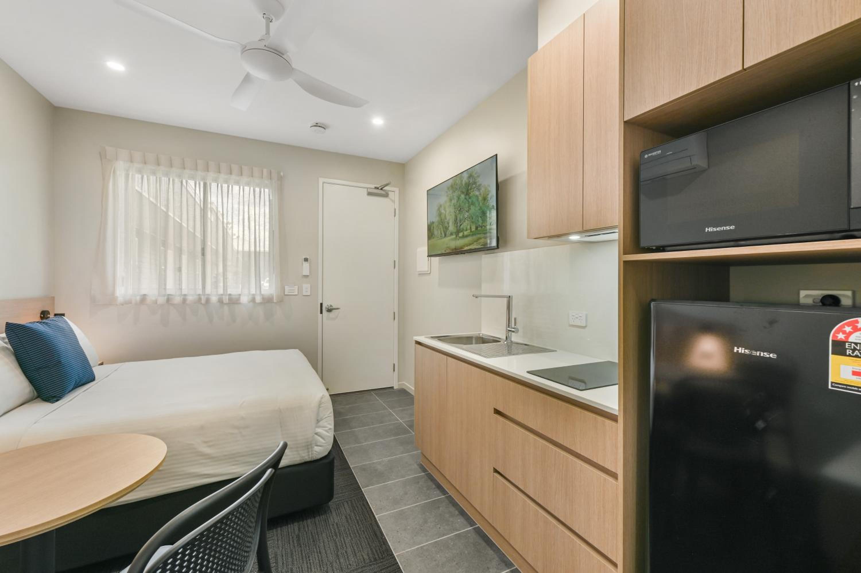 Each studio room comes fully equipped with air conditioning, a flat-screen TV, and a modern private bathroom with complimentary toiletries. With thoughtful amenities like a closet and fridge, we ensure a comfortable stay that feels like your home away from home.