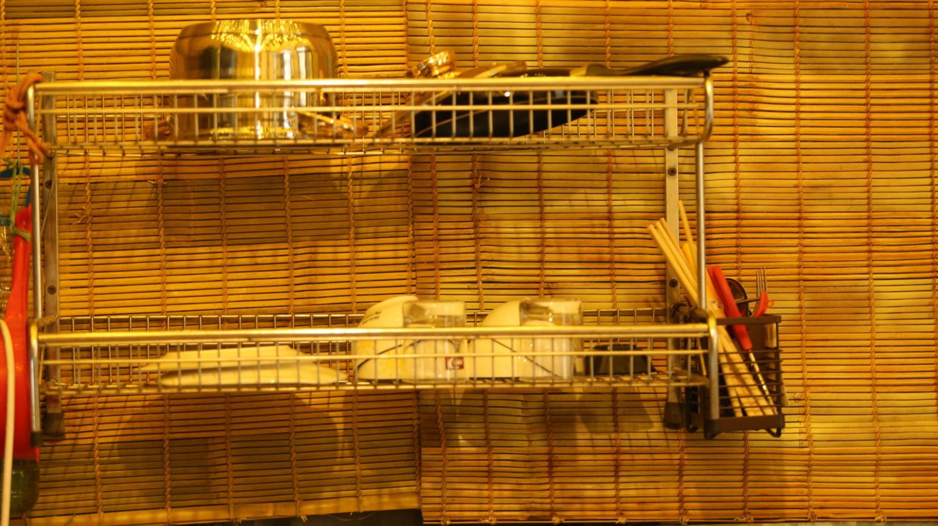 L'absence de couverts et de vaisselle. Une seule assiette. Très minimal. Ca pourrait etre amélioré.