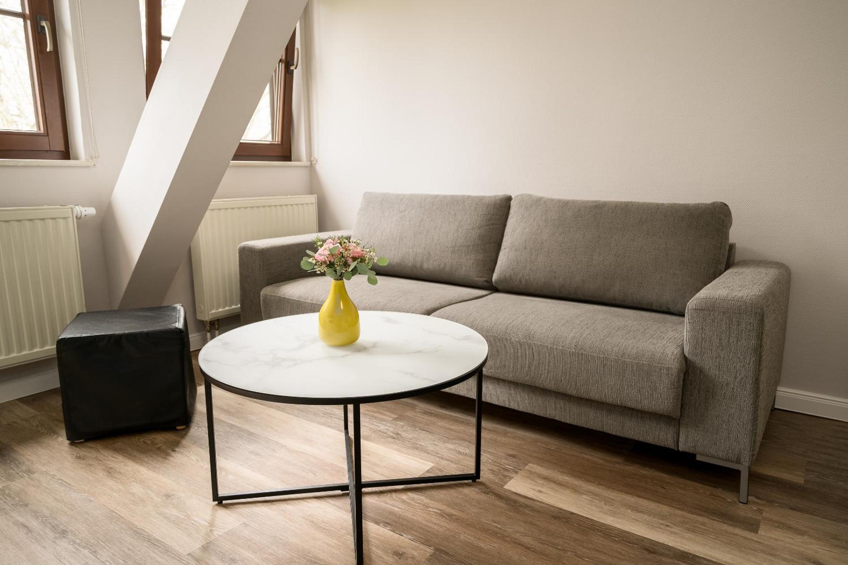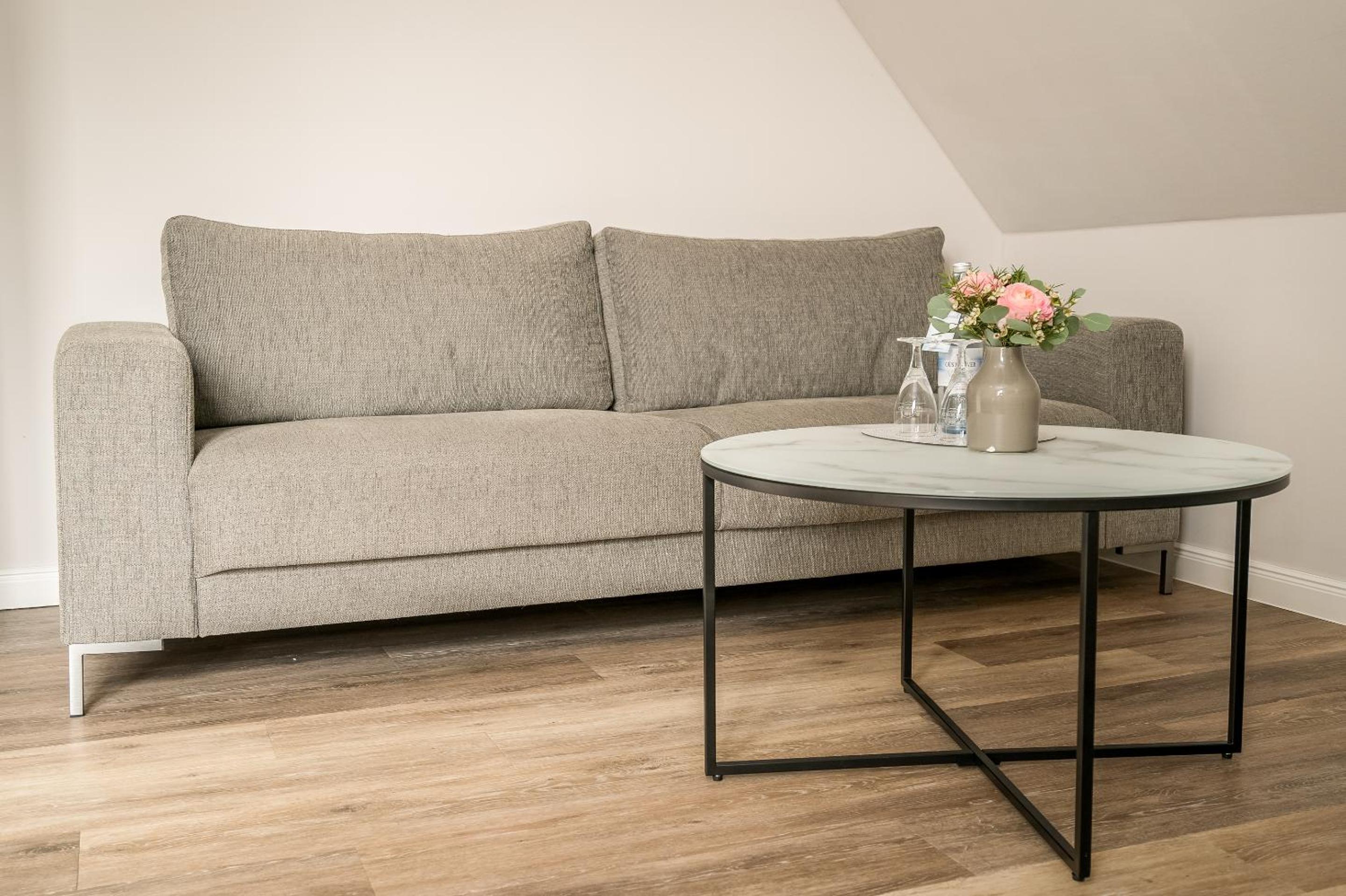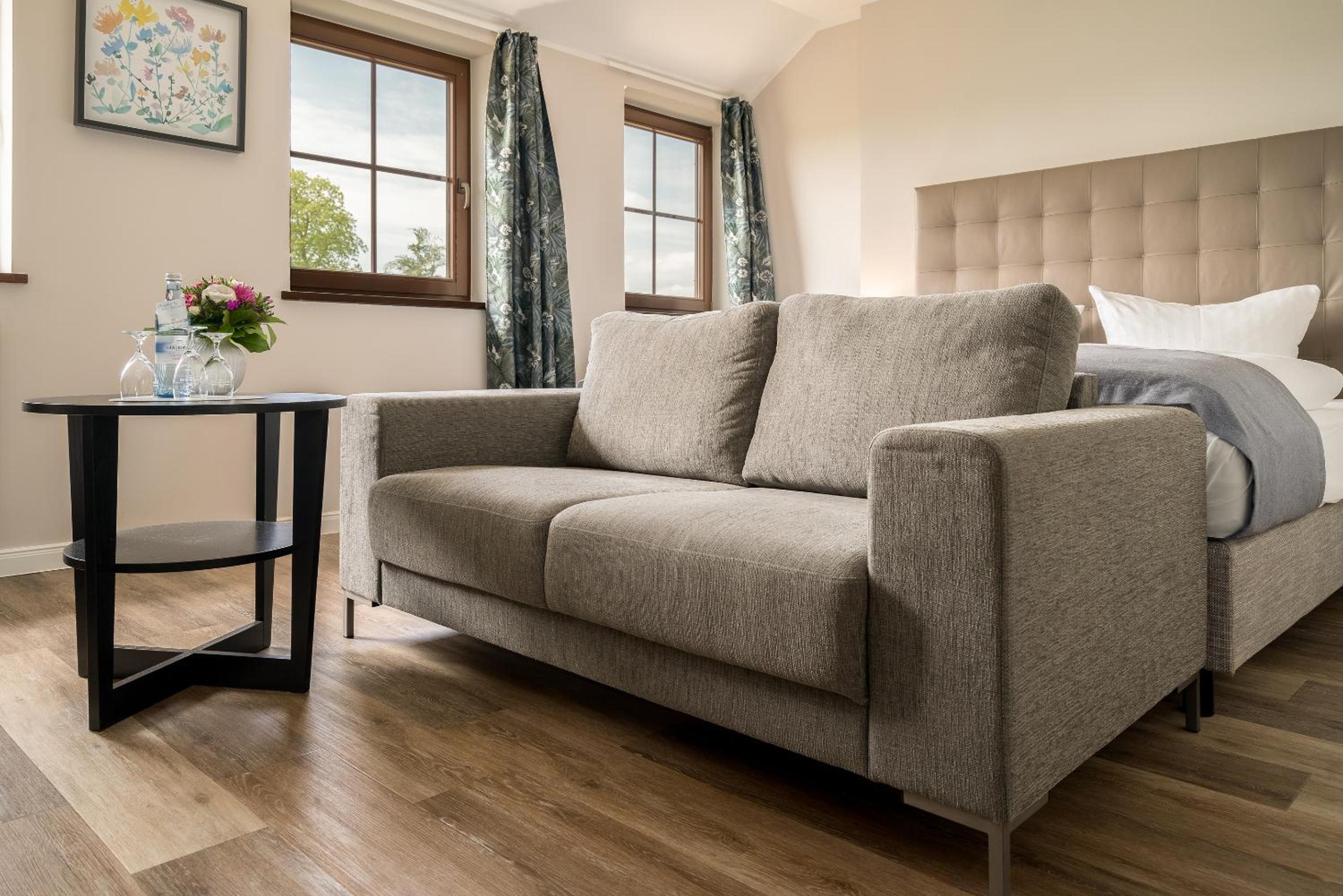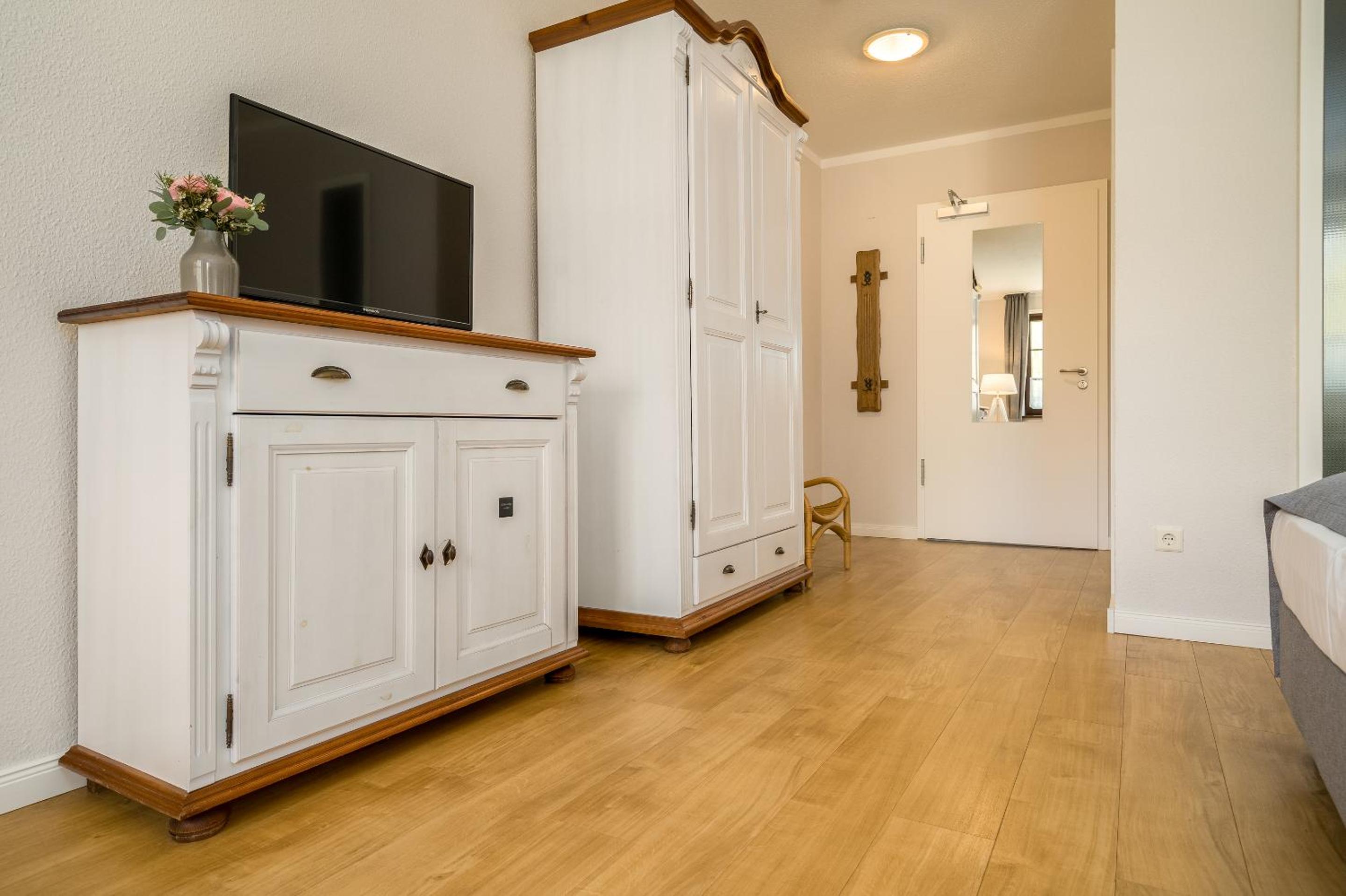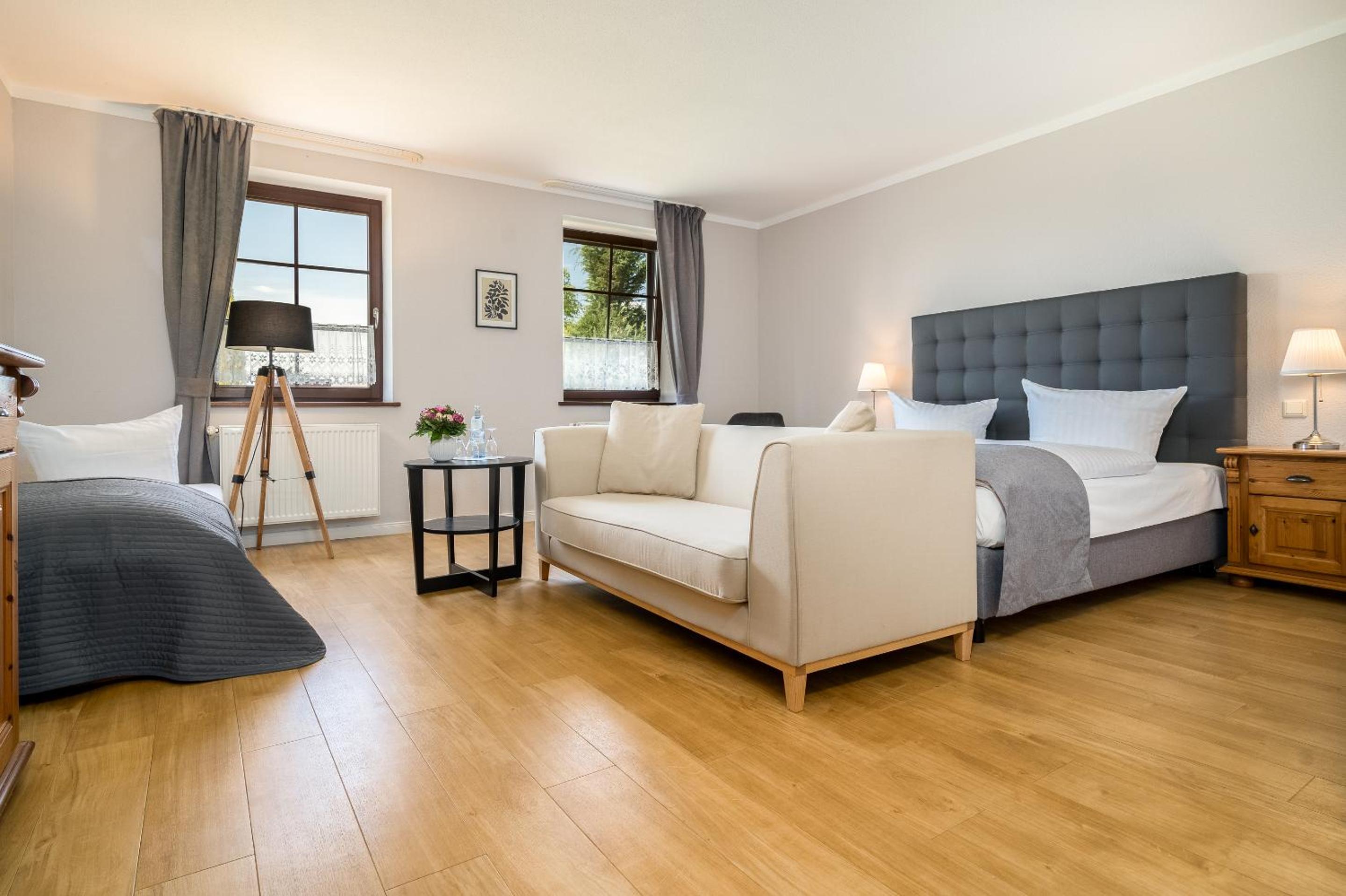 Das Familienzimmer hat zwar neben einem Doppelbett im Schlafzimmer,im Wohnzimmer noch ein Einzelbett. Leider ist das Wohnzimmer ohne Tür zu Flur und Bad - msn wird hierdurch leider gestört