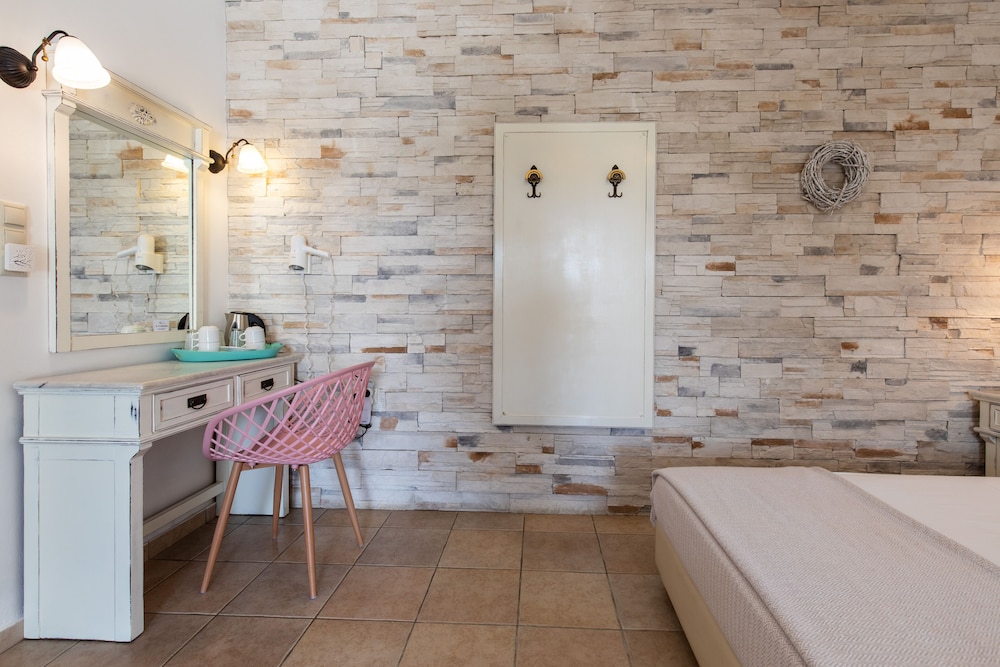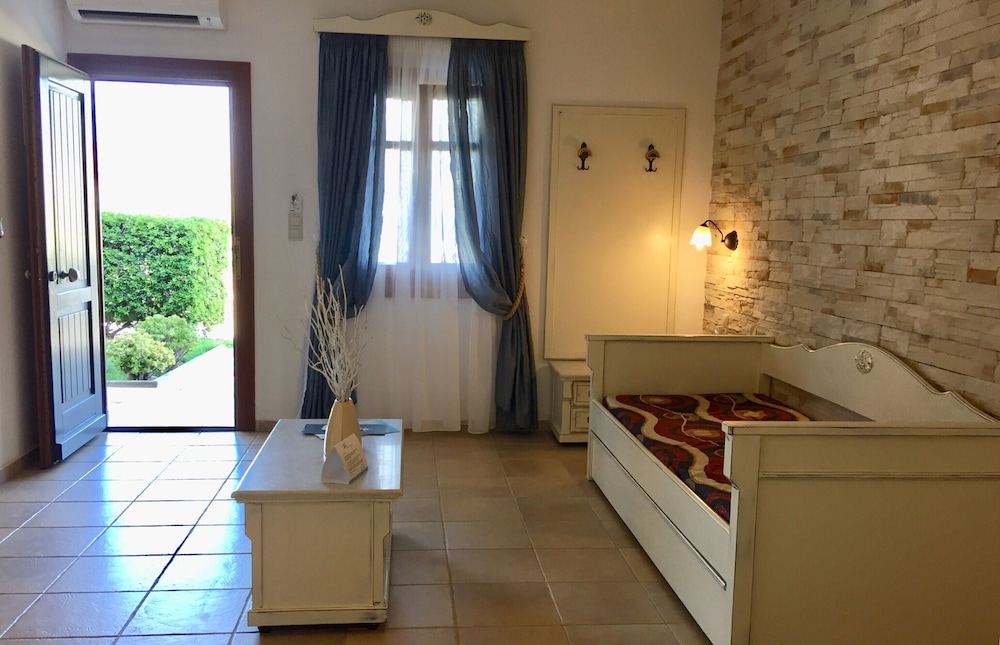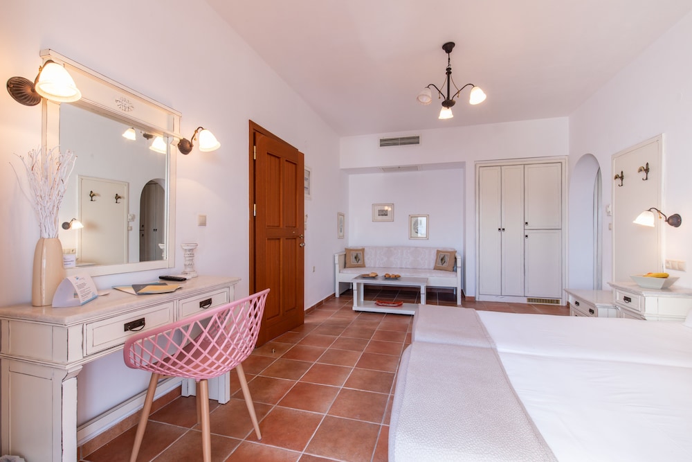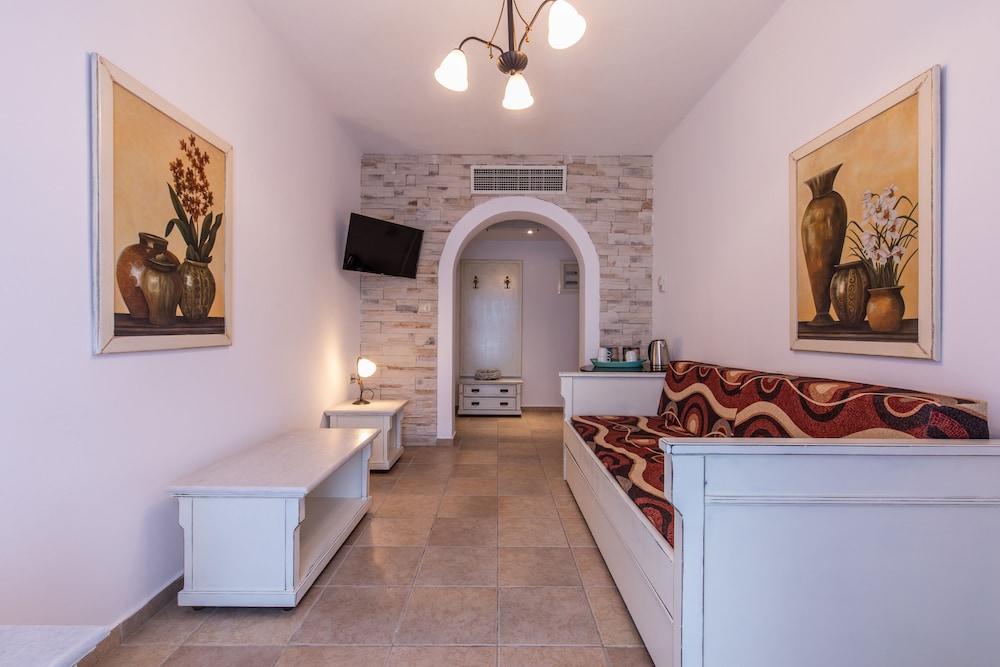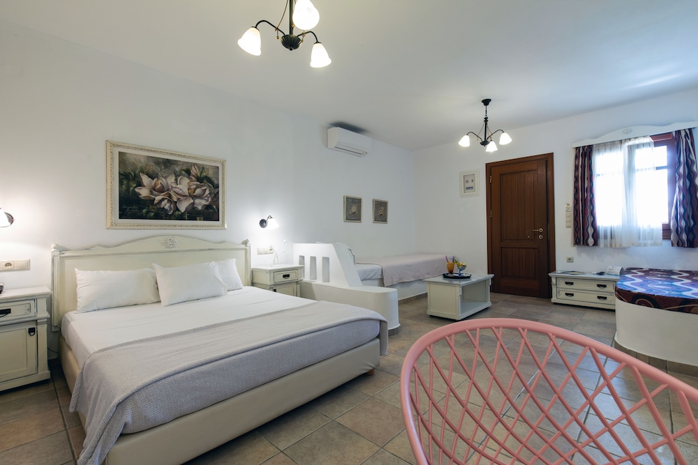 Ideal location on Naxos, right at the end of Plaka Beach strip. Took the bus from the port, last stop on the route, easy and affordable to get to. We appreciated the calmness of the beach as it was not in the center of the action so not as crowded as the other areas, yet still easily accessible by bus and walking distance to many restaurants. Rooms and furniture have not been updated and are old and show signs of wear, however the rooms are kept clean. Enjoyed drinks and snack bar service on the beach.