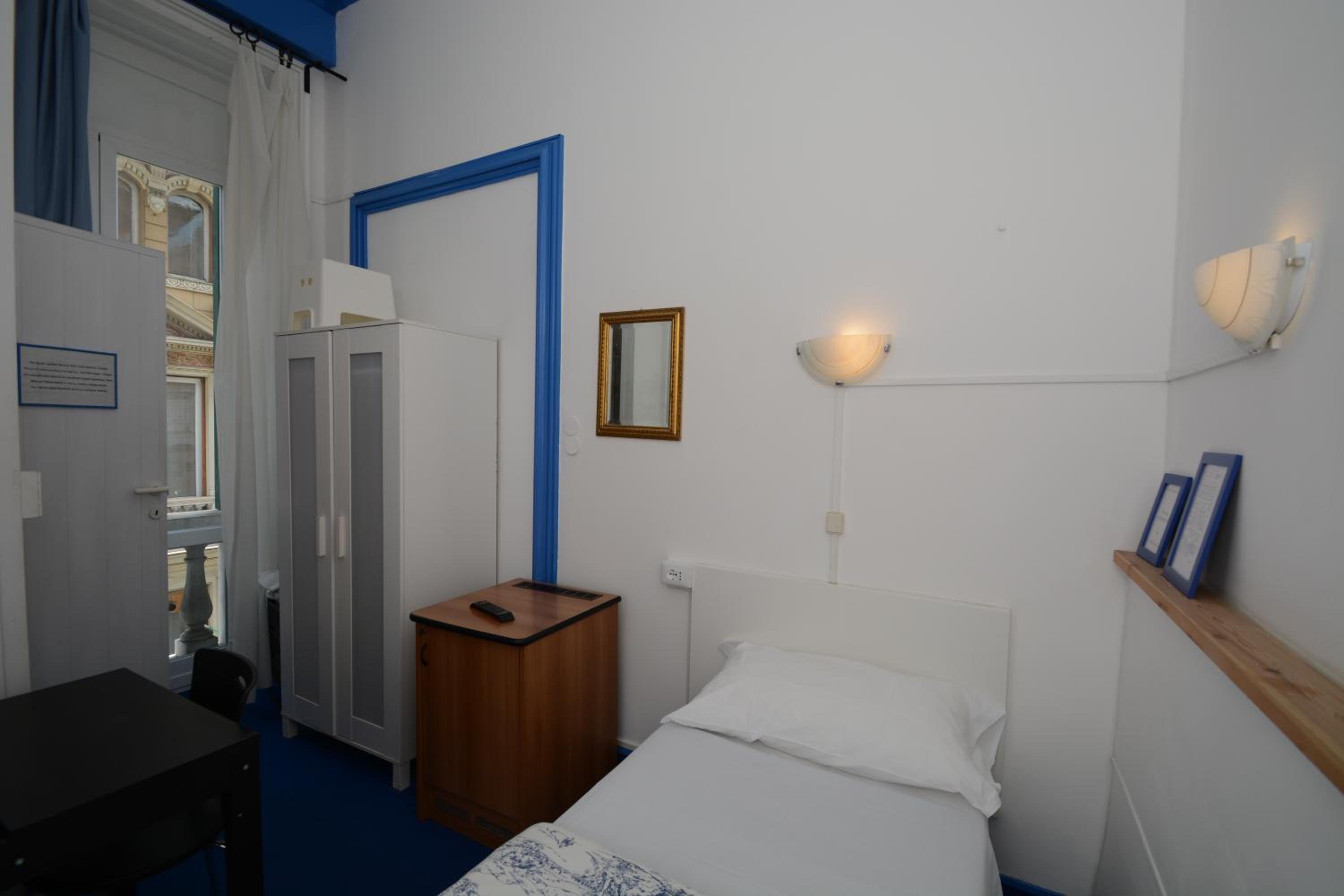 Step into Olympia Hotel and be mesmerized by the historic frescoes adorning the ceilings, creating a unique ambiance that blends the past with the present. The reading corner in the common room offers a cozy spot to unwind amidst the artistic beauty.