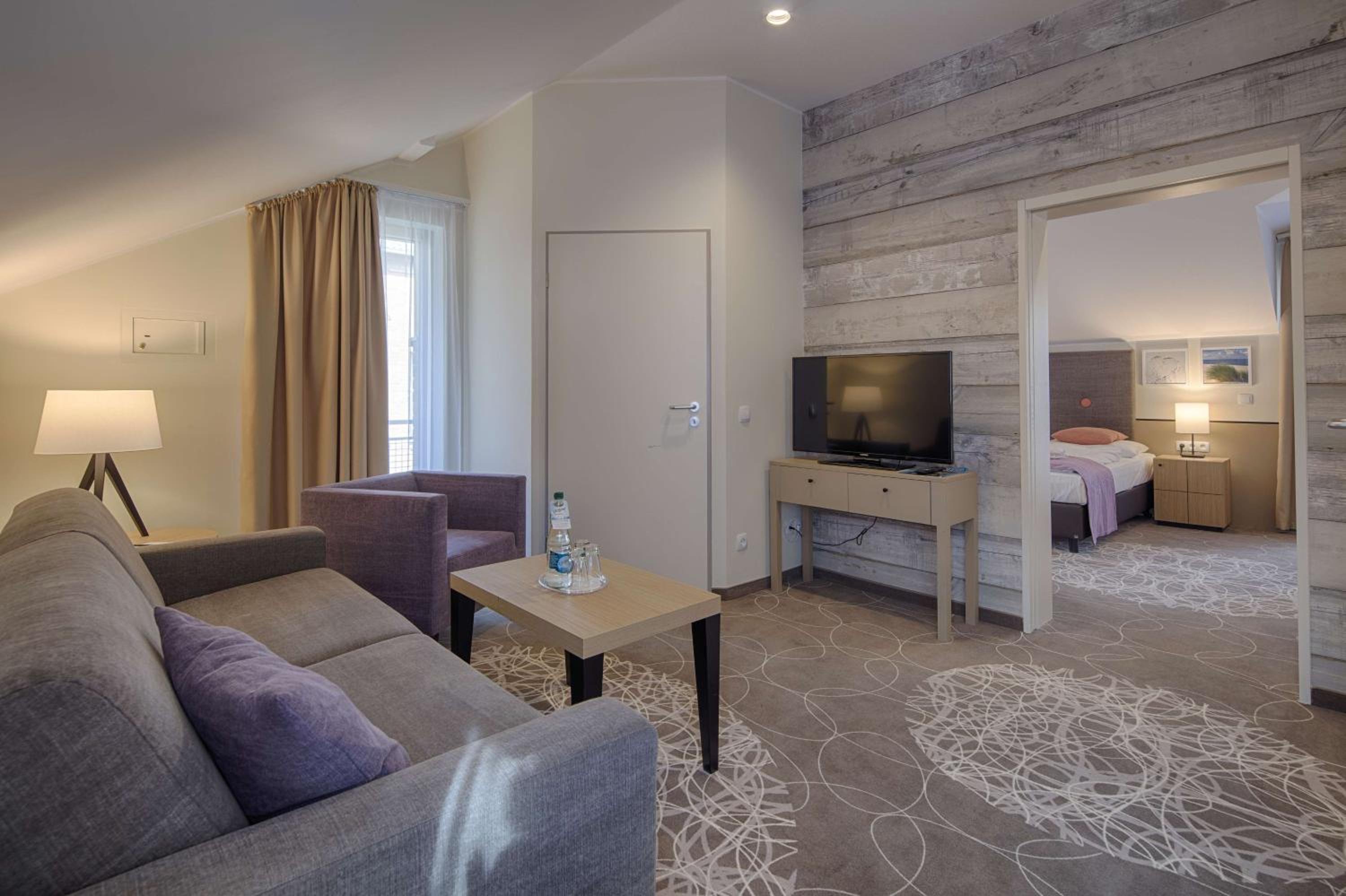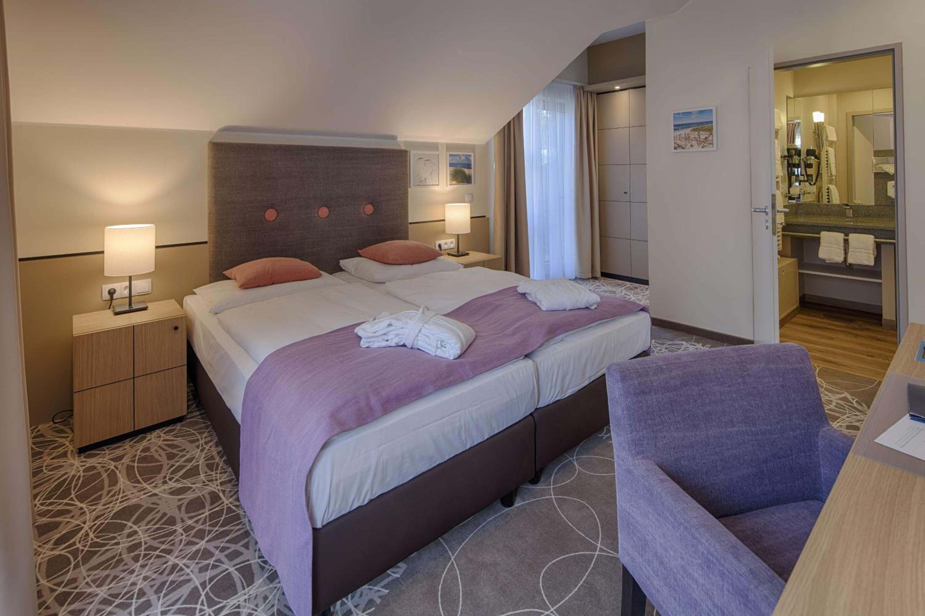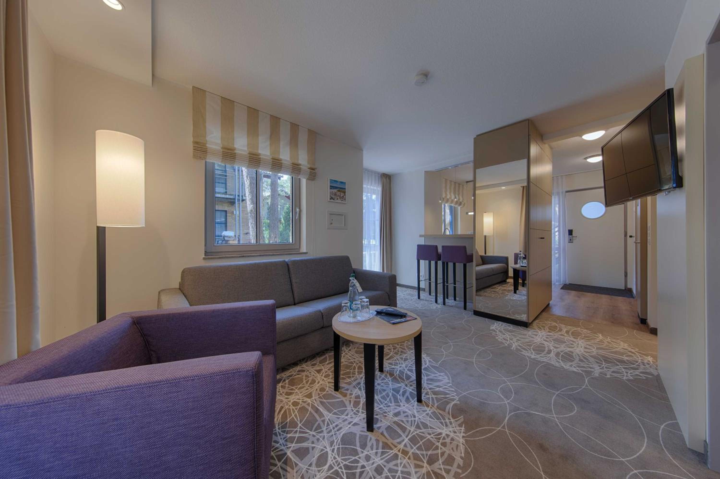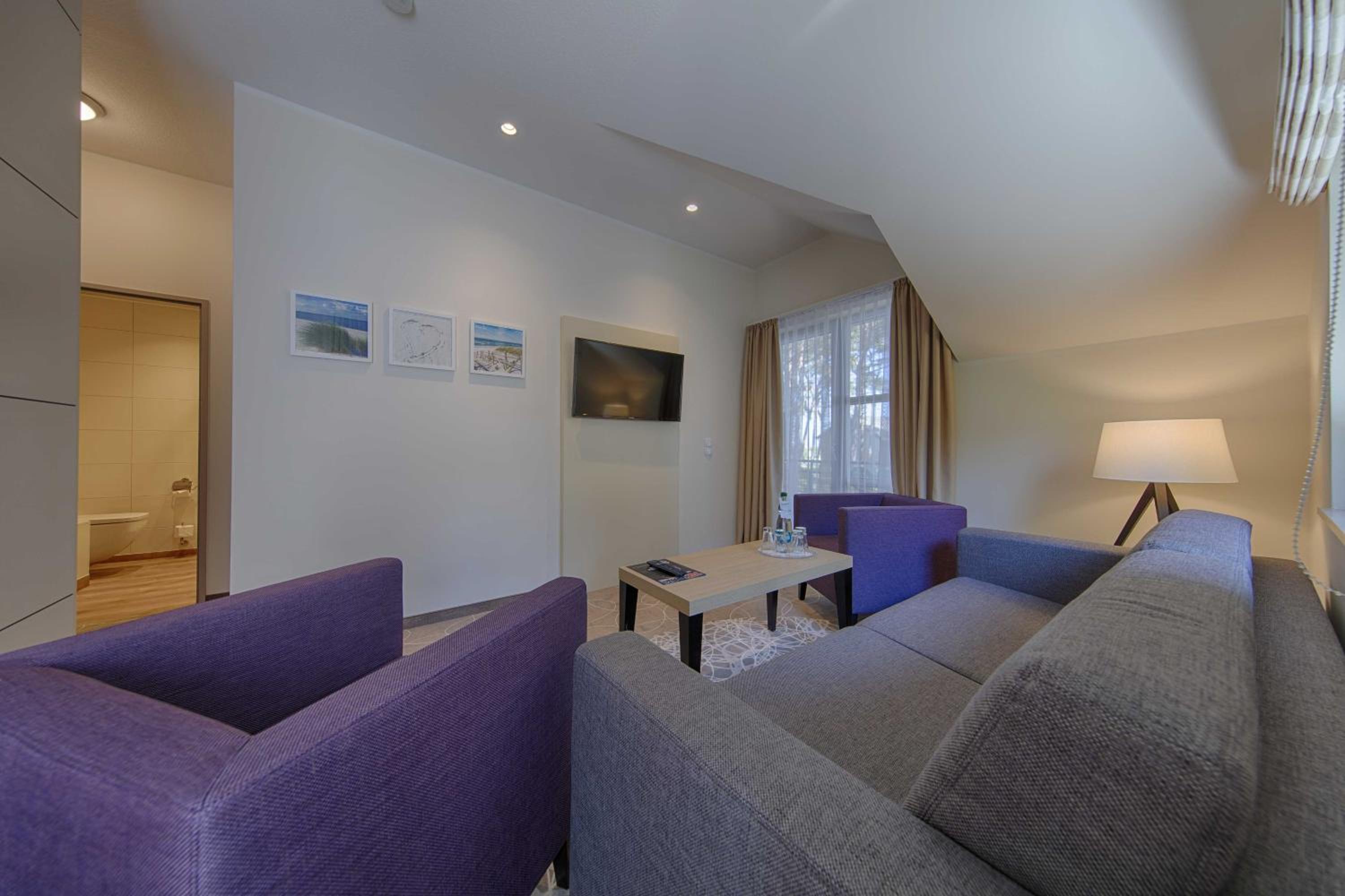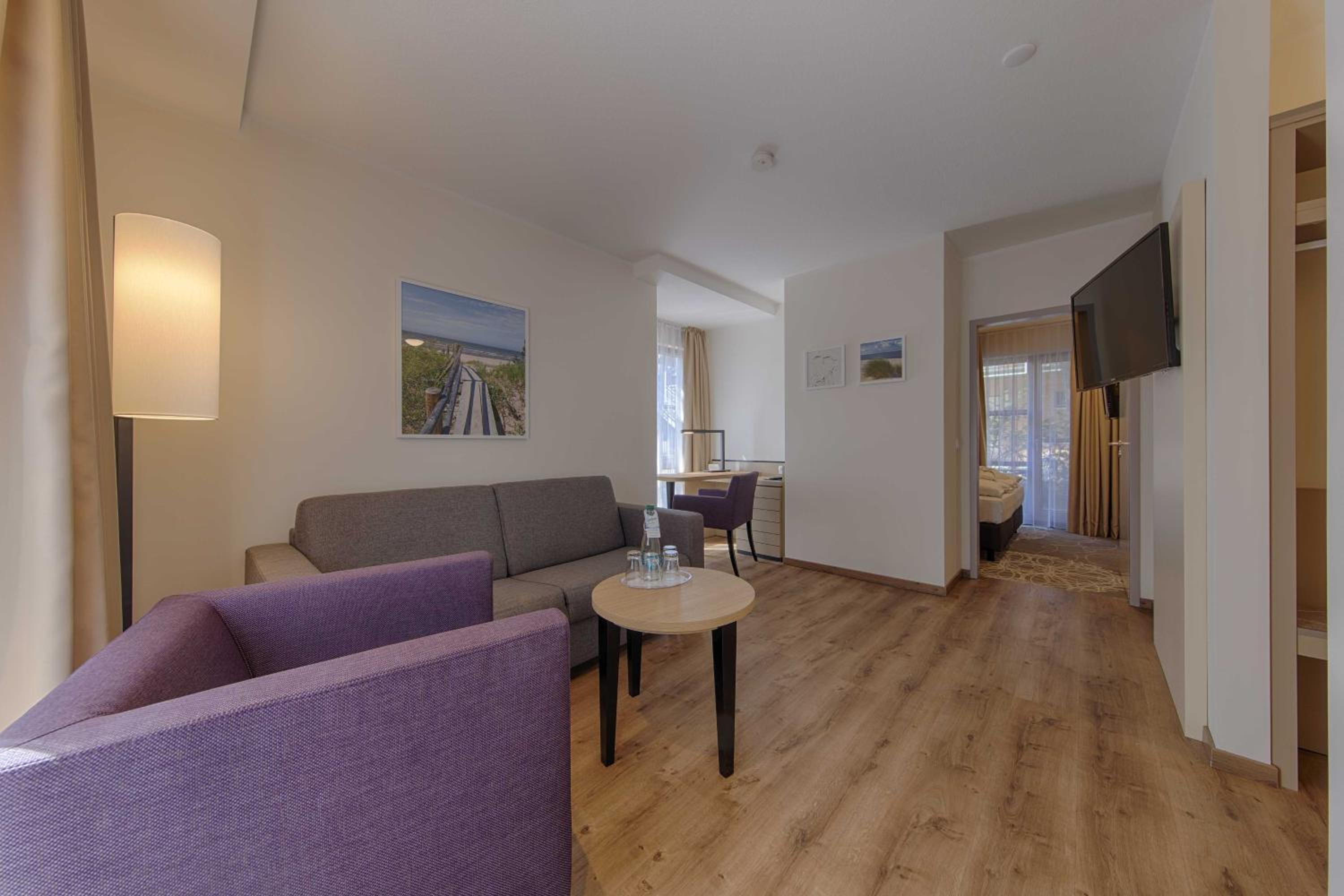 The Aquamaris Strandresidenz Rügen hotel offers tastefully furnished rooms and suites, many with a private balcony or terrace, providing a comfortable and relaxing stay for guests.