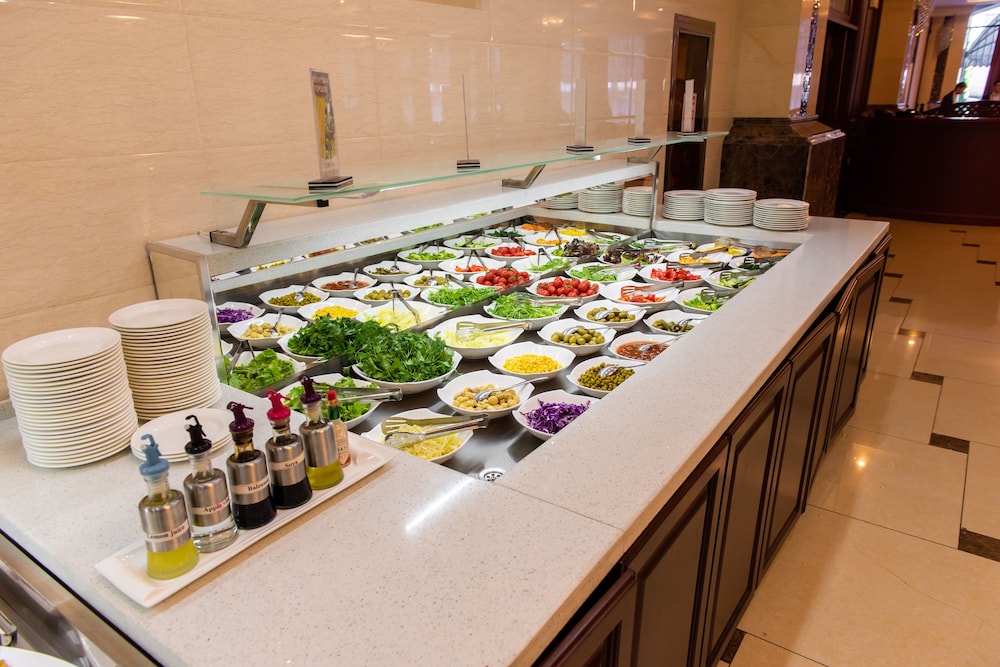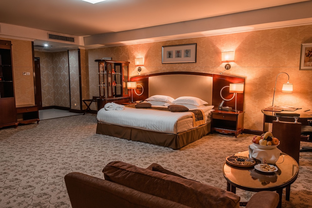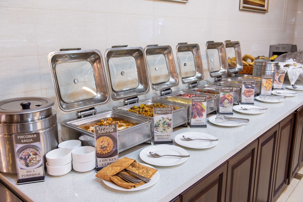We chose the Miran when flying in and out of Tashkent to/from UK as it's a short drive to the airports (international and domestic) and also from the railway station coming back on the bullet train. It is also 15 minutes easy walk (2 min taxi) to our preferred restaurant, Alfonso Restaurant- excellent food and reputation. The hotel is very large with all rooms having huge floor space and all amenities and is quite grand with uniformed staff and room service (selection on the TV inyour room). The rooms have robes, slippers, flat screen TVs. and the bathroom has the usual toiletries including a shaving kit and toothbrush and toothpaste should you have forgotten or run out. Very large comfortable bedds with crisp white linen. The breakfasts are buffet affairs with a huge array of choice and good strong coffee, and whilst we were there live music to entertain during the experience. There is an exchange, useful for changing excess monies back to stirling shoud you have notes left over before returning home, and we found all the staff friendly, efficient, and helpful. The only con perhaps is the bar is more expensive than necessary. We did not eat here in the evenings so cannot comment. However we would recommend this hotel as ideal for transitioning Tashkent.