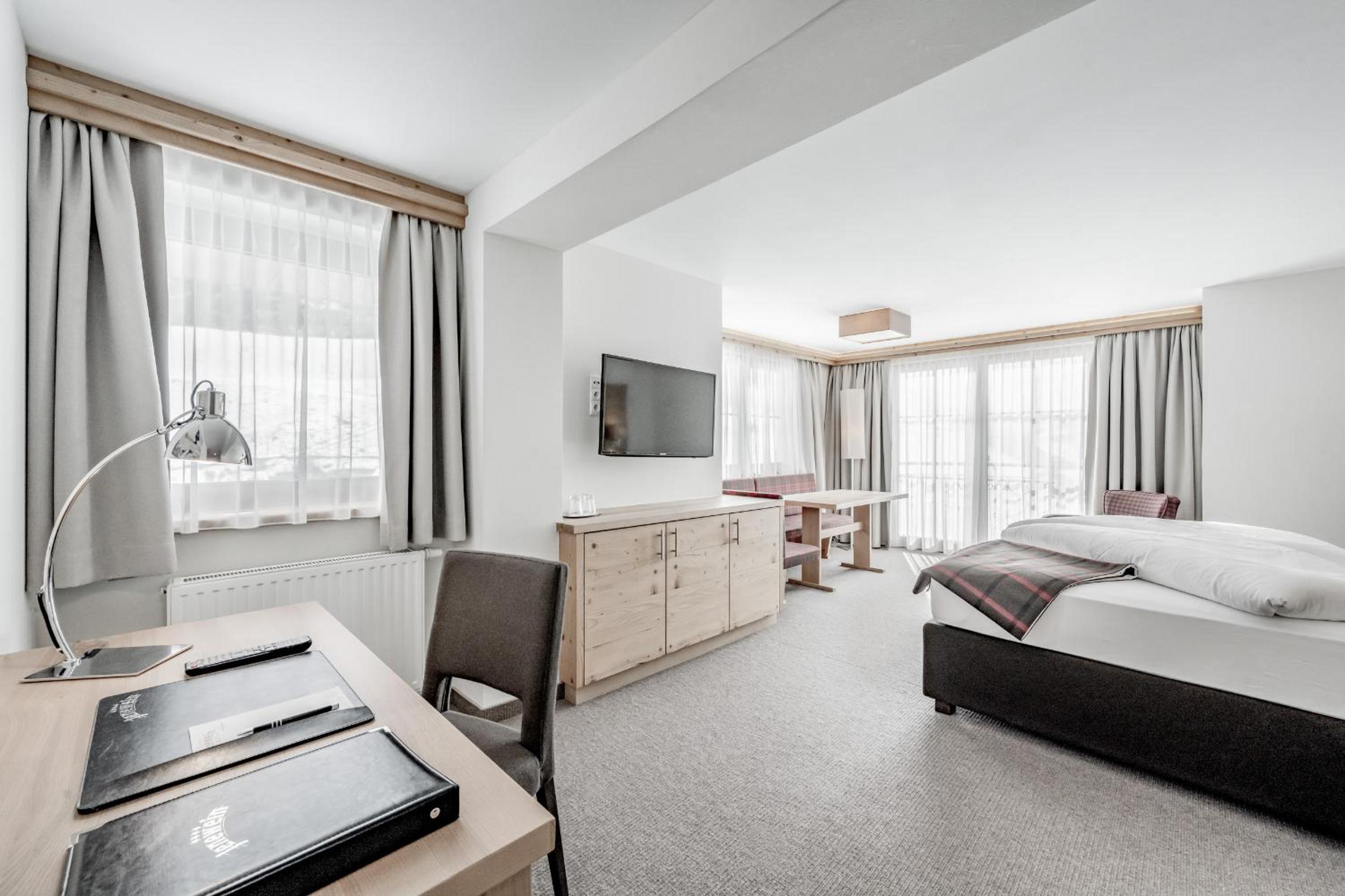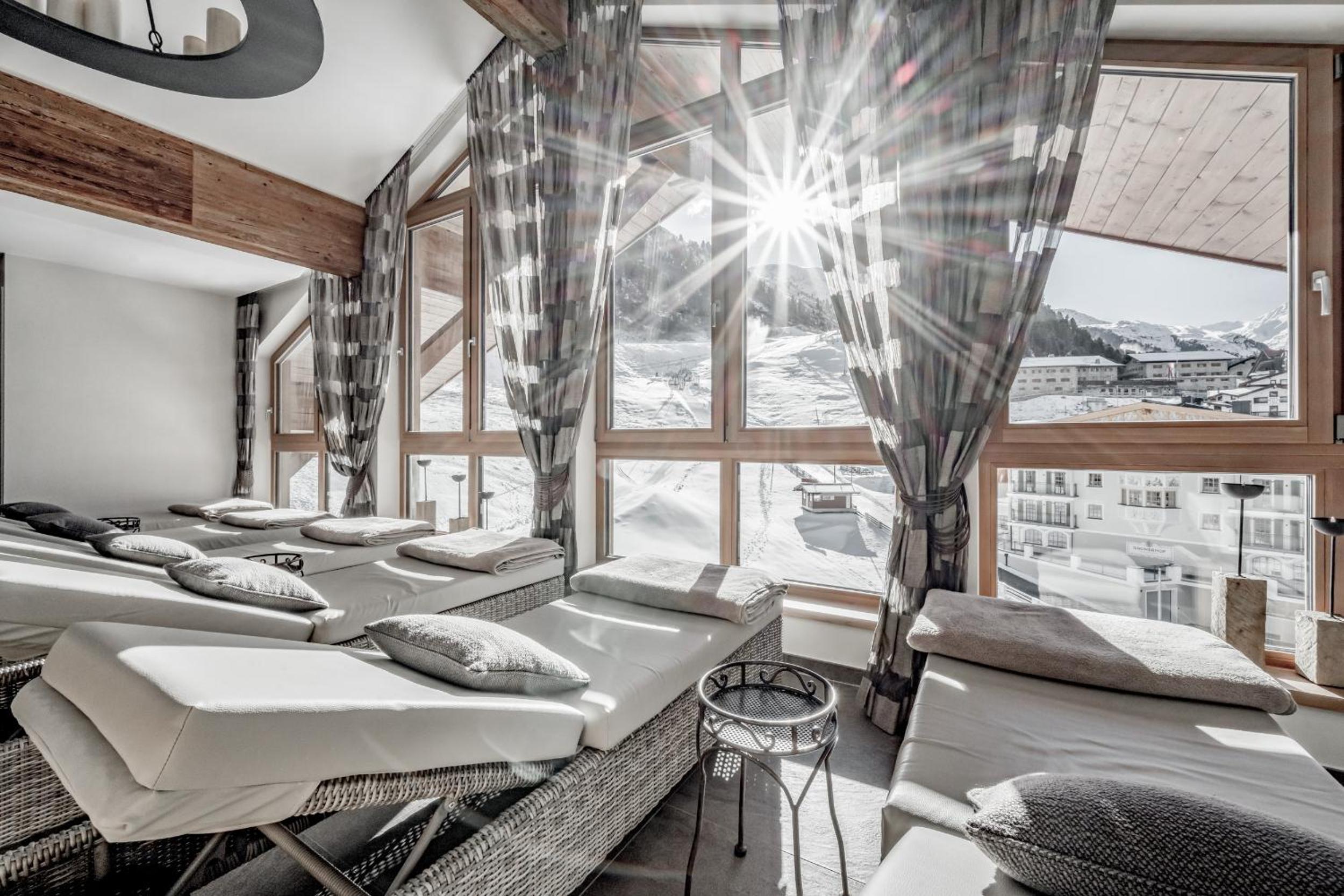 Relaxing Spa and Gourmet Dining: Unwind in the top-floor spa area with a hot tub, steam bath, and sauna, or indulge in a massage. Enjoy traditional Tyrolean cuisine at the restaurant overlooking the slopes.