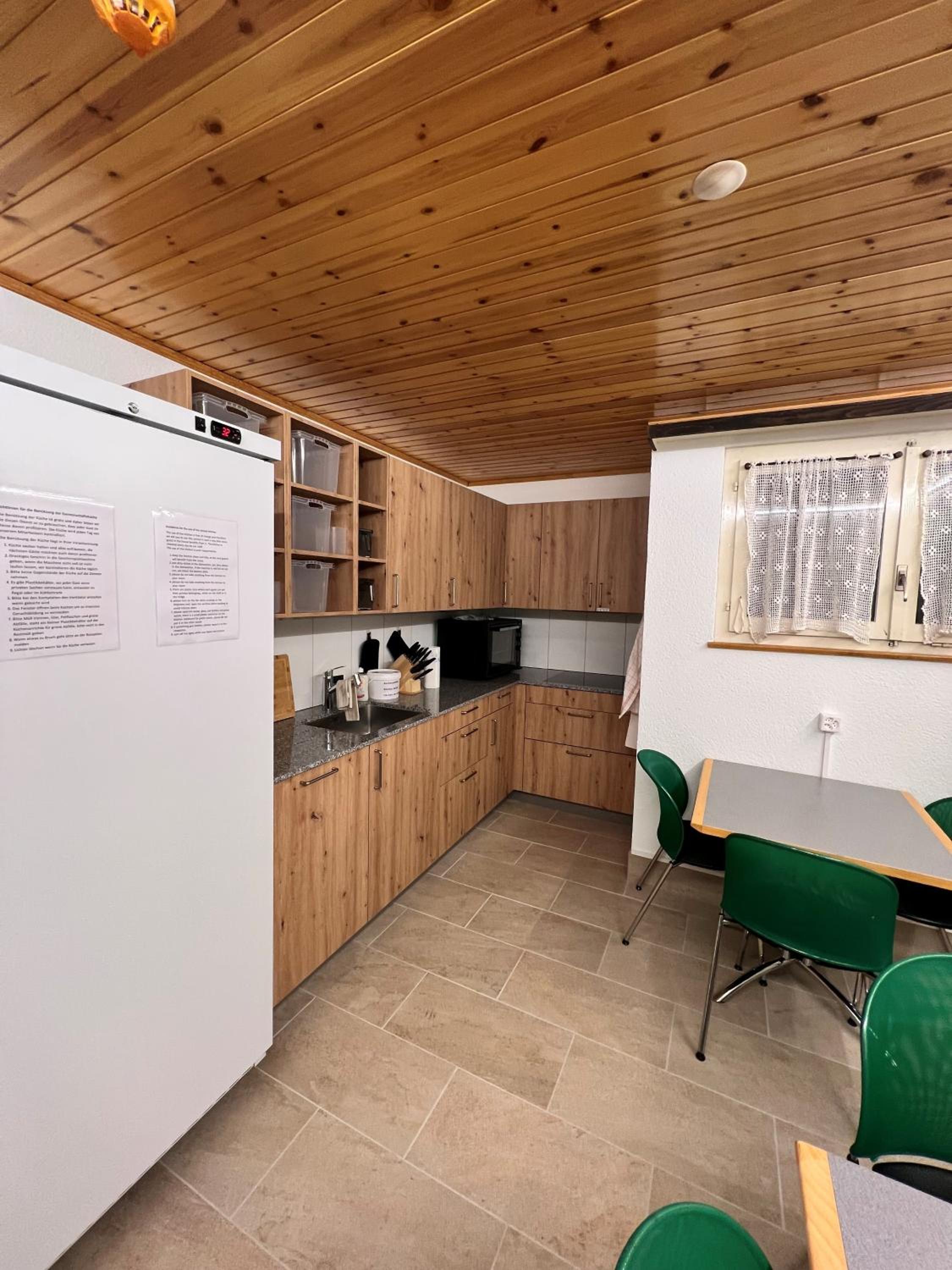 finnische Sauna im Original Zustand vorhanden, Gemeinschaftsküche mit grossem Kühlschrank für Selbstversorger