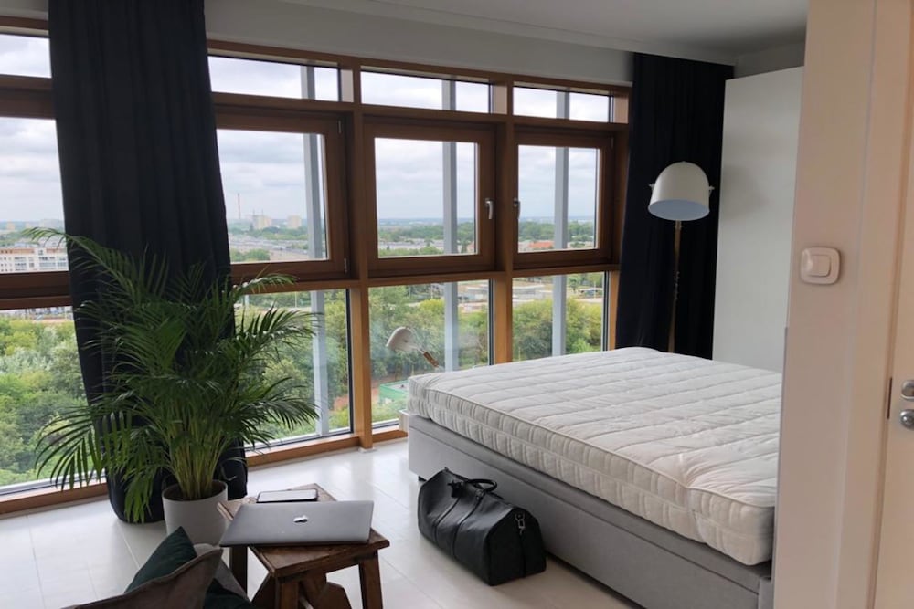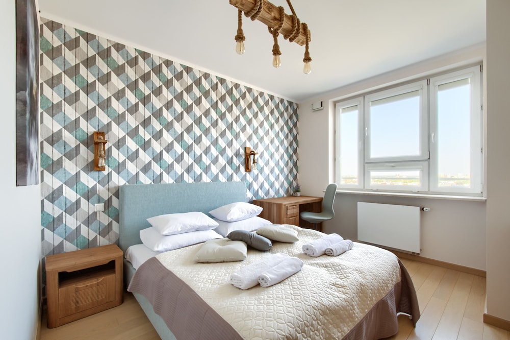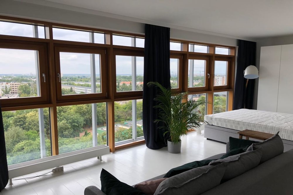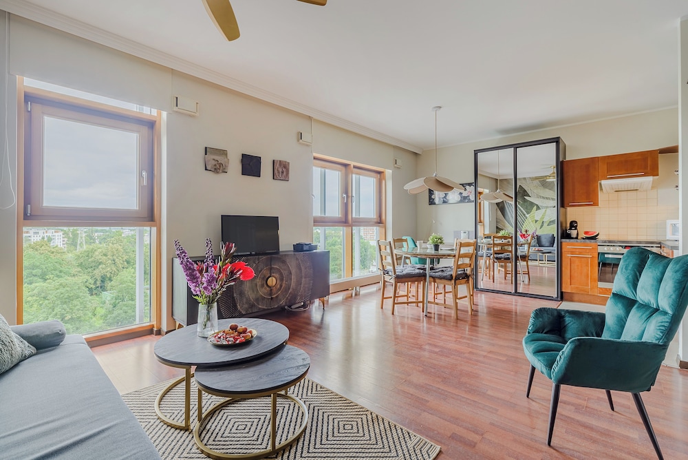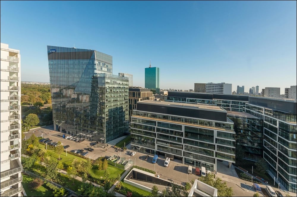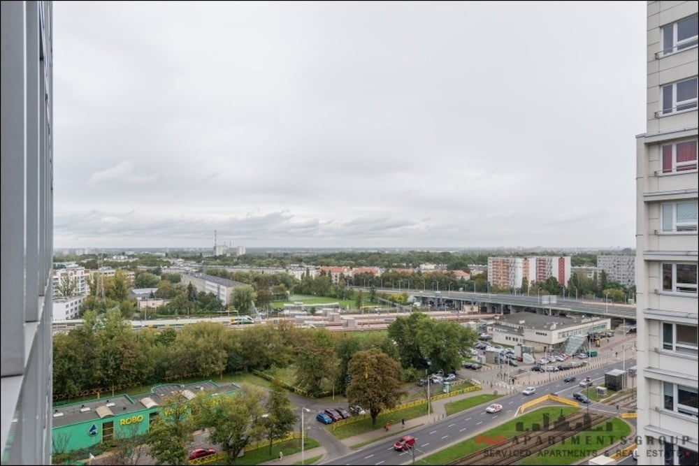 Spacious bright apartment with all mod cons. Easy to relax and take in views over the city. Fairly quiet despite location at a busy intersection with direct access to railway and underground. Short walk to the Vistula and 5 minute walk to shopping centre.
