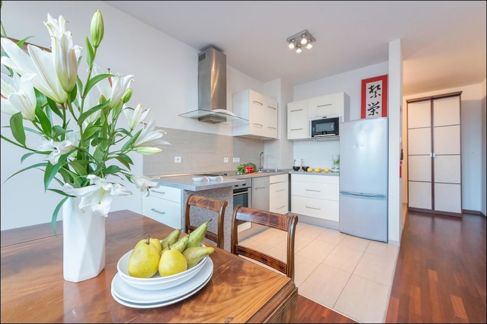 A spacious well maintained apartment with all necessary facilities provided where you can make yourself very comfortable. Close to a tram, bus and metro hub which affords easy access to Oldtown the CBD and Centralna rail station. The extensive Arkadia shopping centre it's a mere 10mins walk away. 24 hour security guard, dead locks on all entrances and CCTV plus safes in all rooms ensures personal safety.