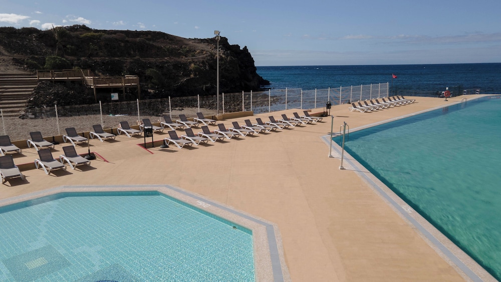 The pool is amazing when clean, but often has green slime and weeds in because it is seawater, so can be cleaned upto 3 times a week, at 1.30pm, so some afternoons unable to use. Apartment very nice but only cleaned once in 9 days. Locals pay 7 euros to use pool and can take in their own food and drink, but paying guests are not allowed to do this! Very dangerous around bar / restaurant area with steep unmarked steps, tables and chairs hiding the actual steps. My husband and I use wheelchairs, we have stayed here many times, after my last review the reception manager phoned me to ask me to give a higher score in return for a promise that if we had a special request on our next booking, they would try to honour it, I asked for a ground floor apartment with morning sun, we were given one on the 3rd floor! A lot of people live in the hotel who have dogs, therefore a lot of dog mess on pavements outside hotel, never once saw a 'poo bag'. This could be a 4-5 star hotel eventually, but a long way still to go, in my opinion, it is overpriced, espeically meals, Don Pedro far better value for money.