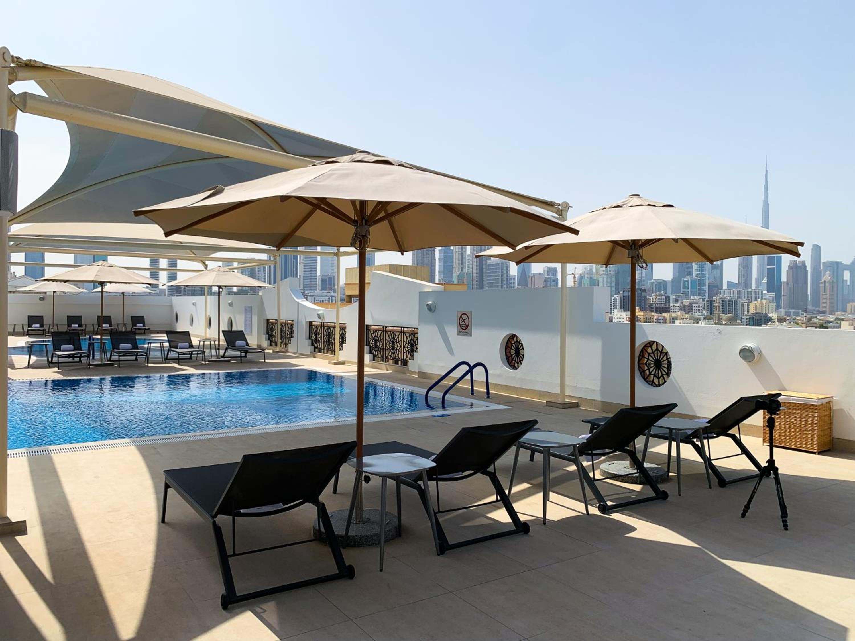 O hotel também tem duas piscinas exteriores e apesar de não as termos usado pela falta de tempo, pareceram ser muito agradáveis. Do terraço da piscina a vista sobre os arranha-ceus do Dubai era ampla.