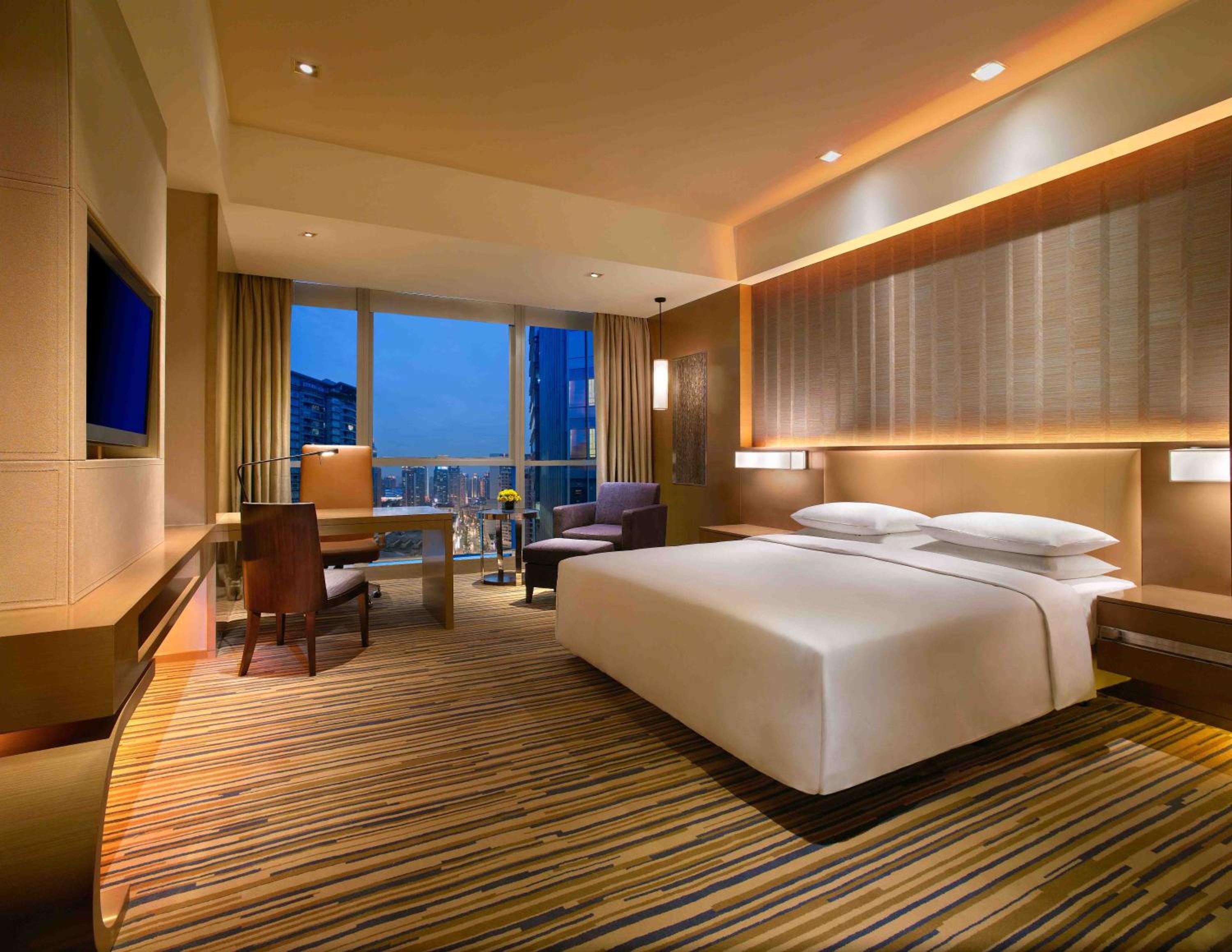 Hyatt Regency Chongqing Hotel offers luxurious guestrooms with modern facilities, providing a comfortable stay for guests. Each room features city views, a flat-screen TV, an iPod dock, and a well-stocked minibar. The private bathrooms are equipped with premium bath amenities, ensuring a relaxing experience.