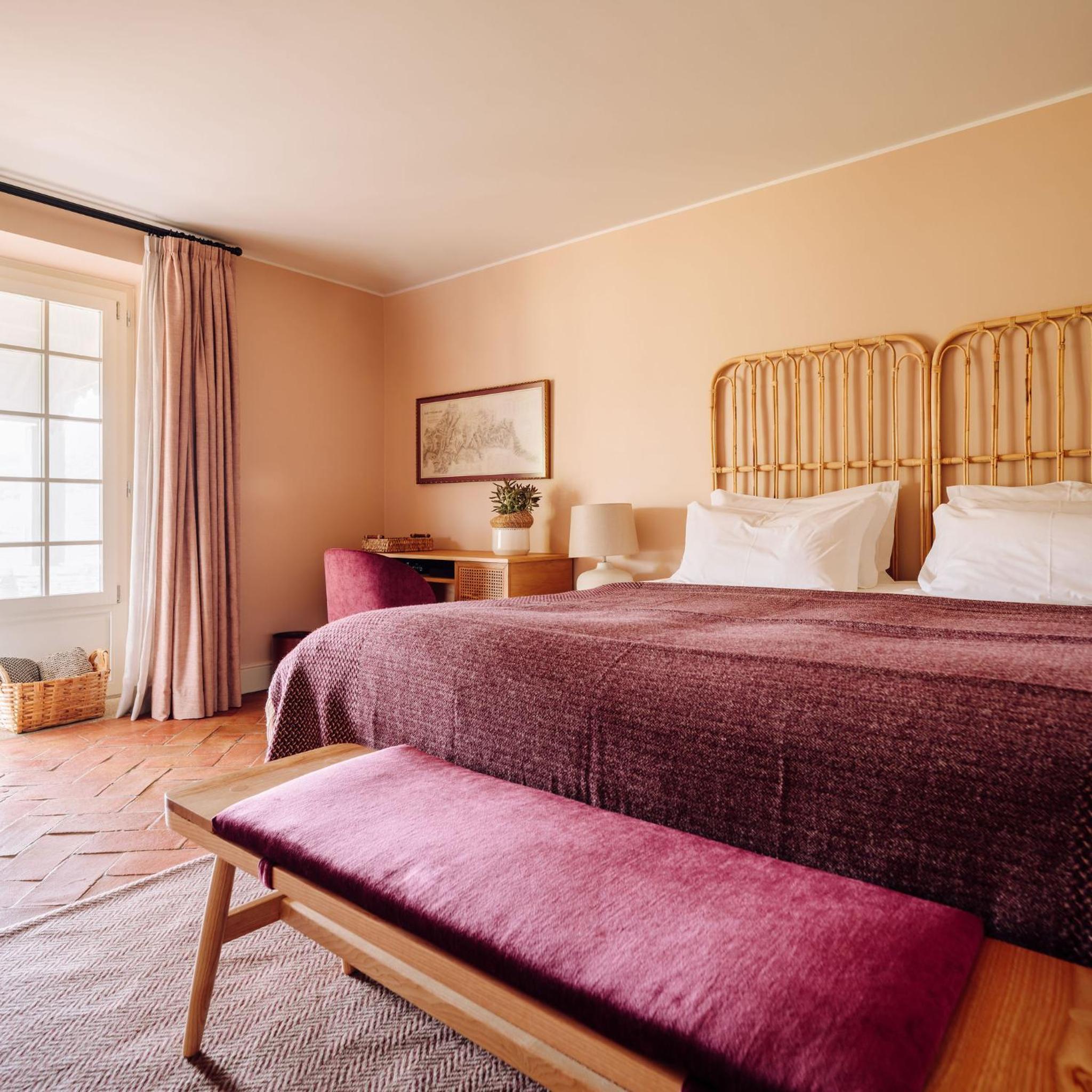 Indulge in elegant guest rooms with panoramic views of vineyards and river for a truly enchanting stay.