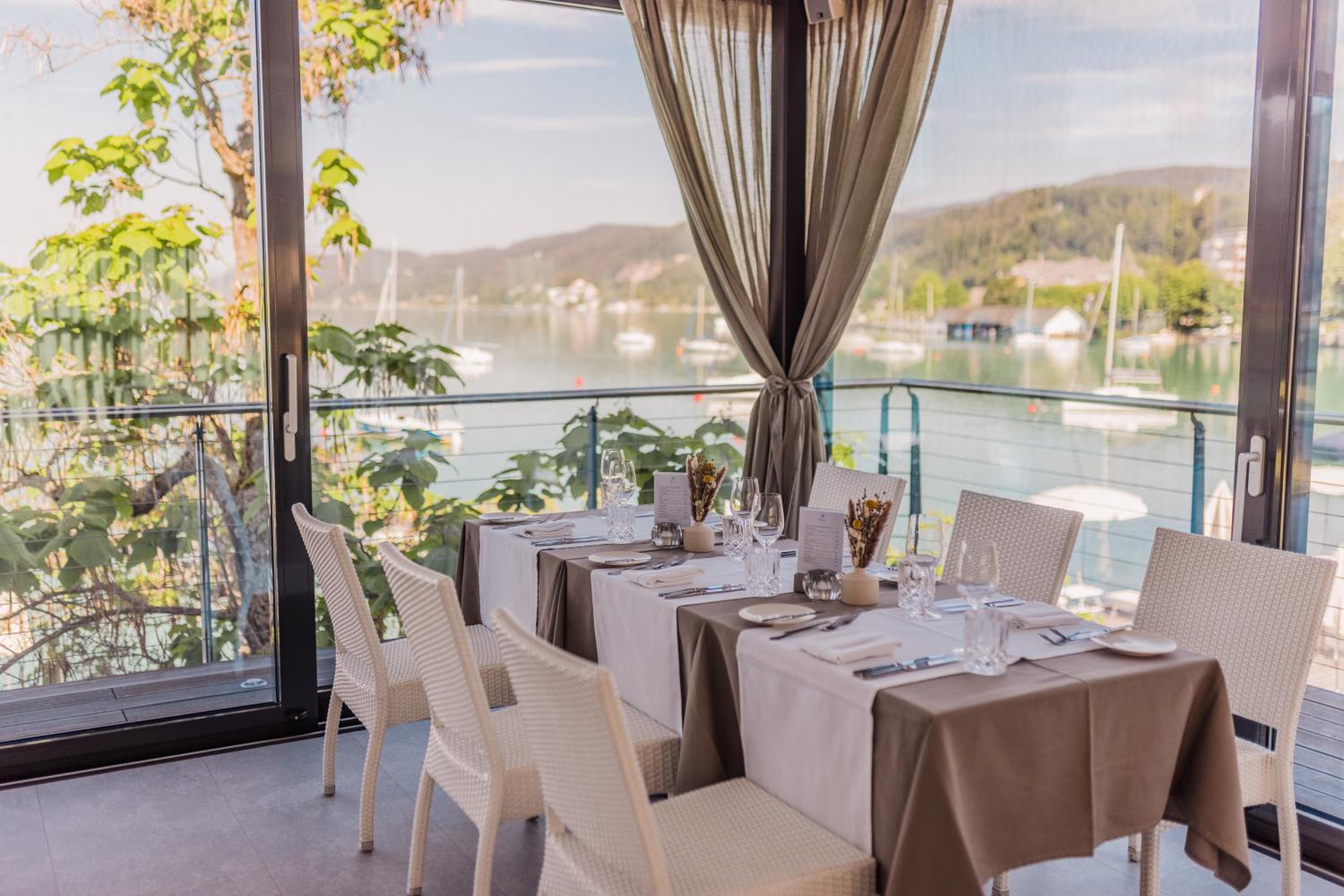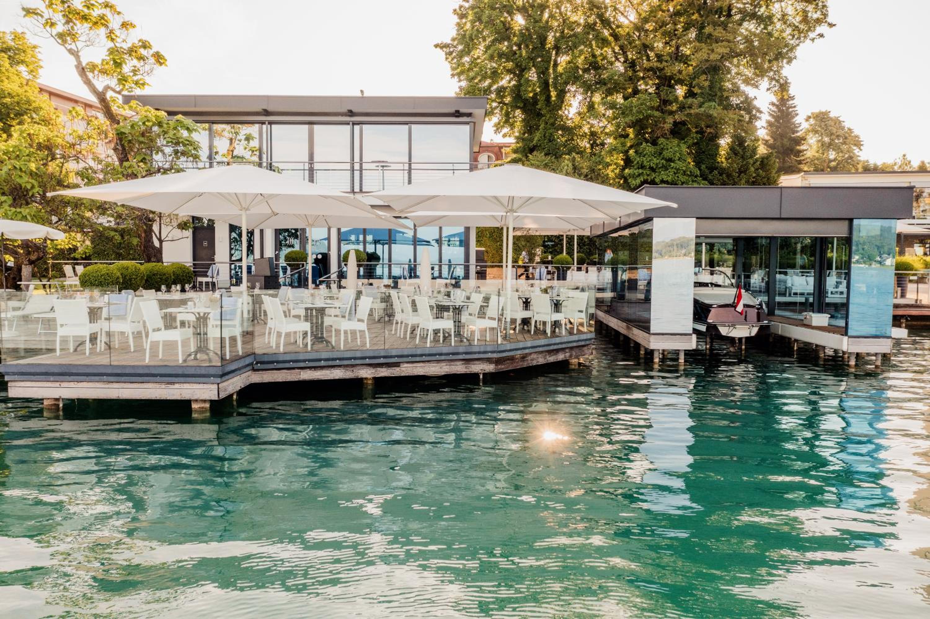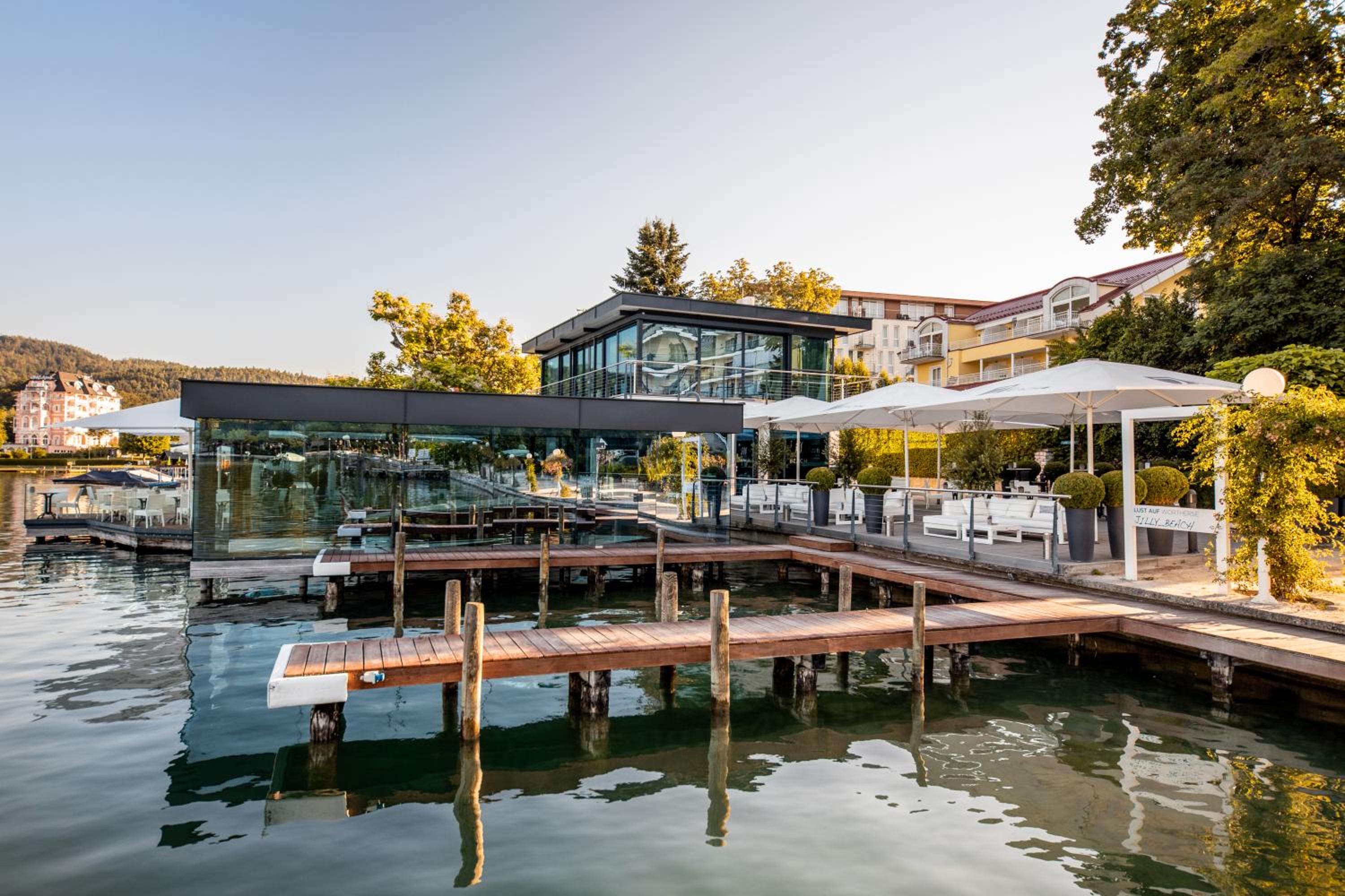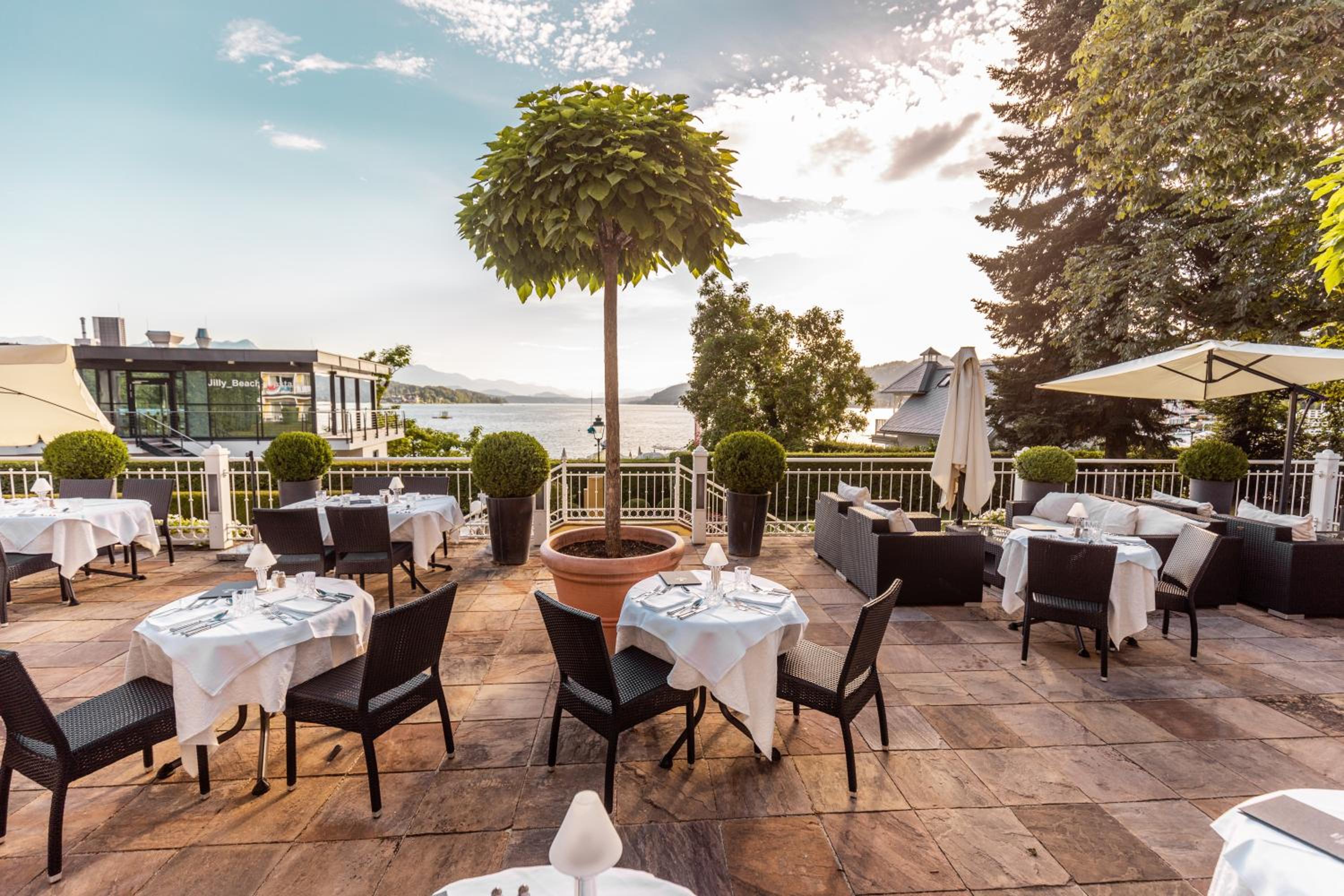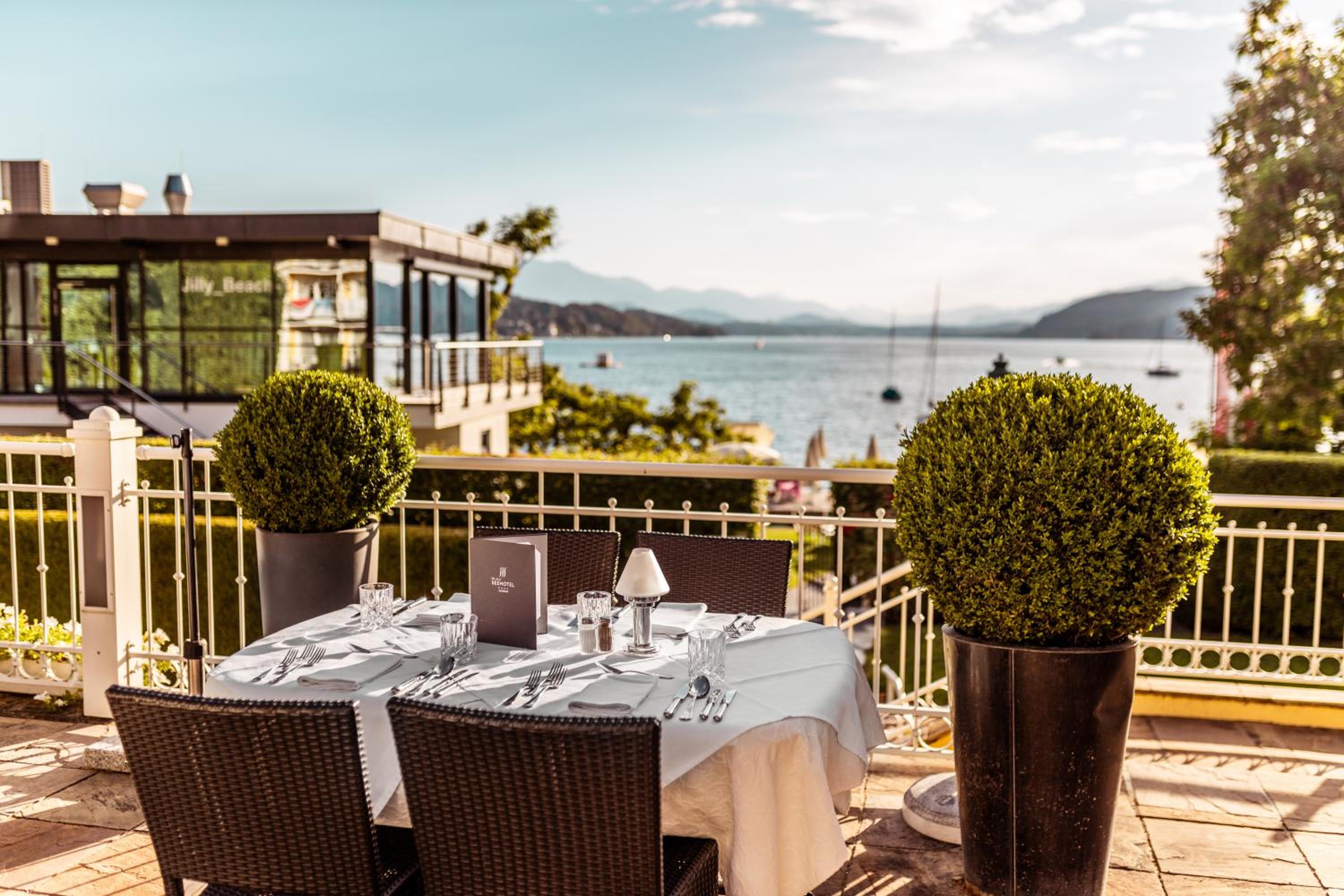 Savor the exquisite culinary offerings at our lakeside bar and terrace while enjoying stunning views of Lake Wörth. Take advantage of the wonderful swimming pier for a truly unforgettable holiday experience. Book now for a memorable stay at Seehotel Dr. Jilly.