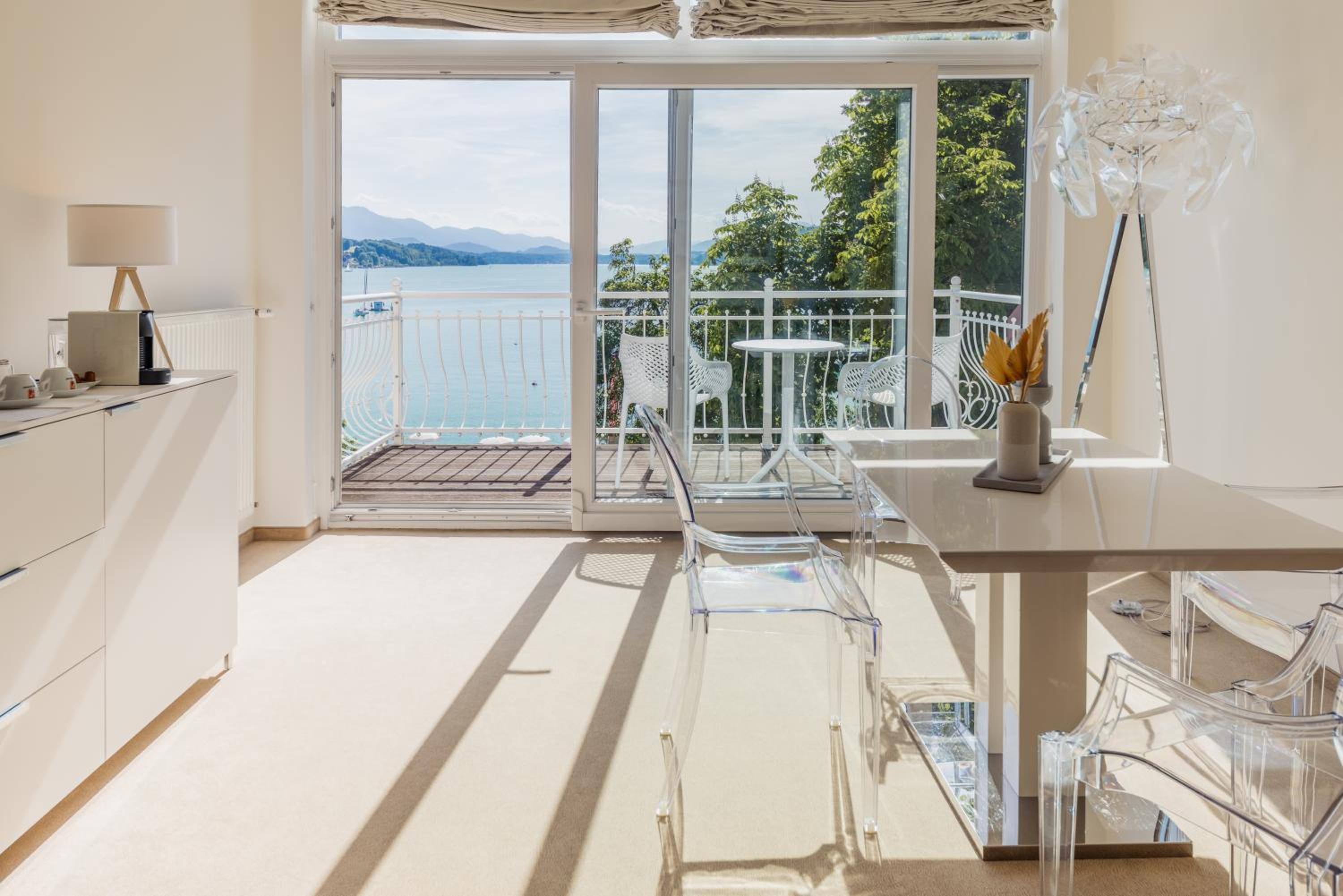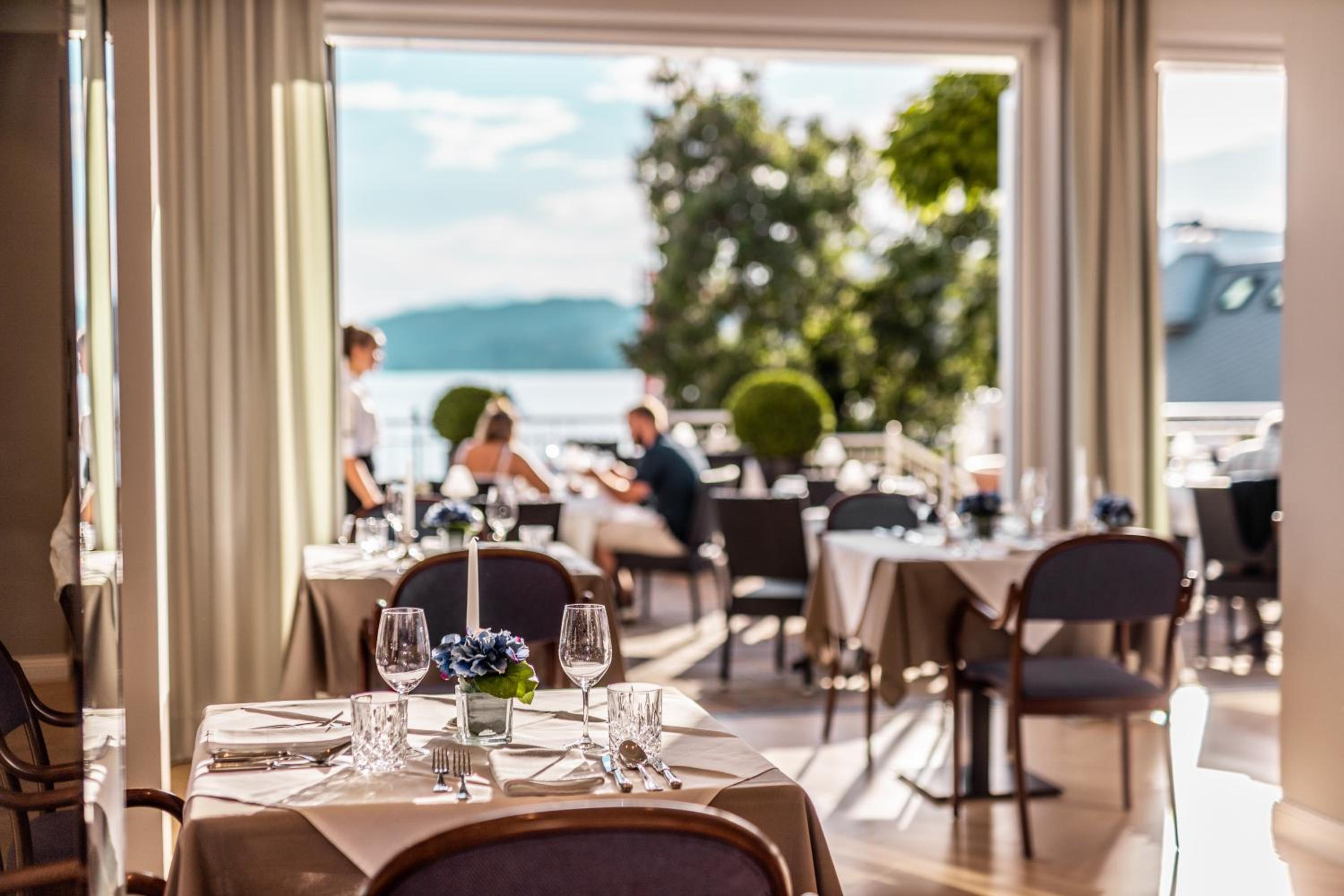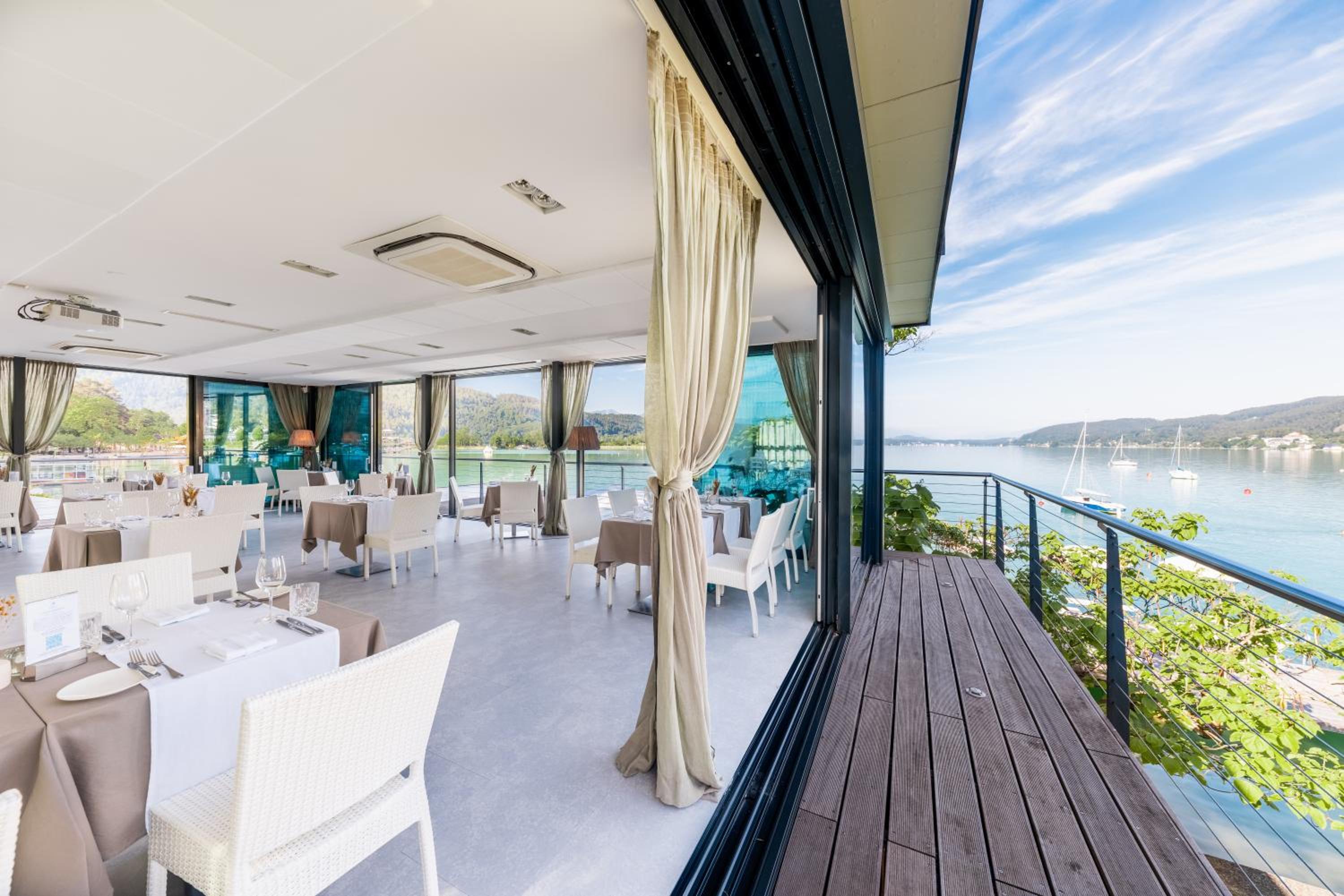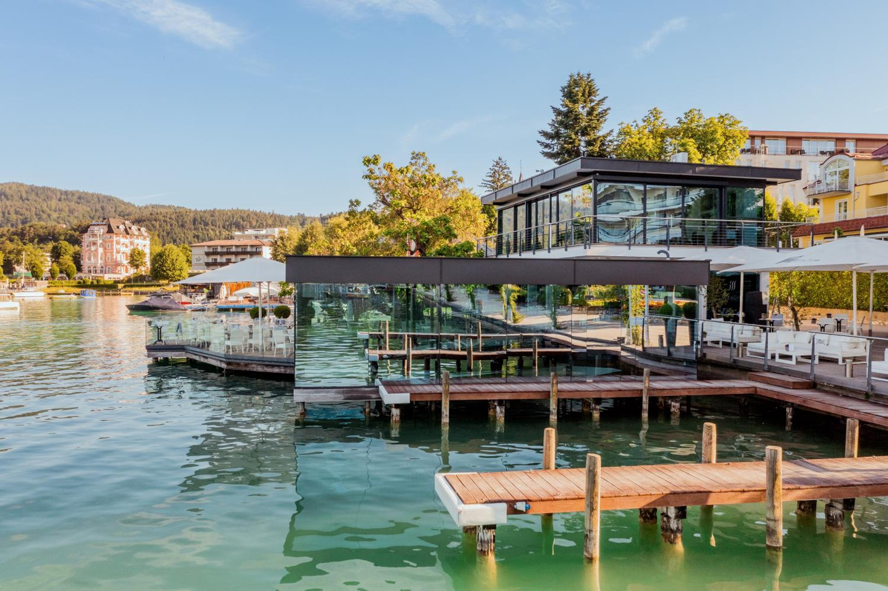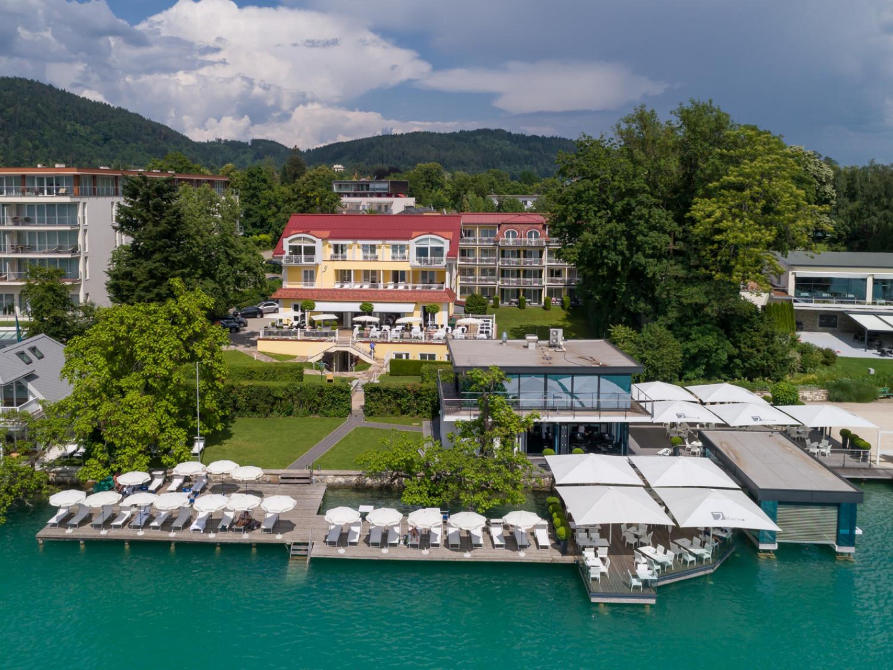 Savor the exquisite culinary offerings at our lakeside bar and terrace while enjoying stunning views of Lake Wörth. Take advantage of the wonderful swimming pier for a truly unforgettable holiday experience. Book now for a memorable stay at Seehotel Dr. Jilly.