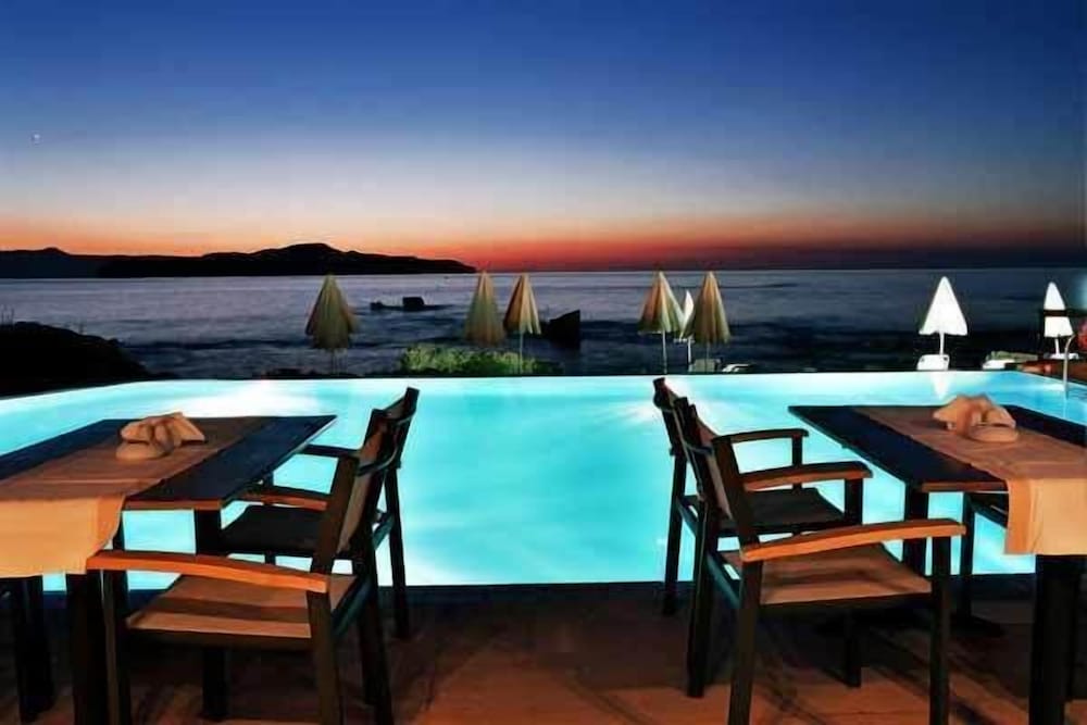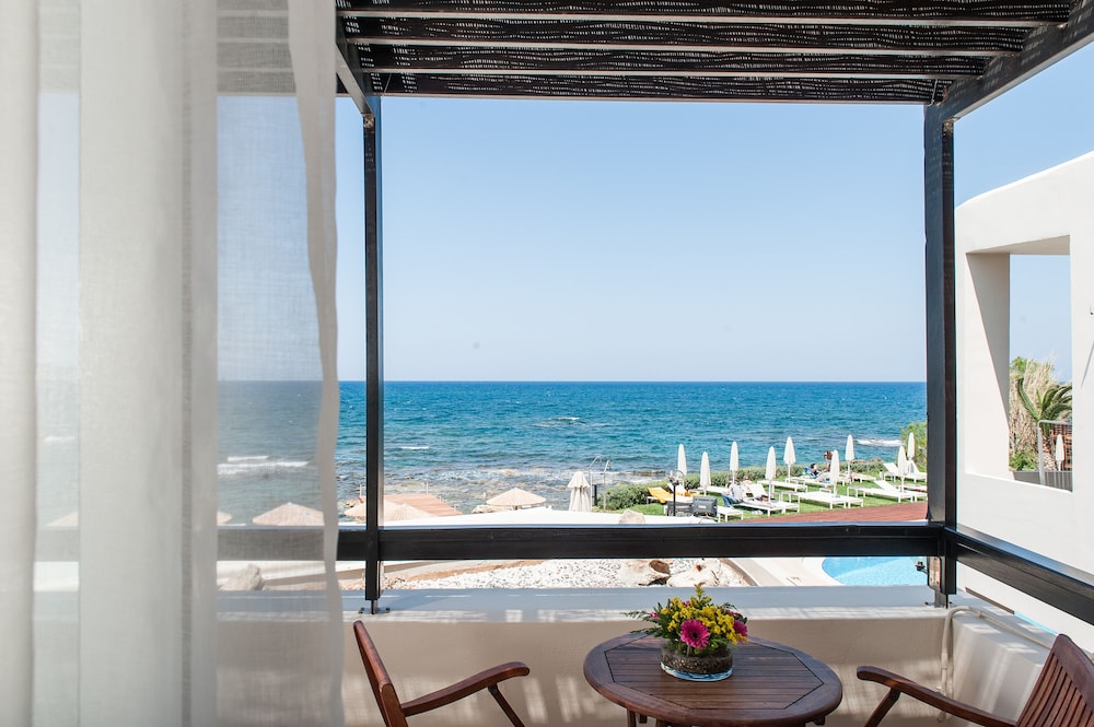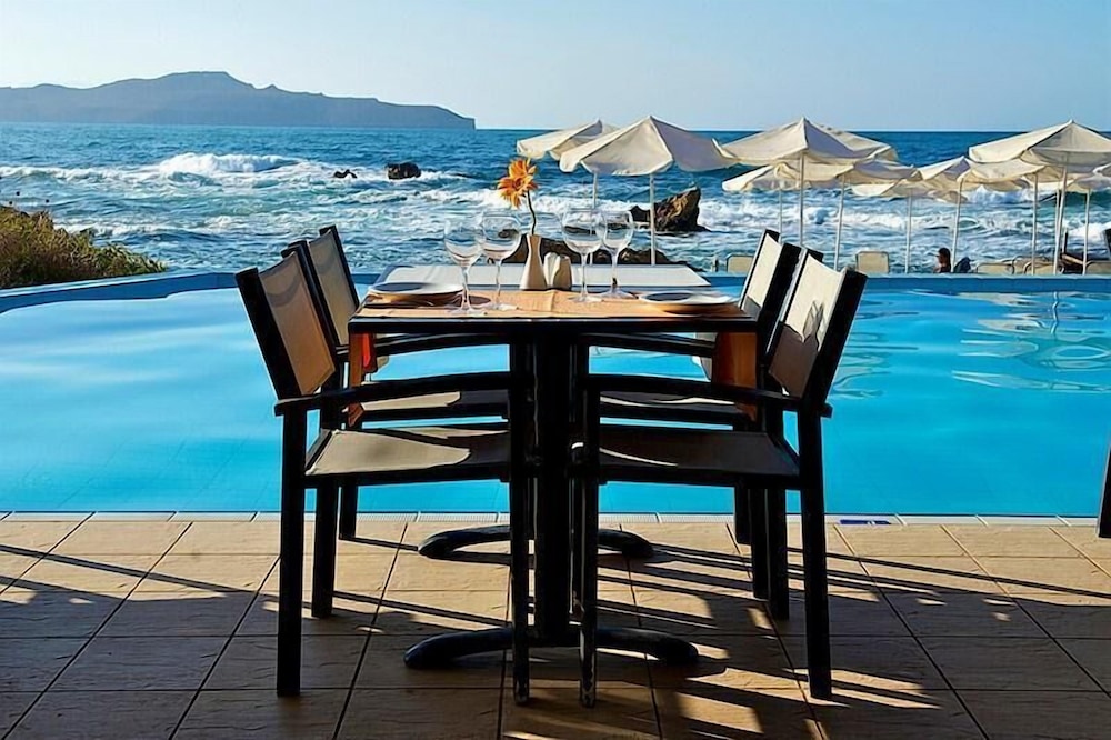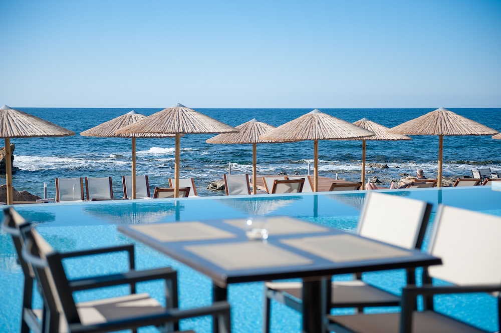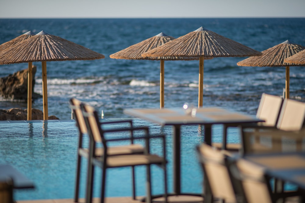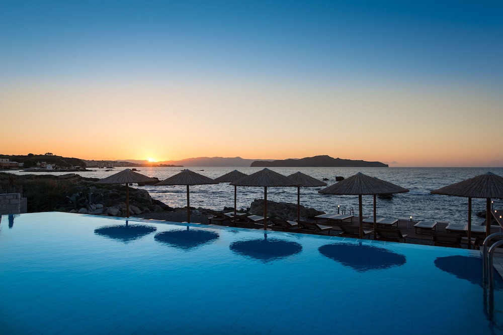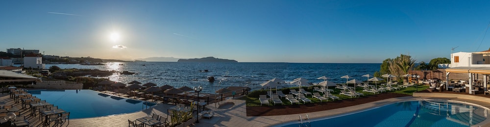 A beautiful hotel. Room was kept spotlessly clean, and very comfortable bed. Friendly staff but not intrusive. Food and drink very reasonably priced, comparable to local restaurants etc. Beautiful clear and clean swimming pools. Lovely pebble beach area, with rocky ocean access via steps. Perfect for snorkeling, though take beach shoes. Sandy beach few minutes walk from hotel if preferred. Most amazing sunset views from hotel every day. Bus stop just outside for easy 20-30 minute inexpensive ride into Chania old town. A handful of nice shops, supermarkets and restaurants within short walking distance.