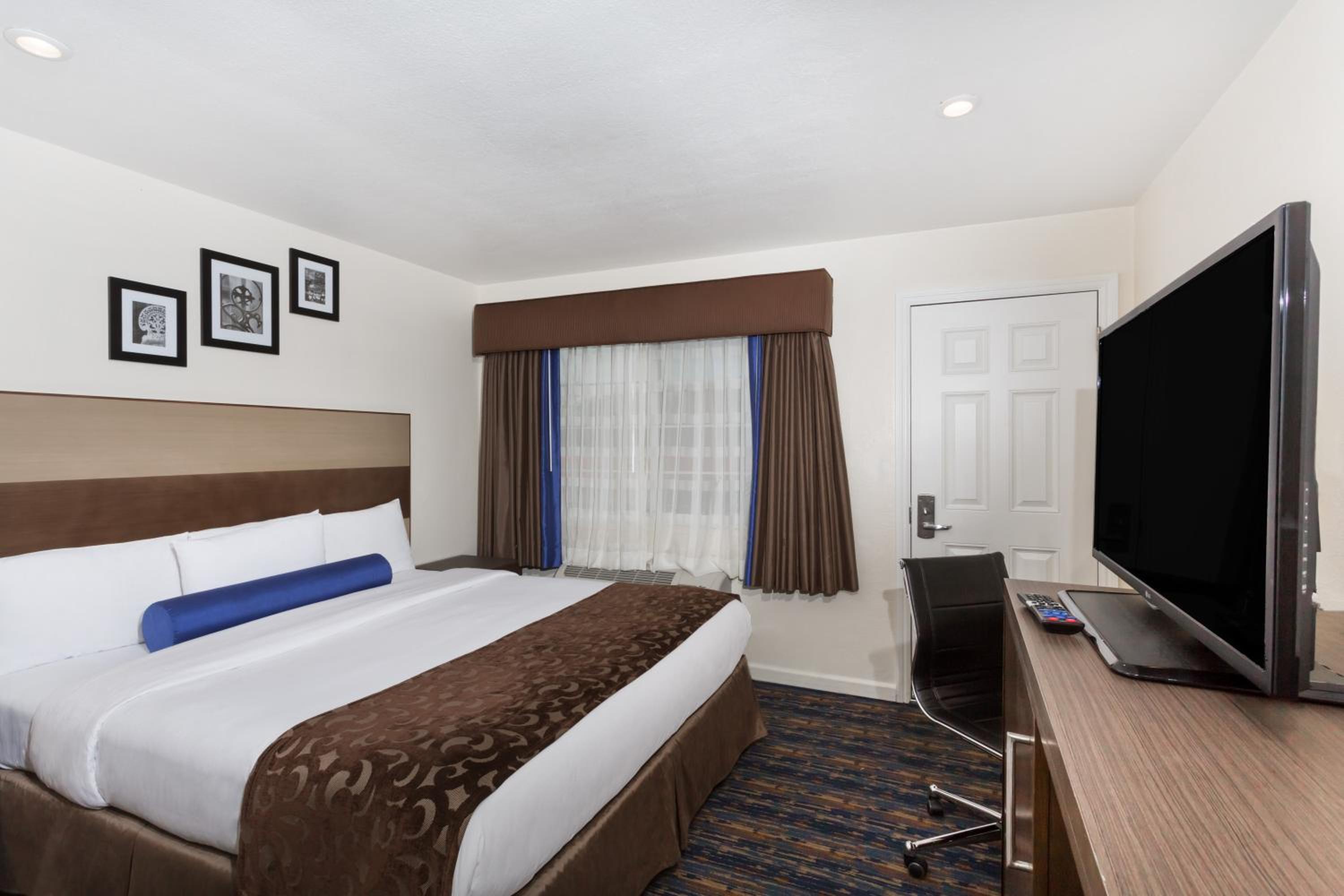 The room was clean and bed was comfortable. Beyond that, not much to recommend it. Bathroom door did not fully close; fridge barely cold enough; smoke detector covered with plastic(!!); furnishings pretty beat up.