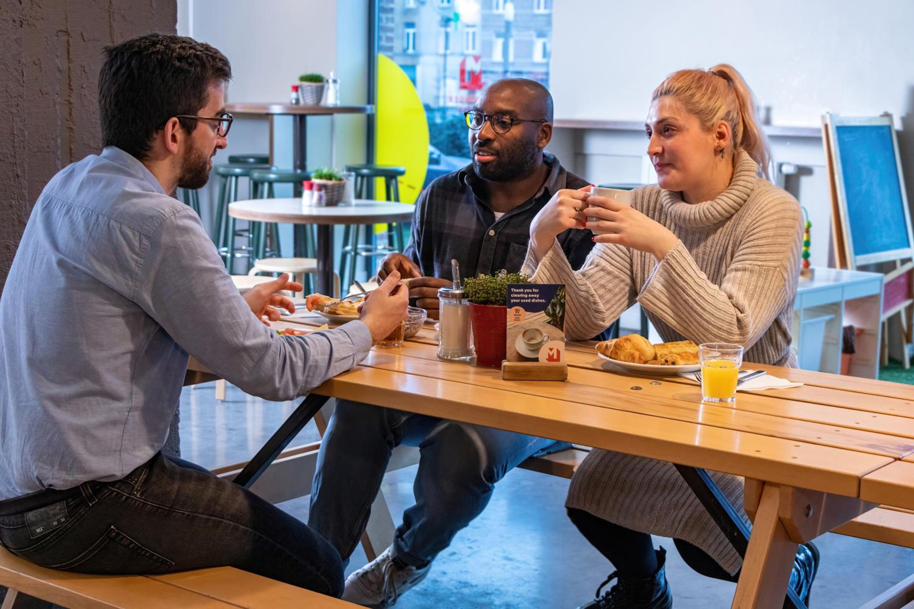 Each modern room at Meininger is thoughtfully designed with light grey walls and parquet floors. The on-site restaurant and bar maintain the factory style with original concrete ceilings and metal lamps, creating a trendy ambiance for guests to enjoy.