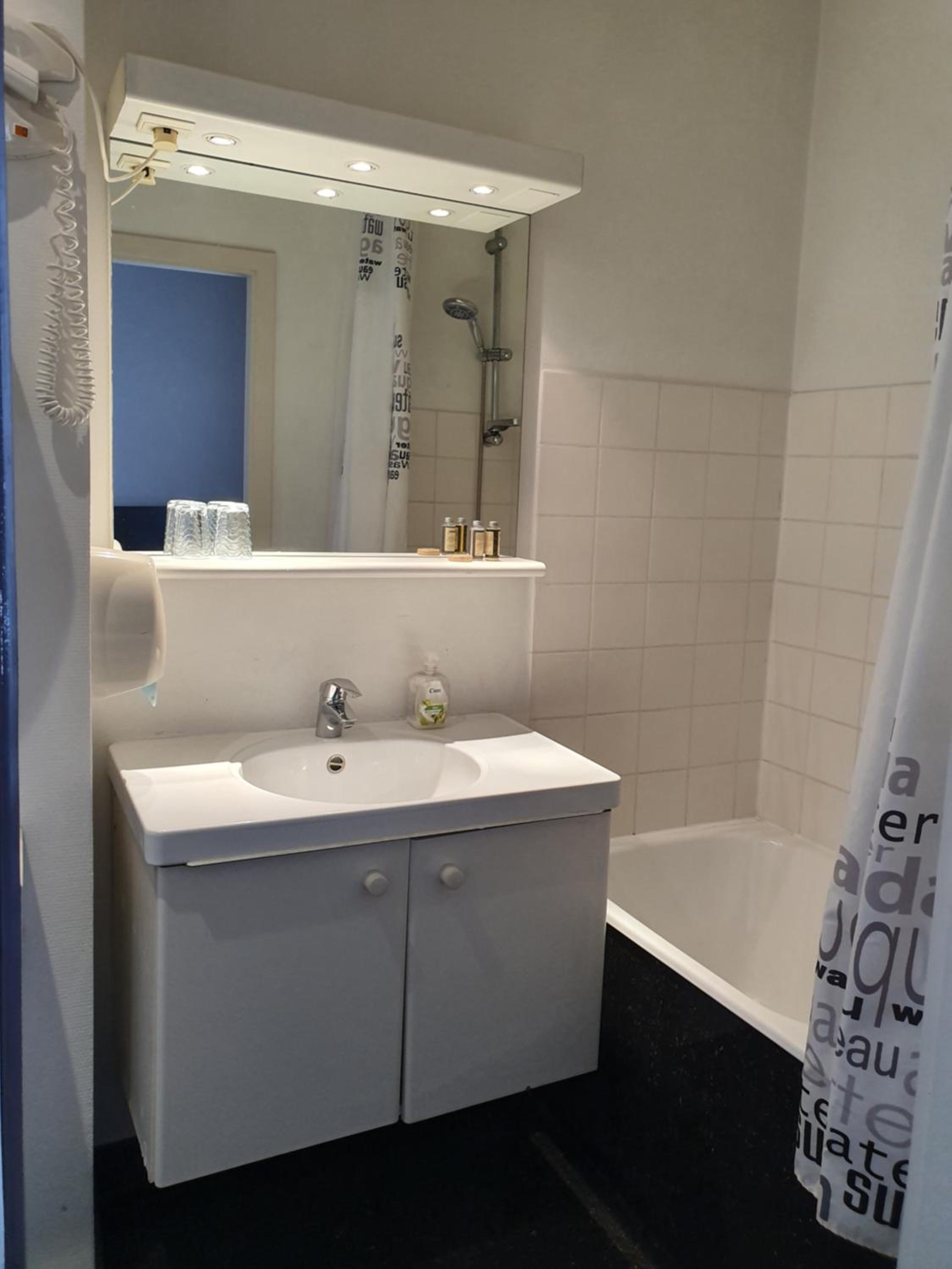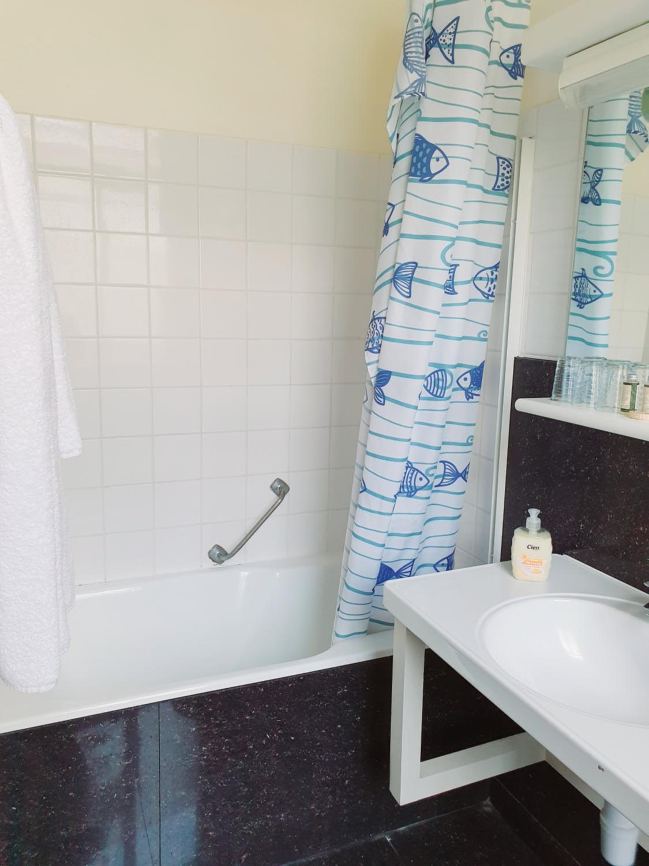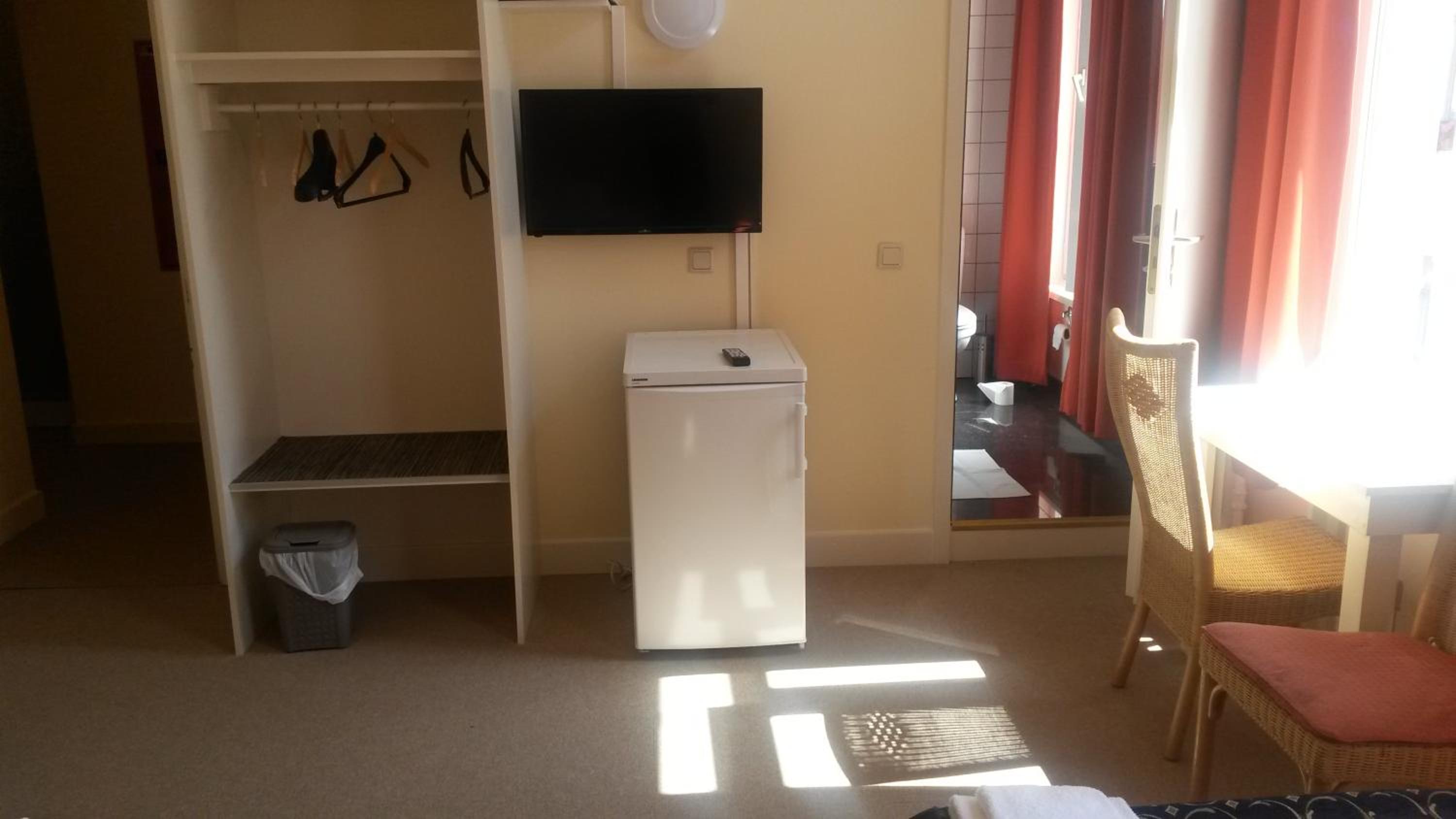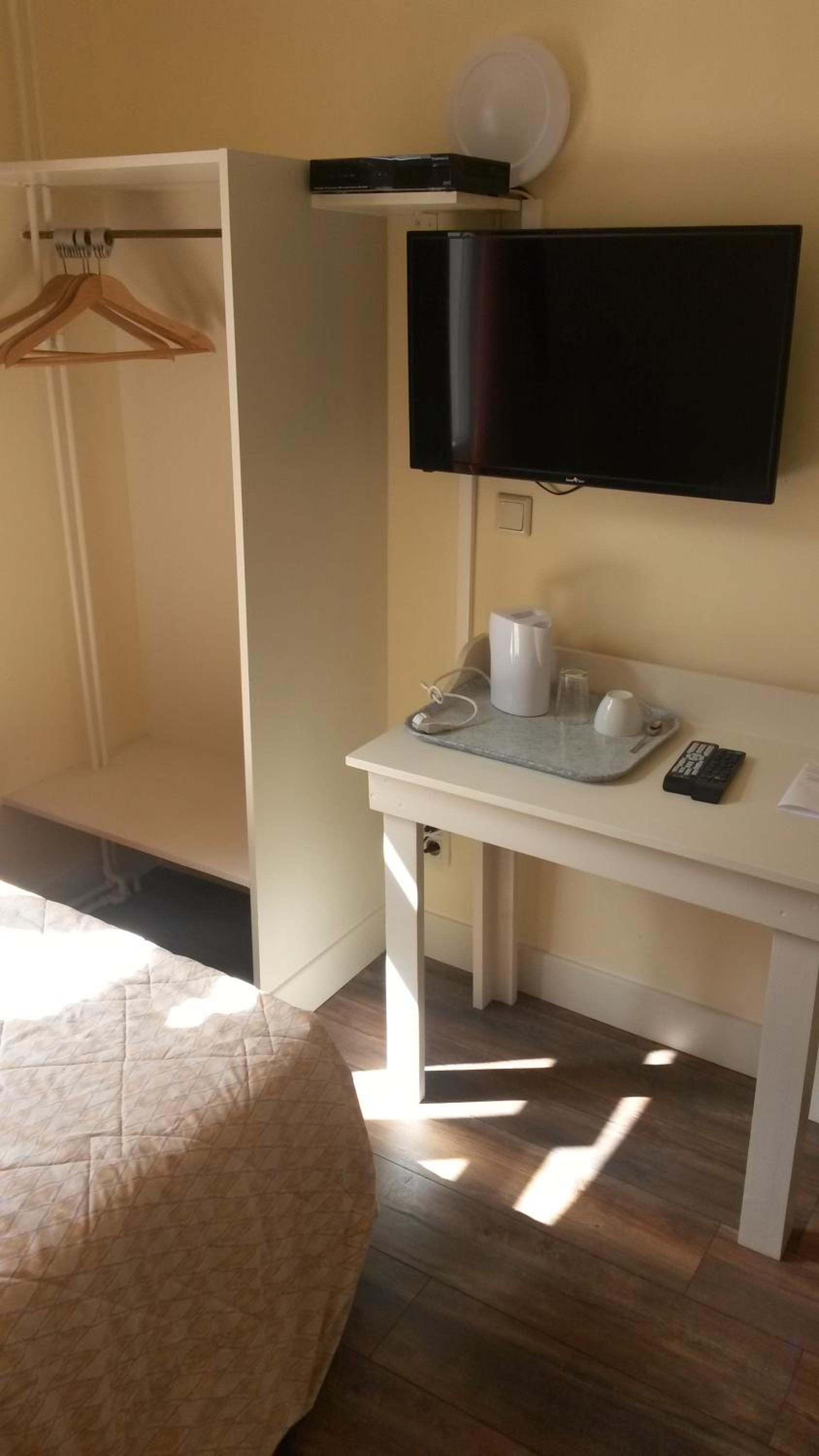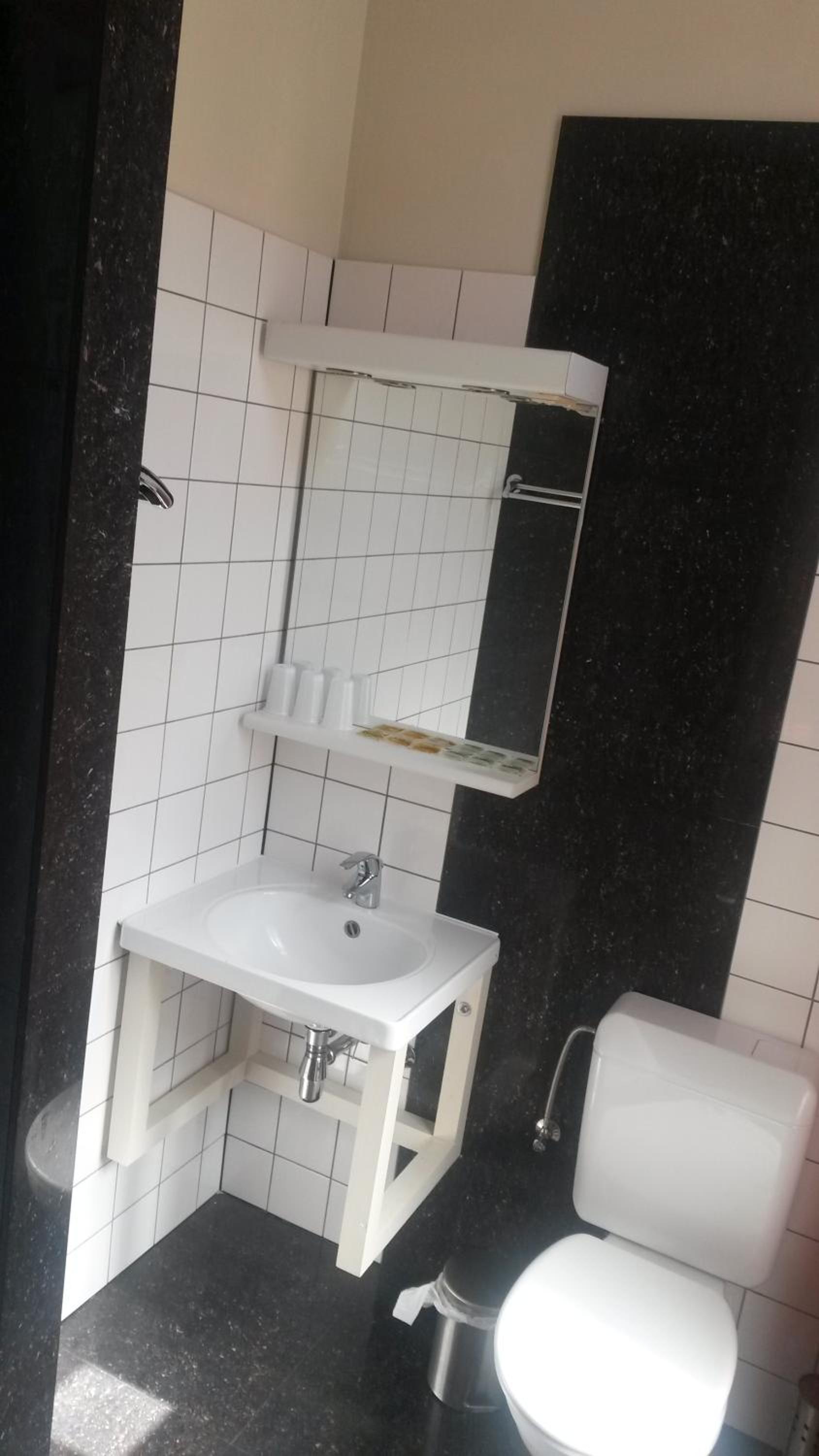 The TV antenna was attached to the wall horizontally; it was only by sheer luck that I didn't injure my eye on it. The shower stall is very narrow. When you're inside, the shower faucet digs into your back, and the curtain sticks to your face and body. It's absolutely impossible to take a shower if you're taller than 140 cm. The shower tray itself wobbles and is coming away from the wall.