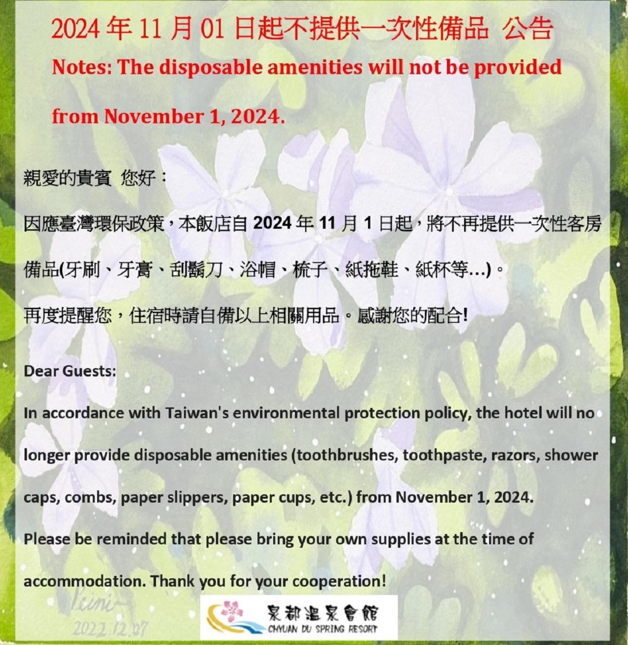 As of 2024/11/01, the hotel will no longer provide disposable hygiene products. Guests please bring your own, thank you for your cooperation.Please inform of your expected arrival time in advance. You can use the Special Requests box when booking, or contact the property directly using the contact details in your confirmation.