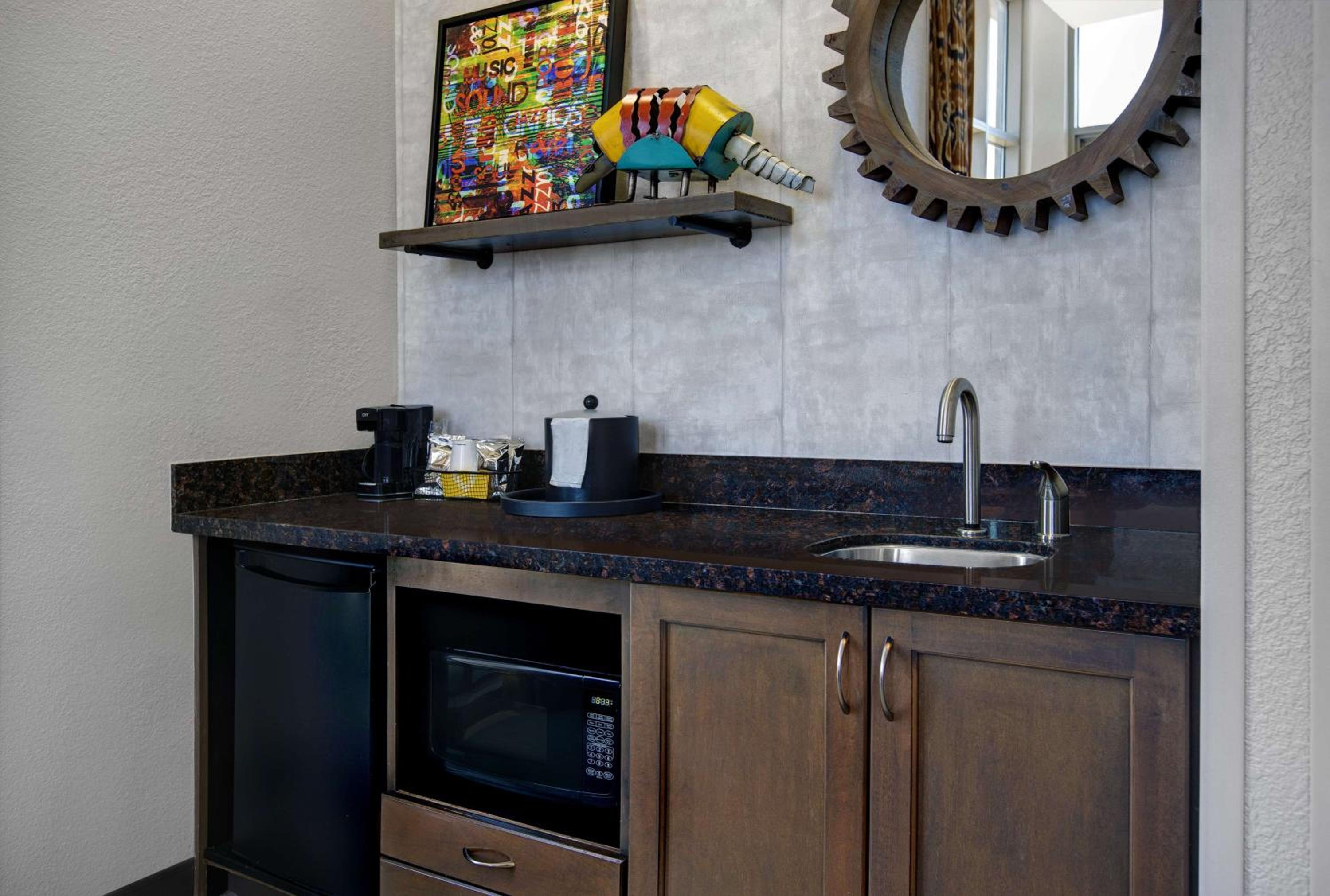 Experience comfort and convenience in our bright, modern guest rooms featuring work desks, ergonomic chairs, flat-screen TVs with free movie channels, coffee machines, refrigerators, and microwaves.