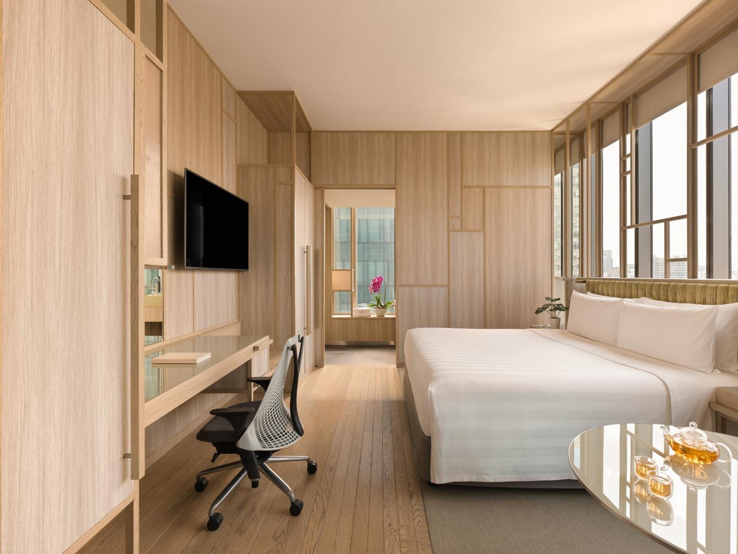 PARKROYAL COLLECTION Pickering, Singapore offers a unique experience with its dedicated wellness floor featuring an outdoor pool, gym, and a 300-metre garden walk high above the street level. Enjoy breathtaking views of the city or the garden from the comfort of your air-conditioned room, equipped with modern amenities.