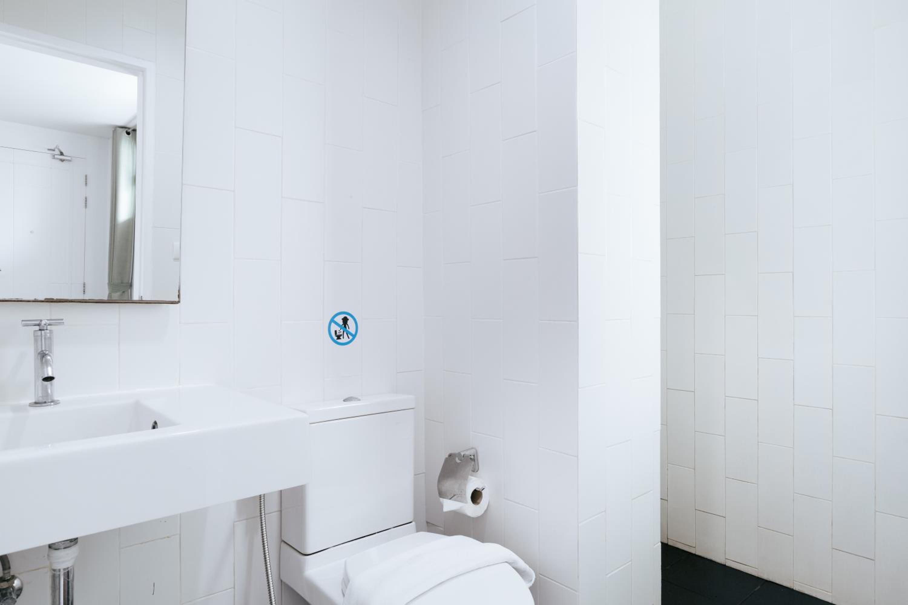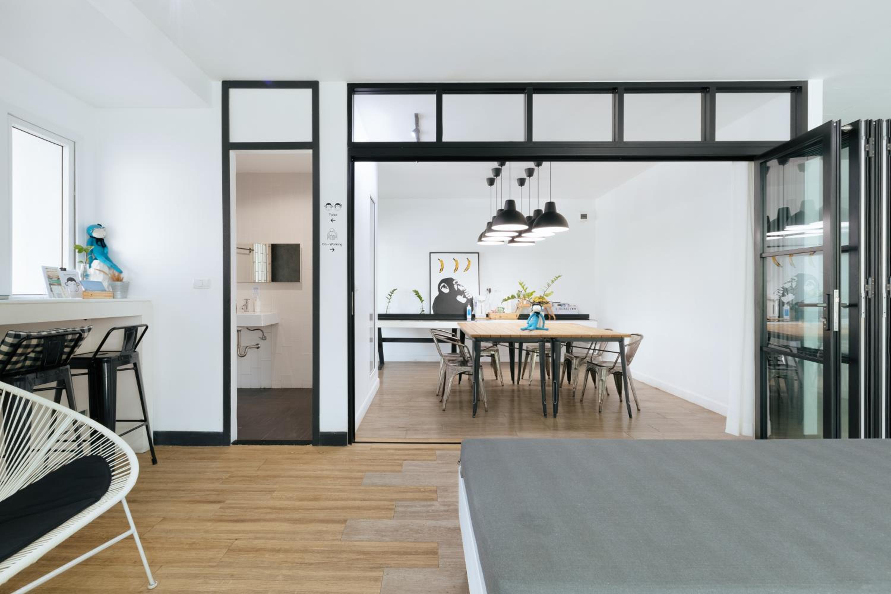 Charming Decor and Amenities: Admire the beauty of neutral tone décor and graphic murals in our fully air-conditioned rooms with hardwood floors. The private bathroom with free toiletries and shower facilities adds a touch of luxury to your stay.