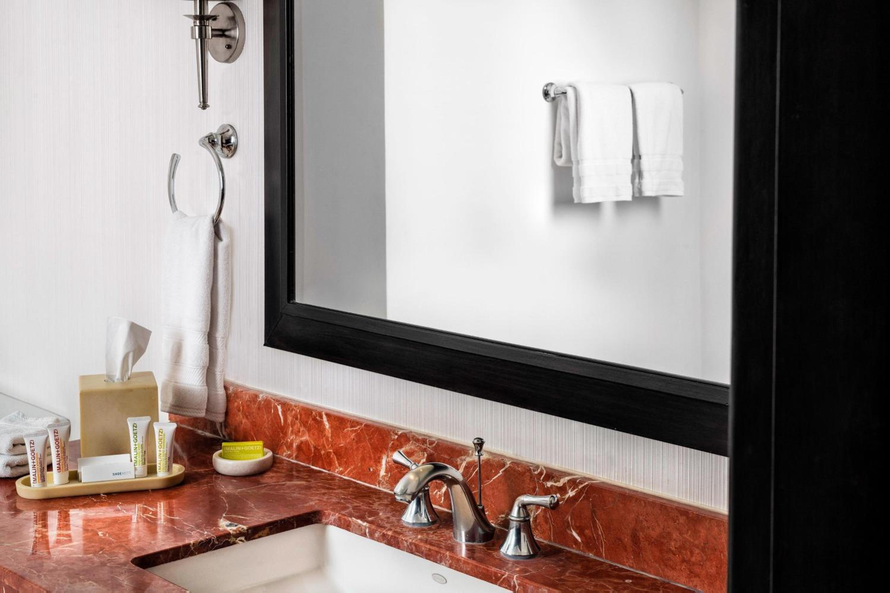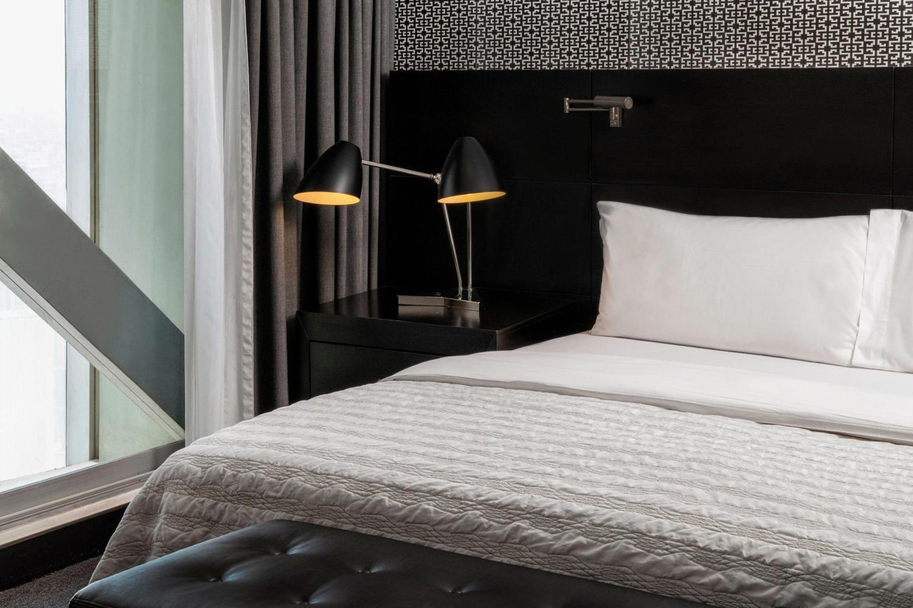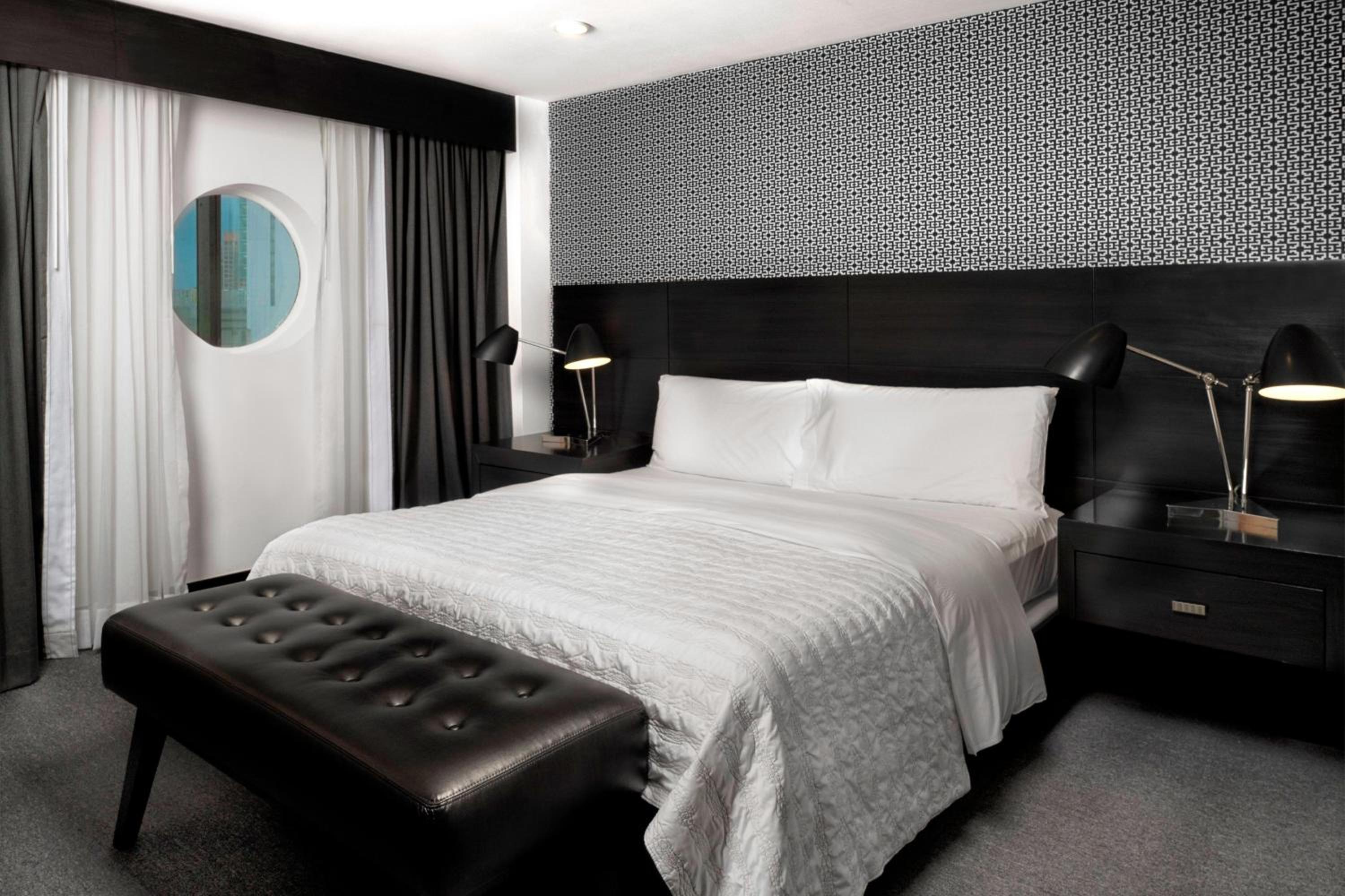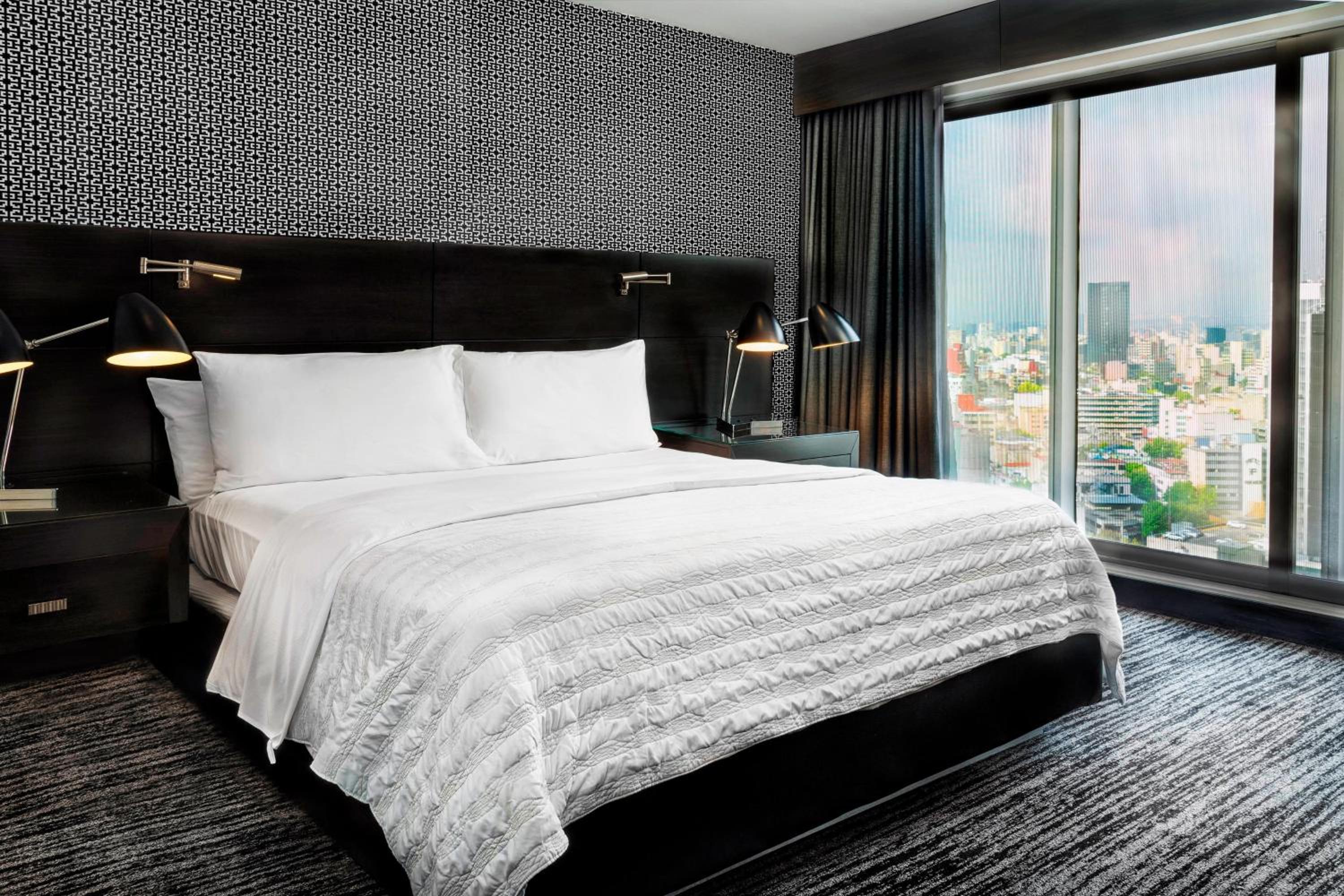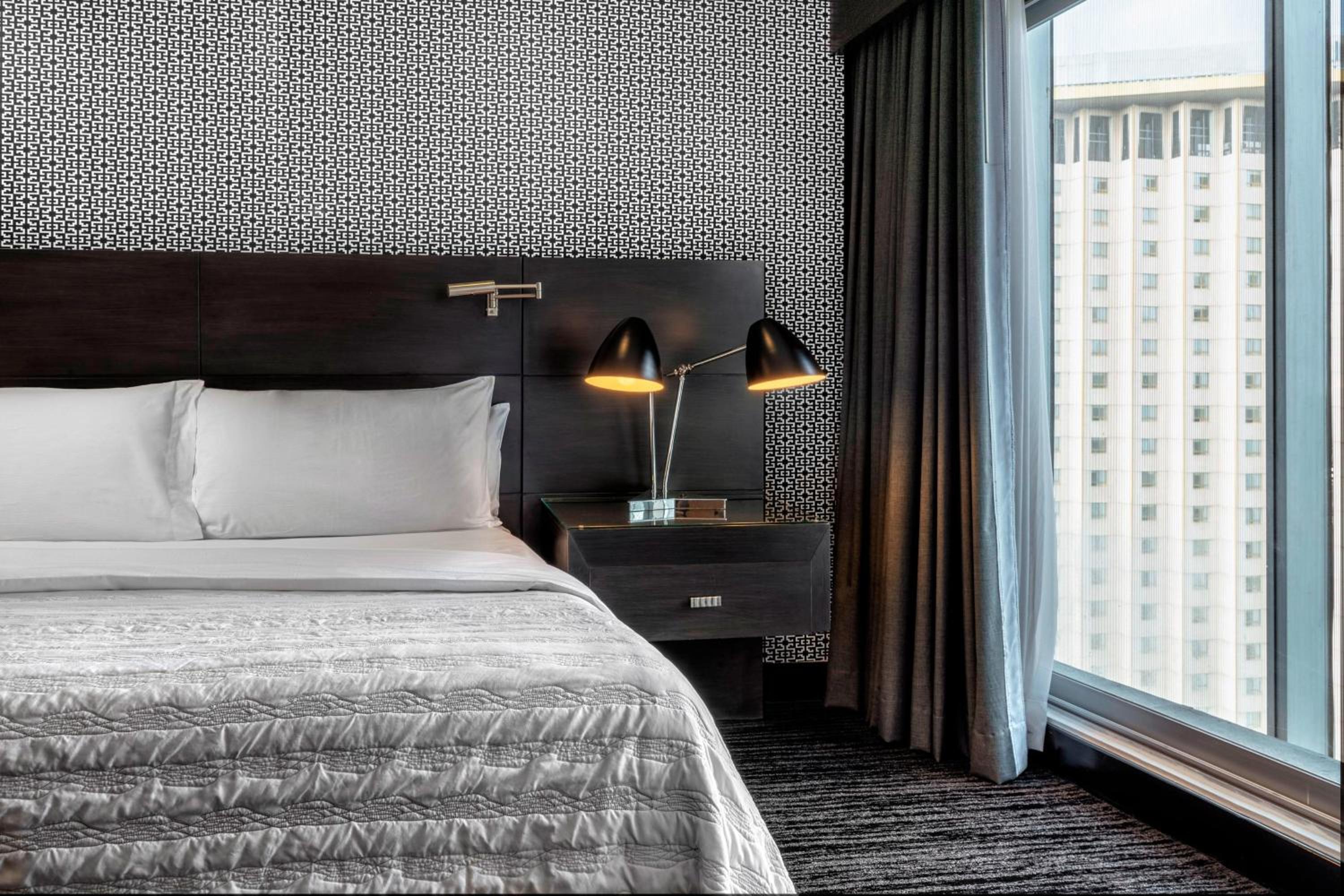 Indulge in modern decor, flat-screen TVs, and marble bathrooms in our suites overlooking the bustling cityscape.